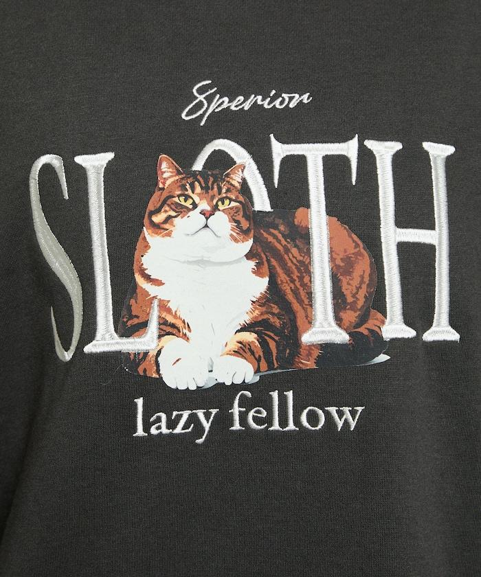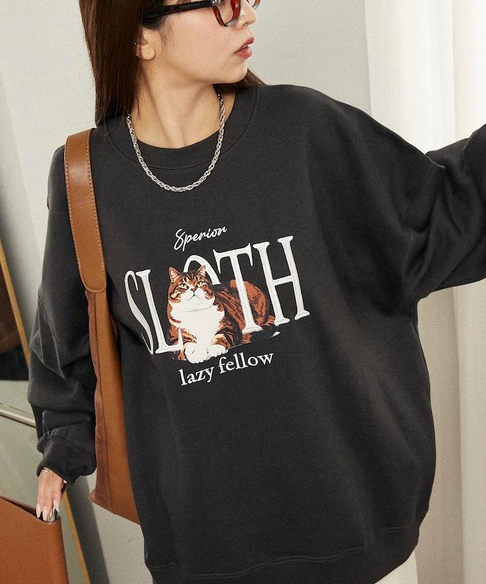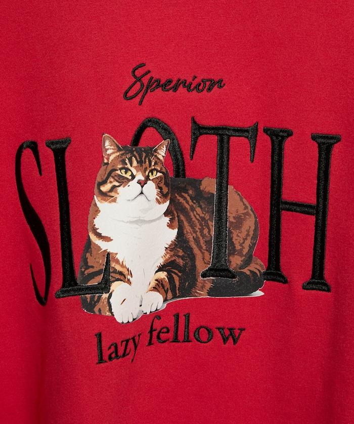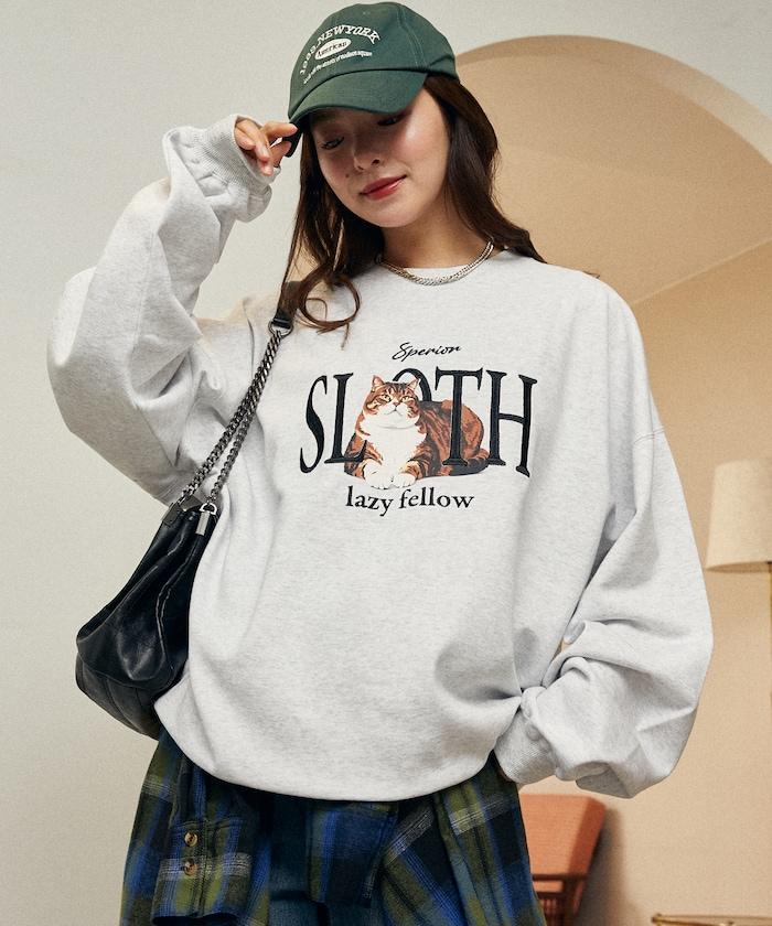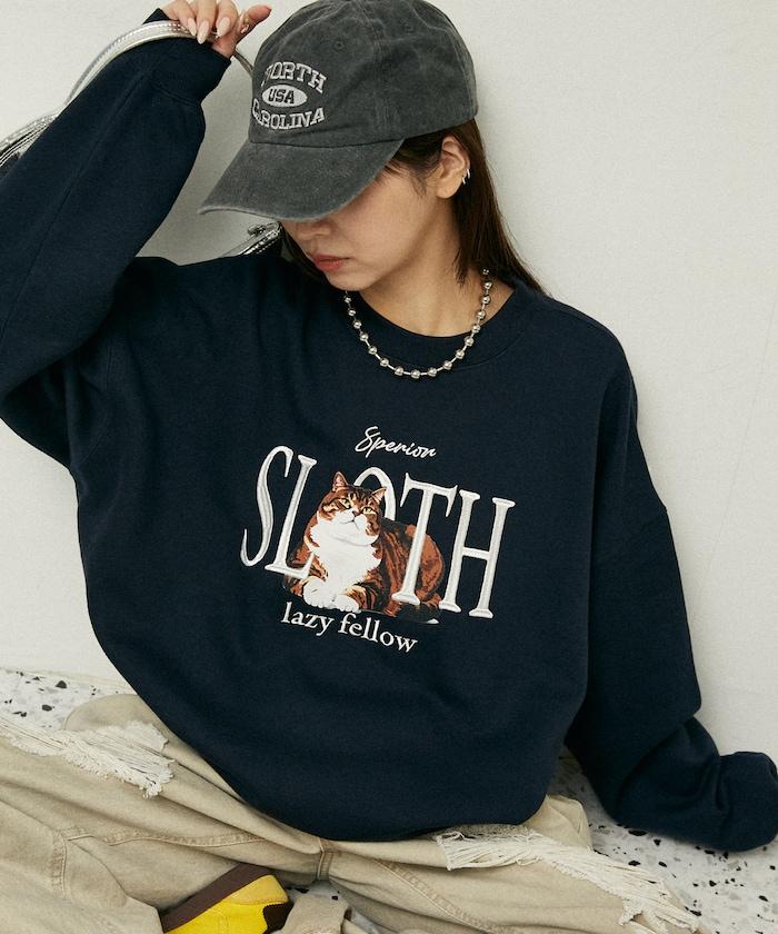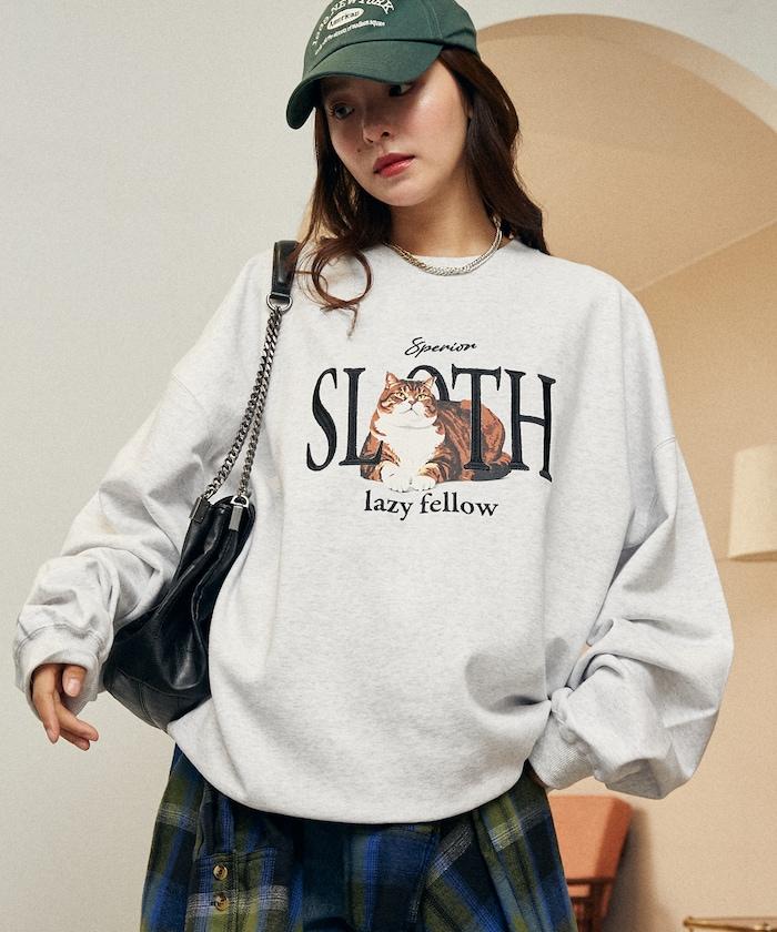 這款圓領運動衫的動物印花圖案是一隻嘟著嘴的可愛貓咪,胸前的英文字母刺繡則凸顯了它的出眾氣質。