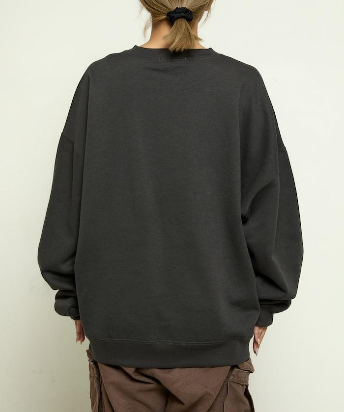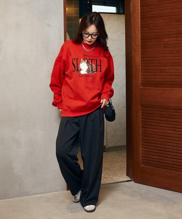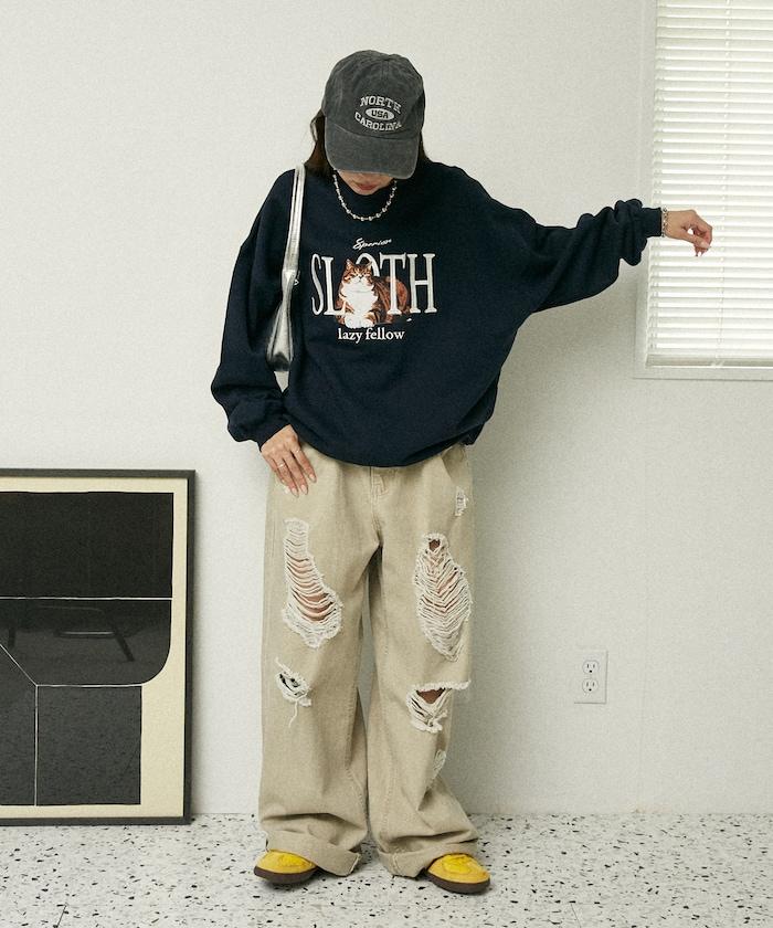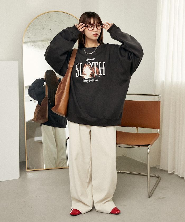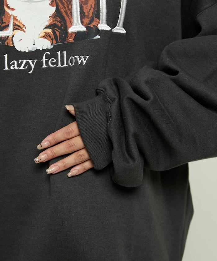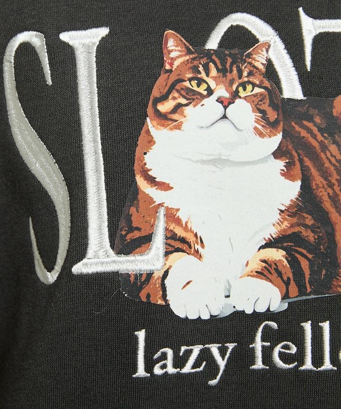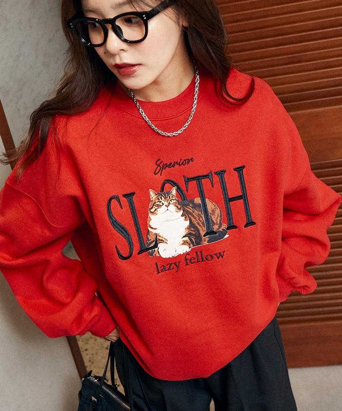 這款圓領運動衫的動物印花圖案是一隻嘟著嘴的可愛貓咪,胸前的英文字母刺繡則凸顯了它的出眾氣質。