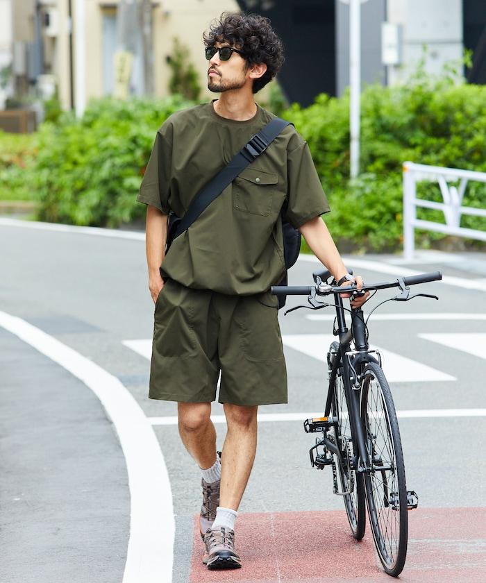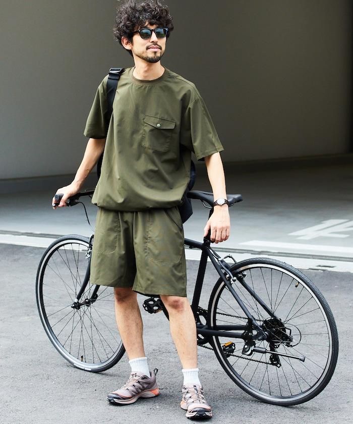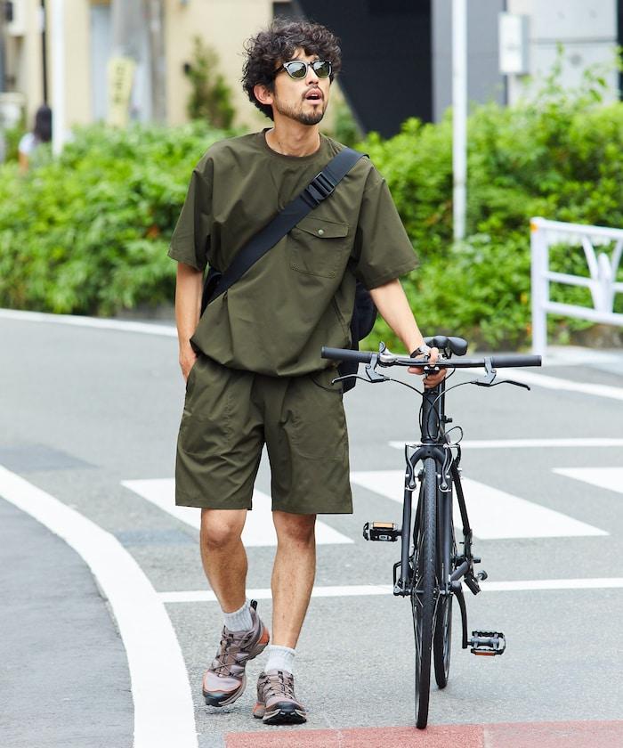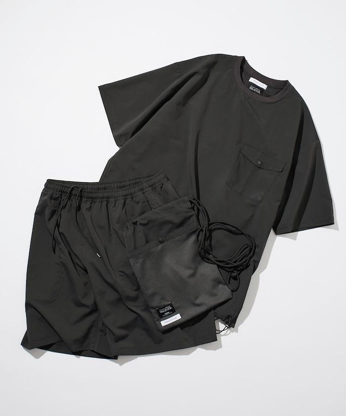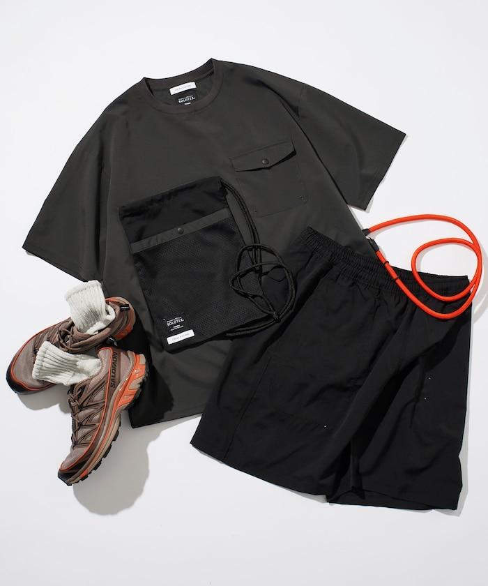 短褲不短,長度在膝蓋以上,圓領 T 恤可調整廓形,下襬處有鬆緊紡錘,上下均採用寬鬆廓形設計。