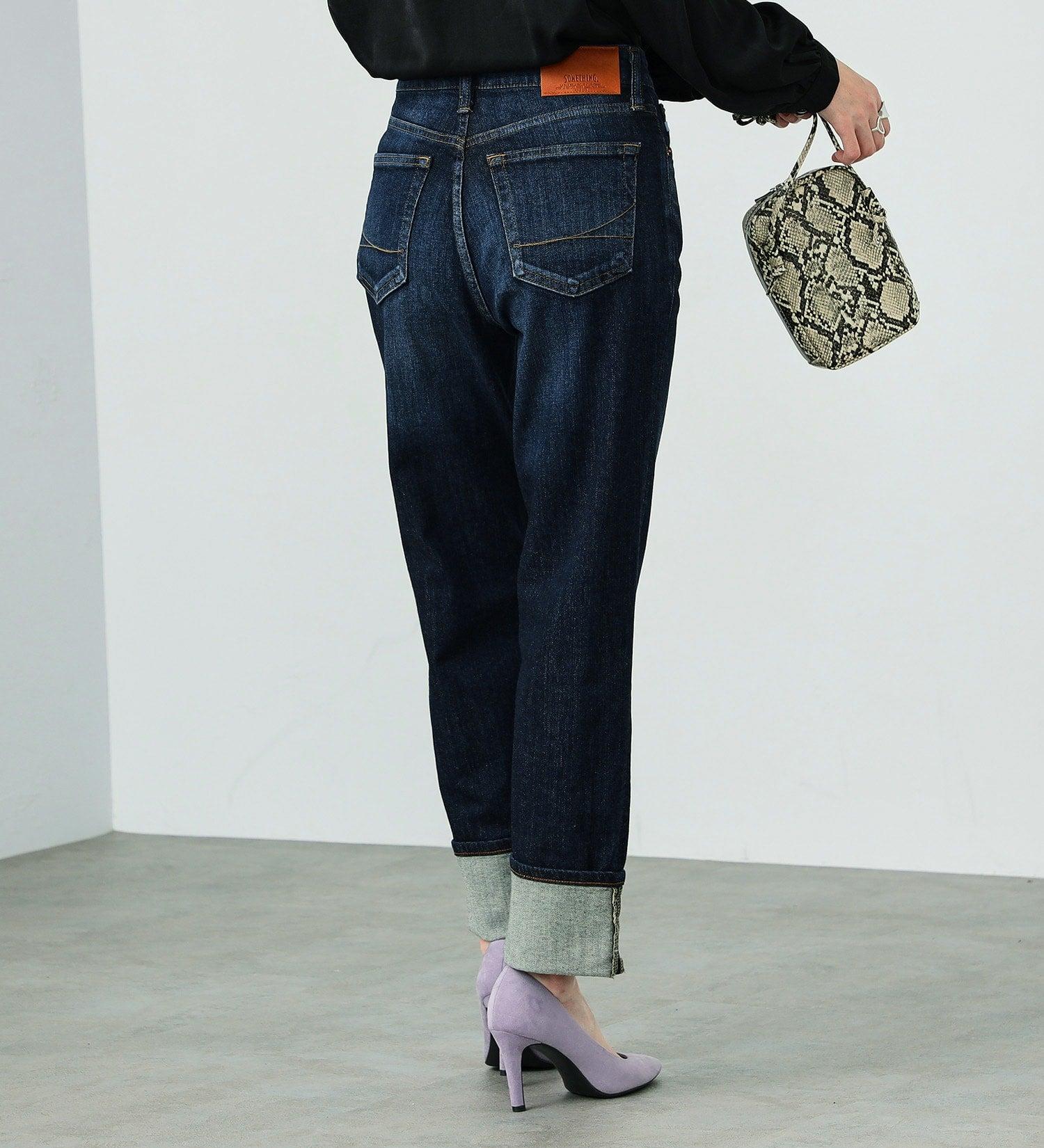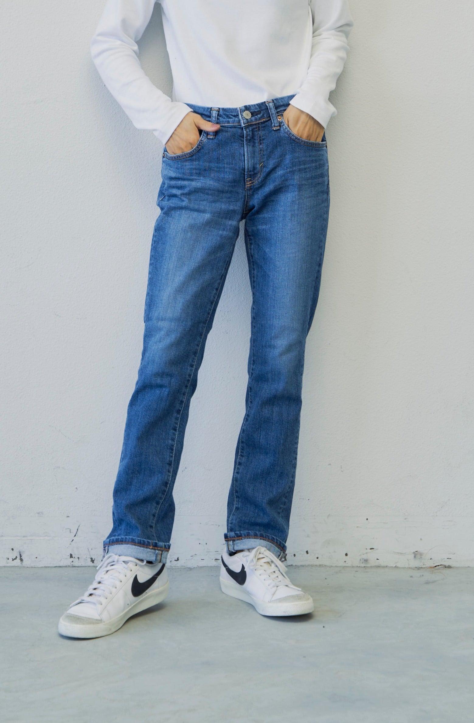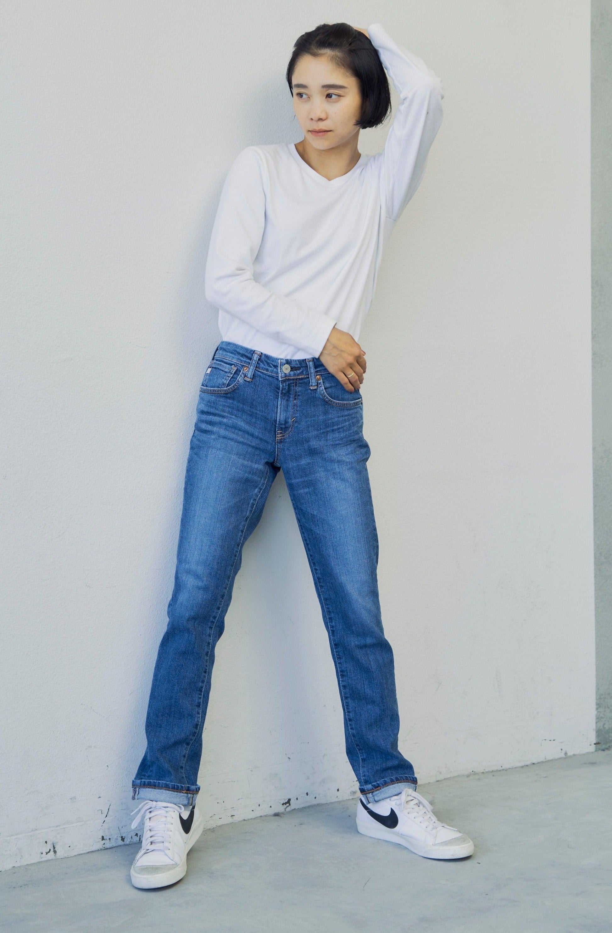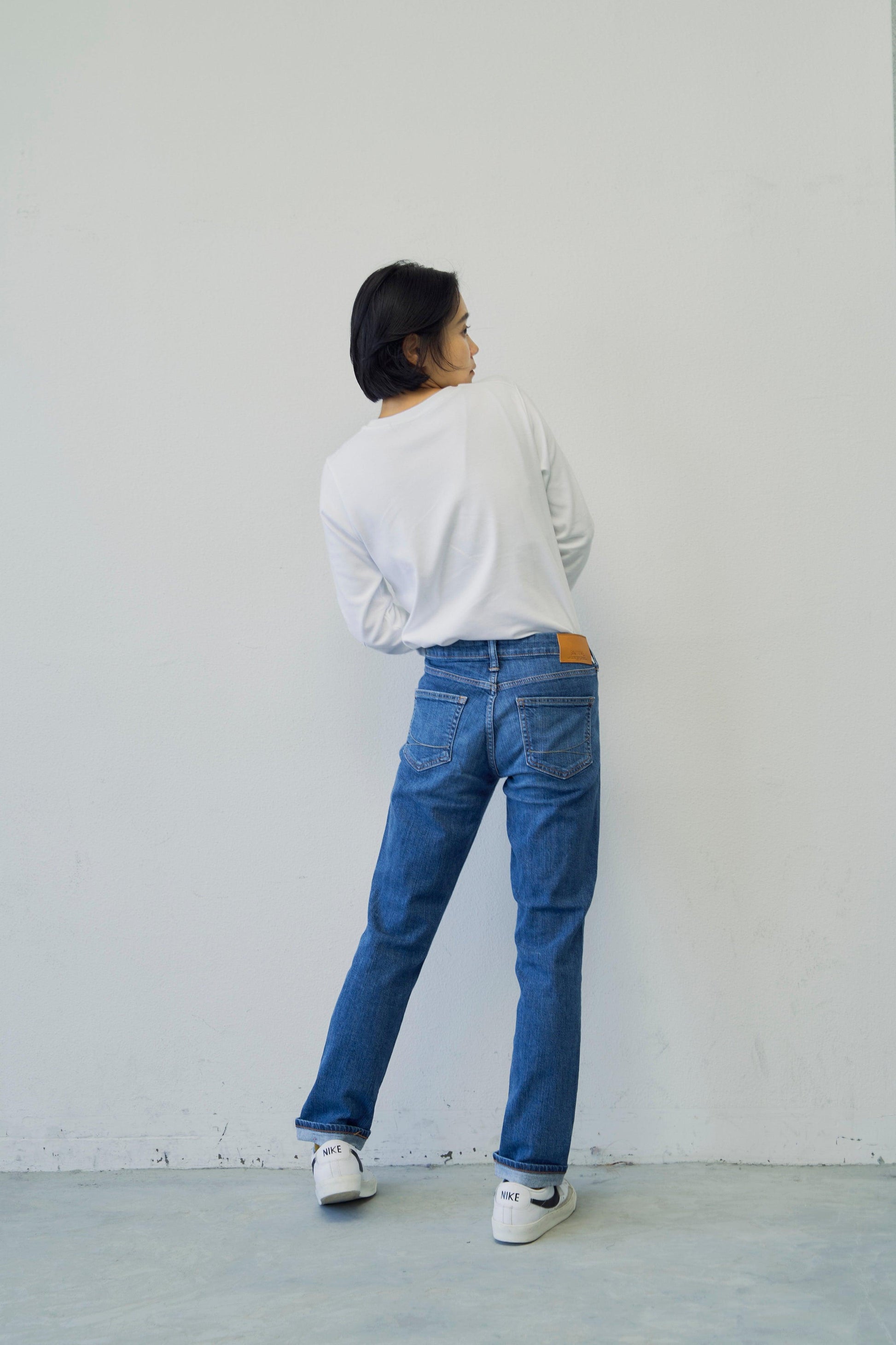 這款直筒牛仔褲充滿男人味,但仍保持了女性化的線條和流暢的版型。