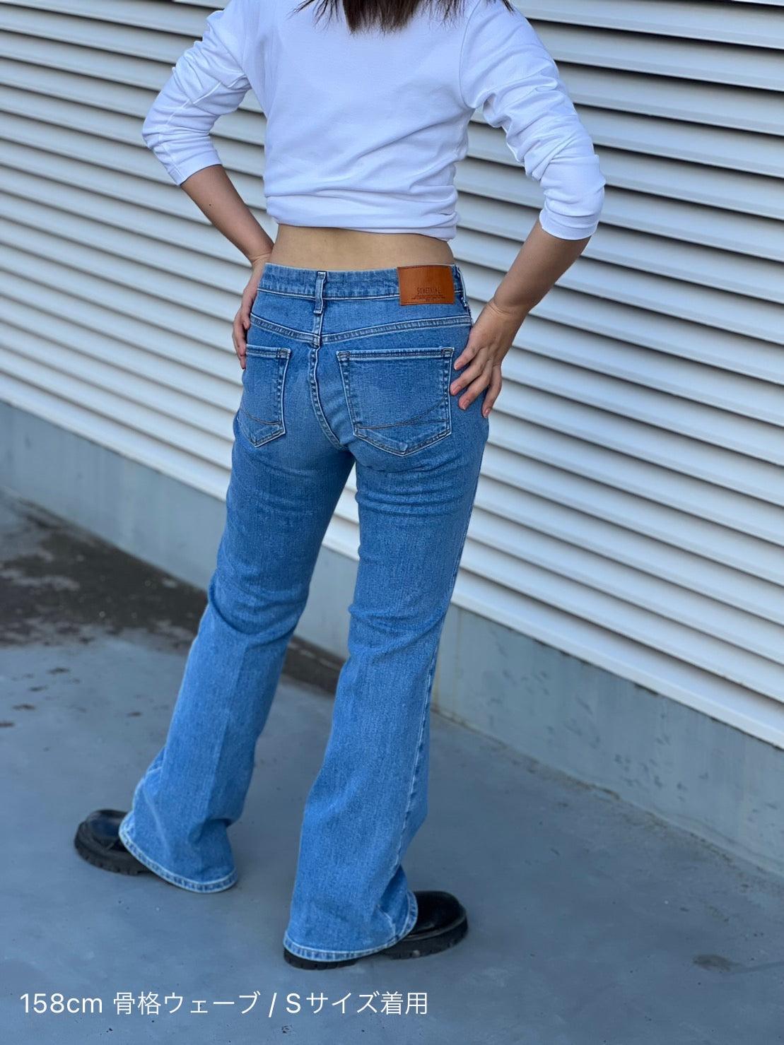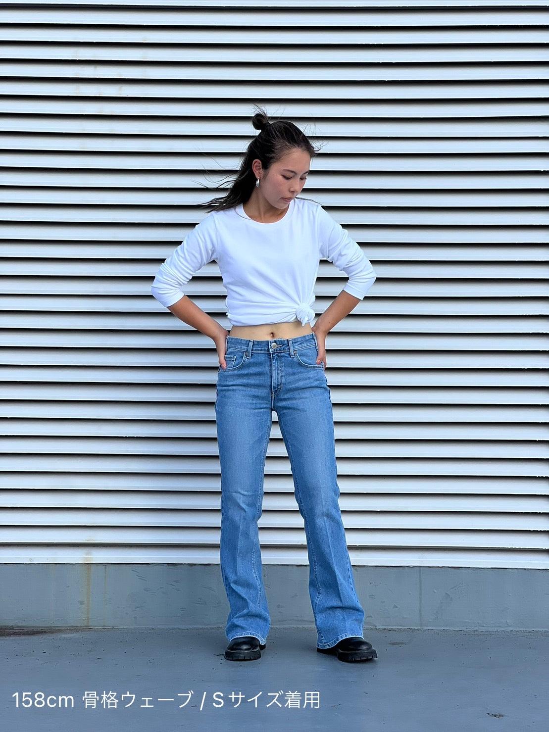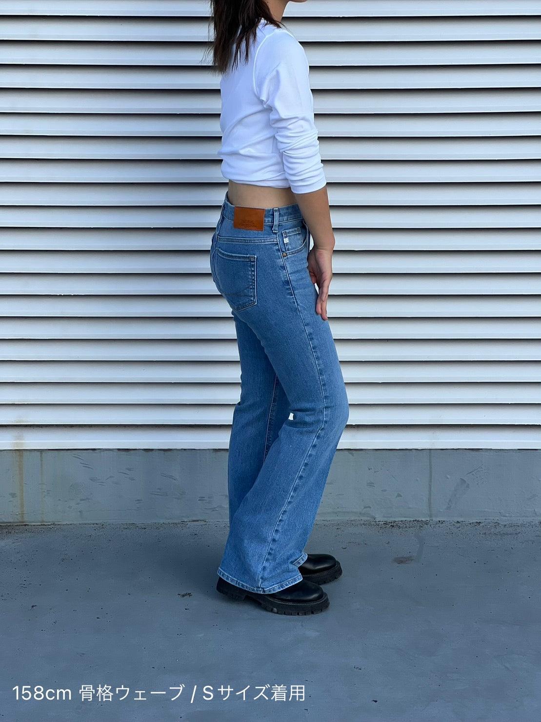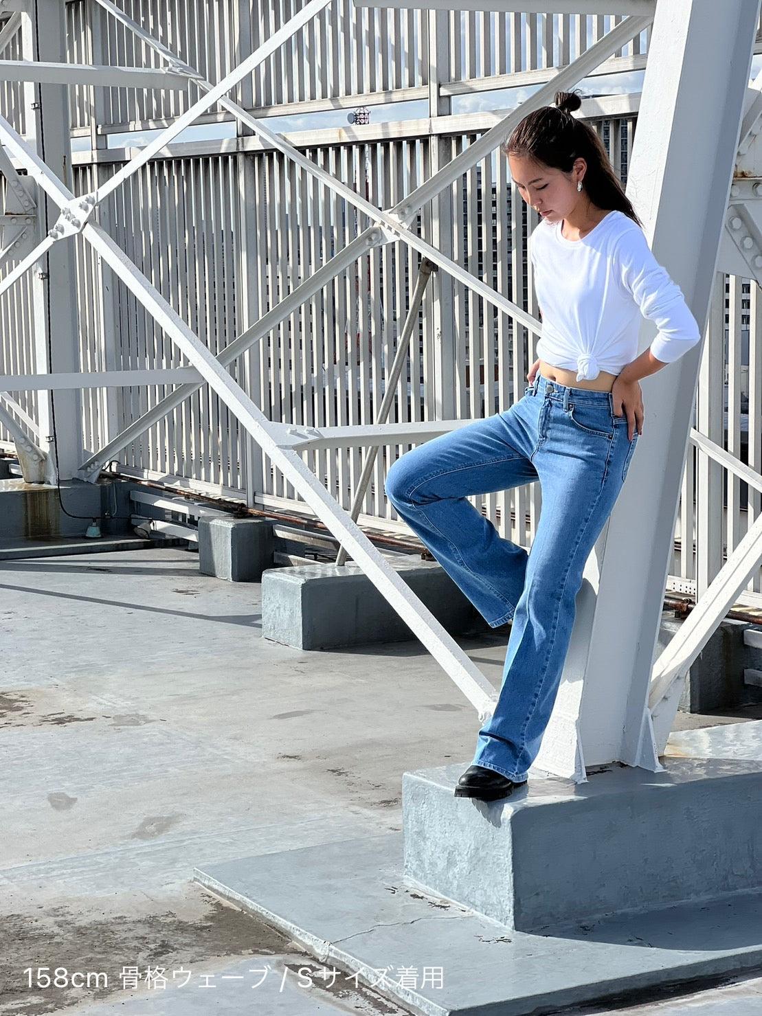 喇叭形牛仔布,膝蓋處具有高腿長效果。