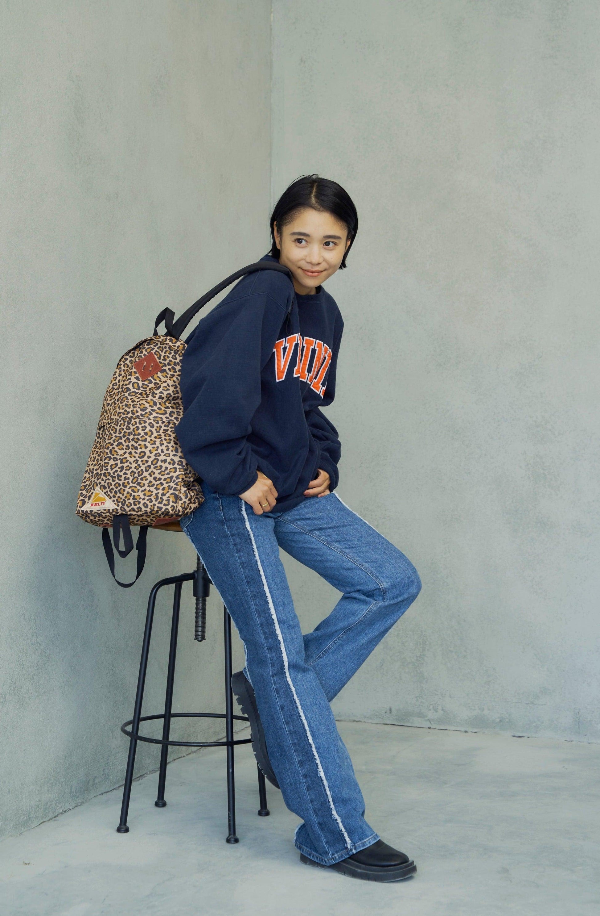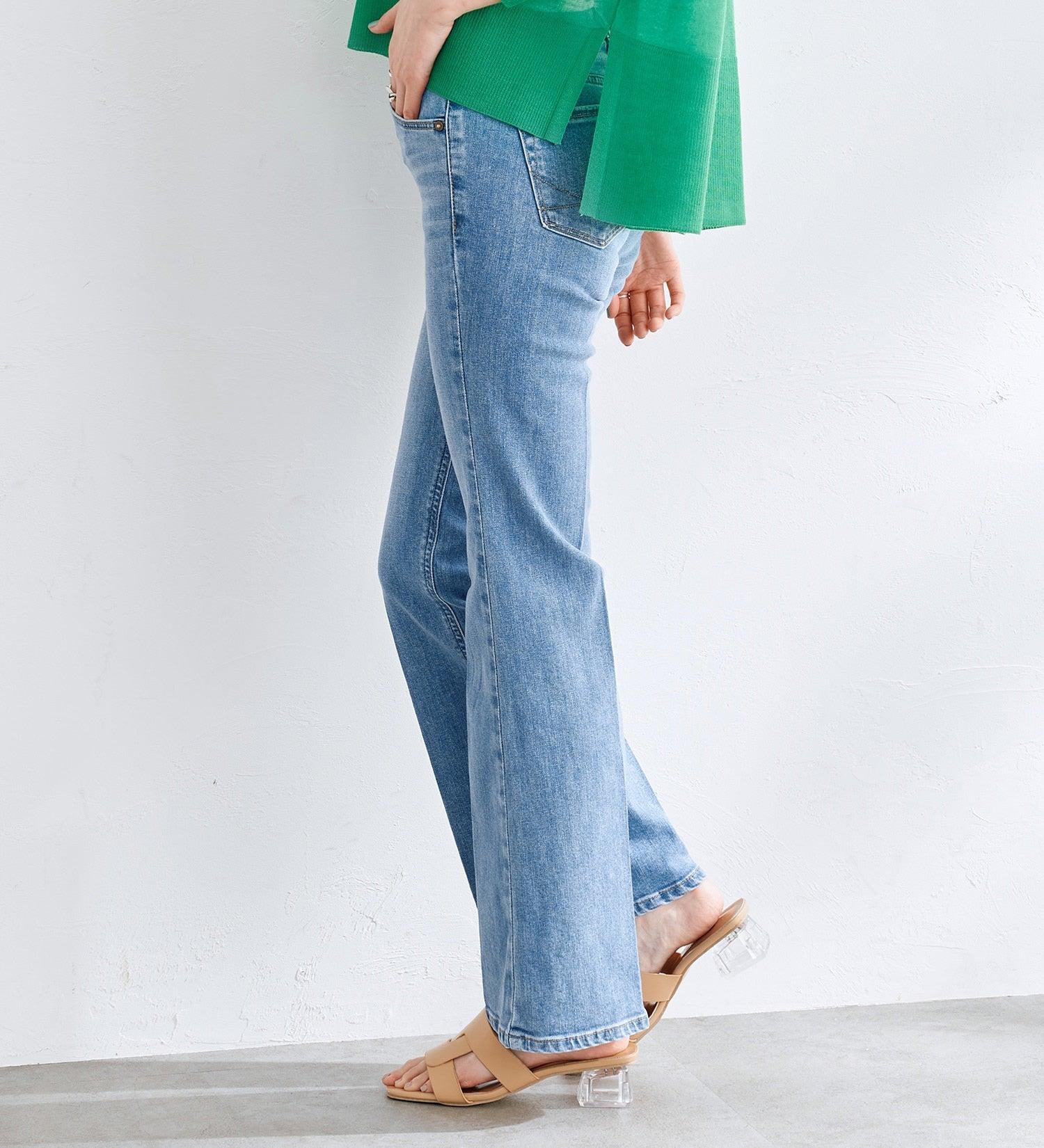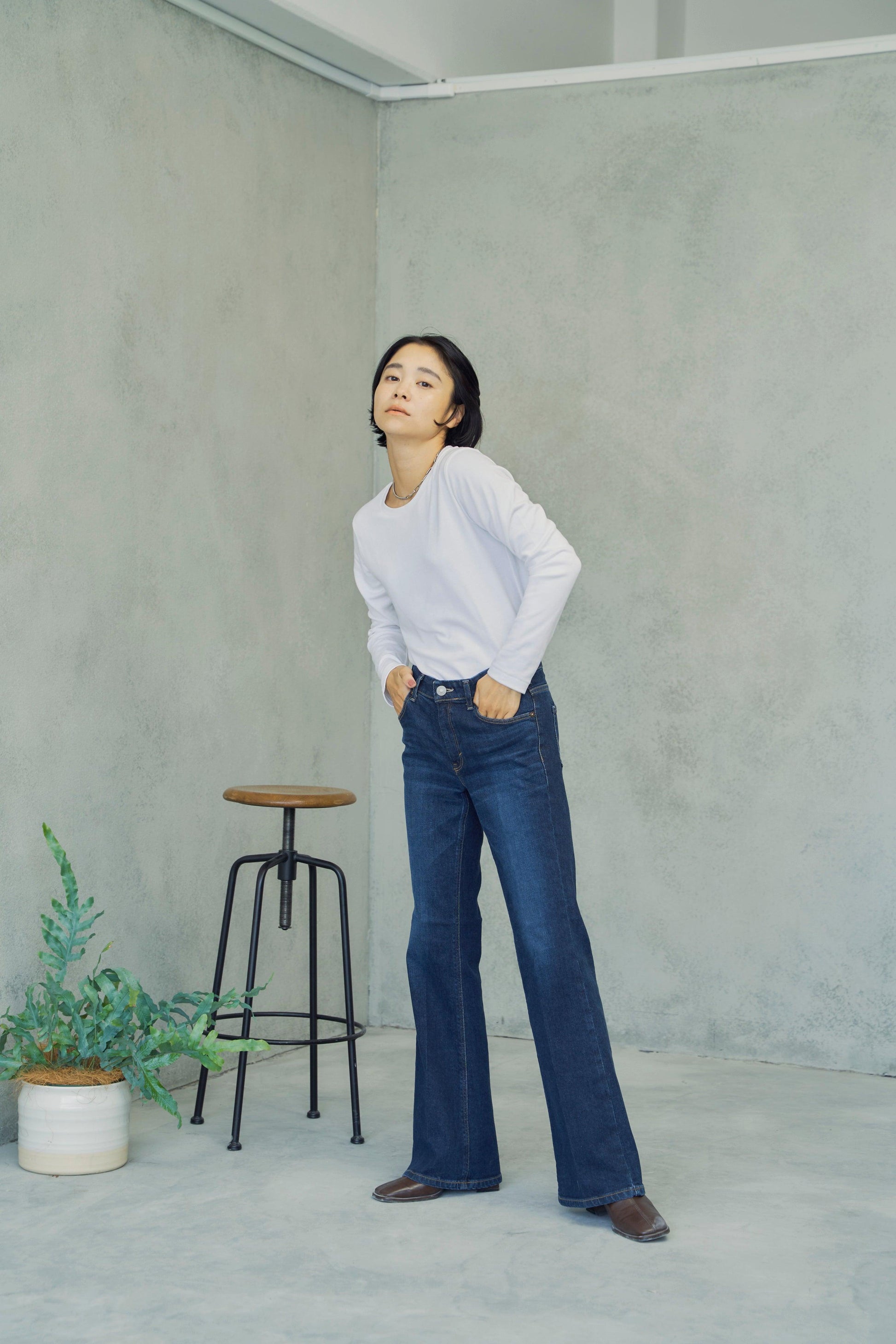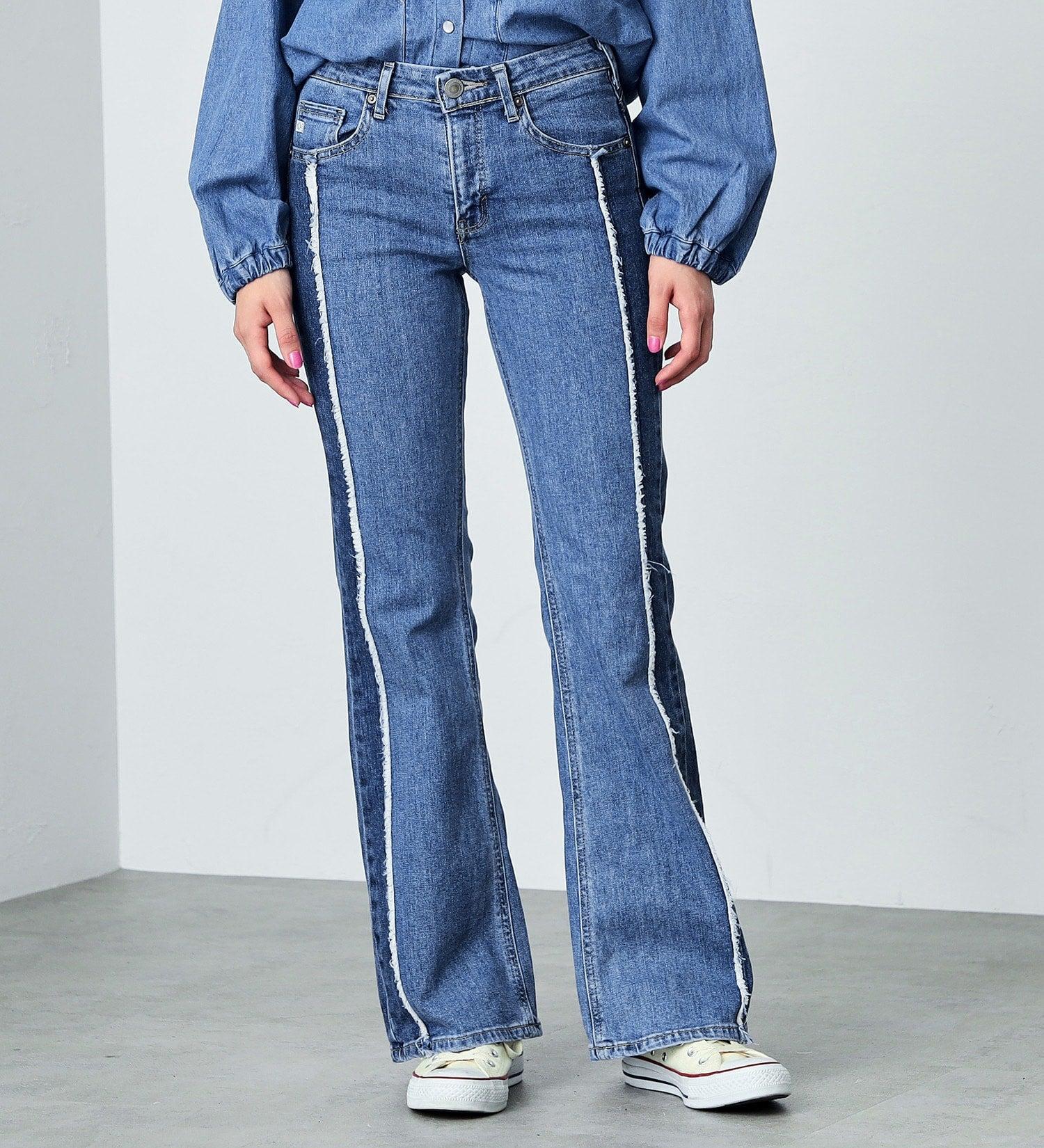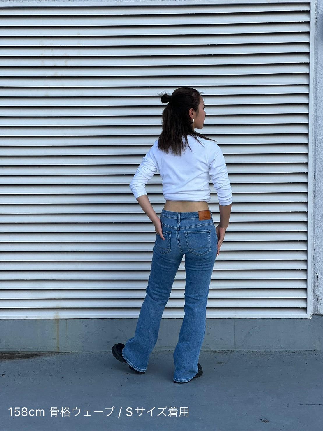 喇叭形牛仔布,膝蓋處具有高腿長效果。