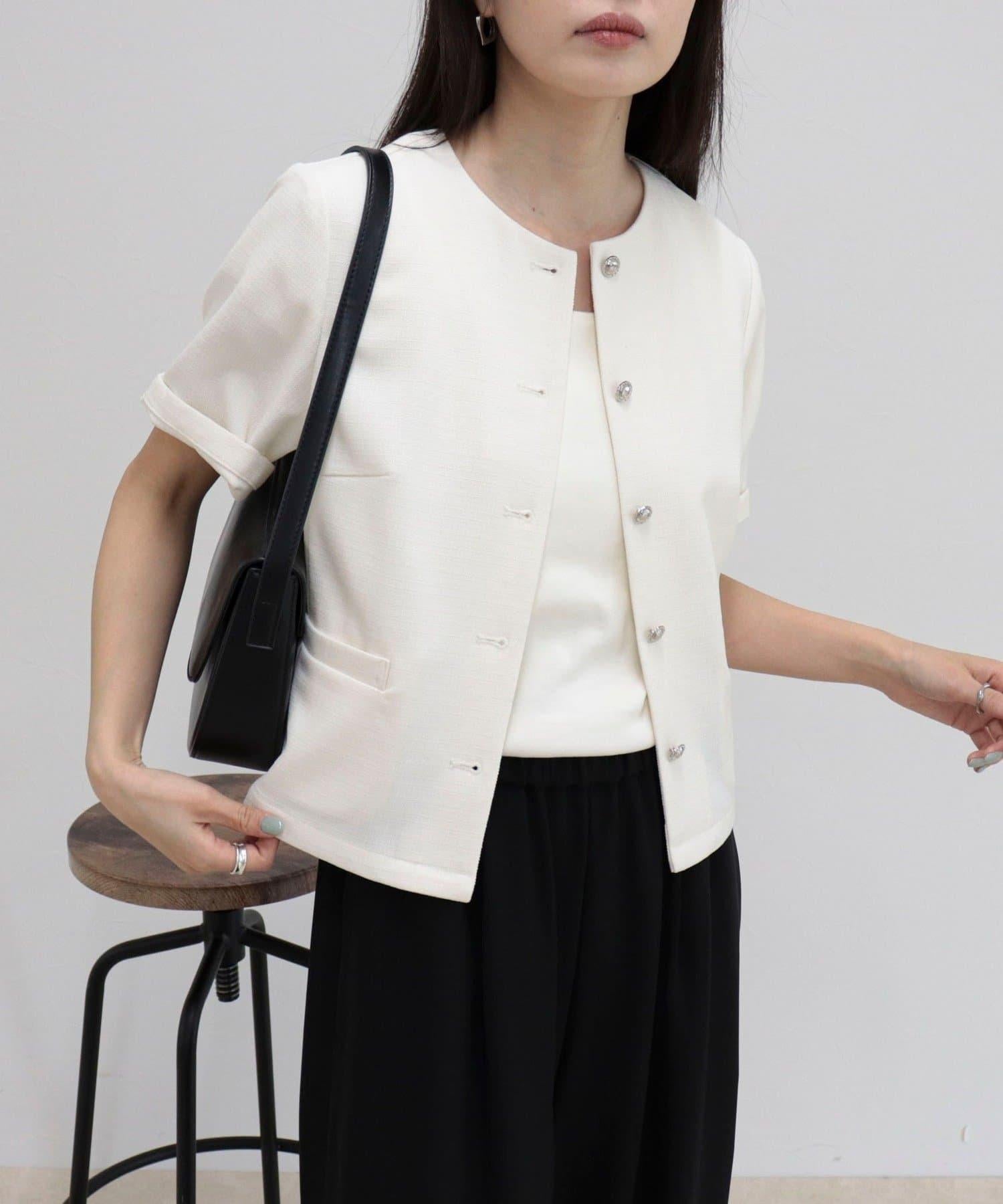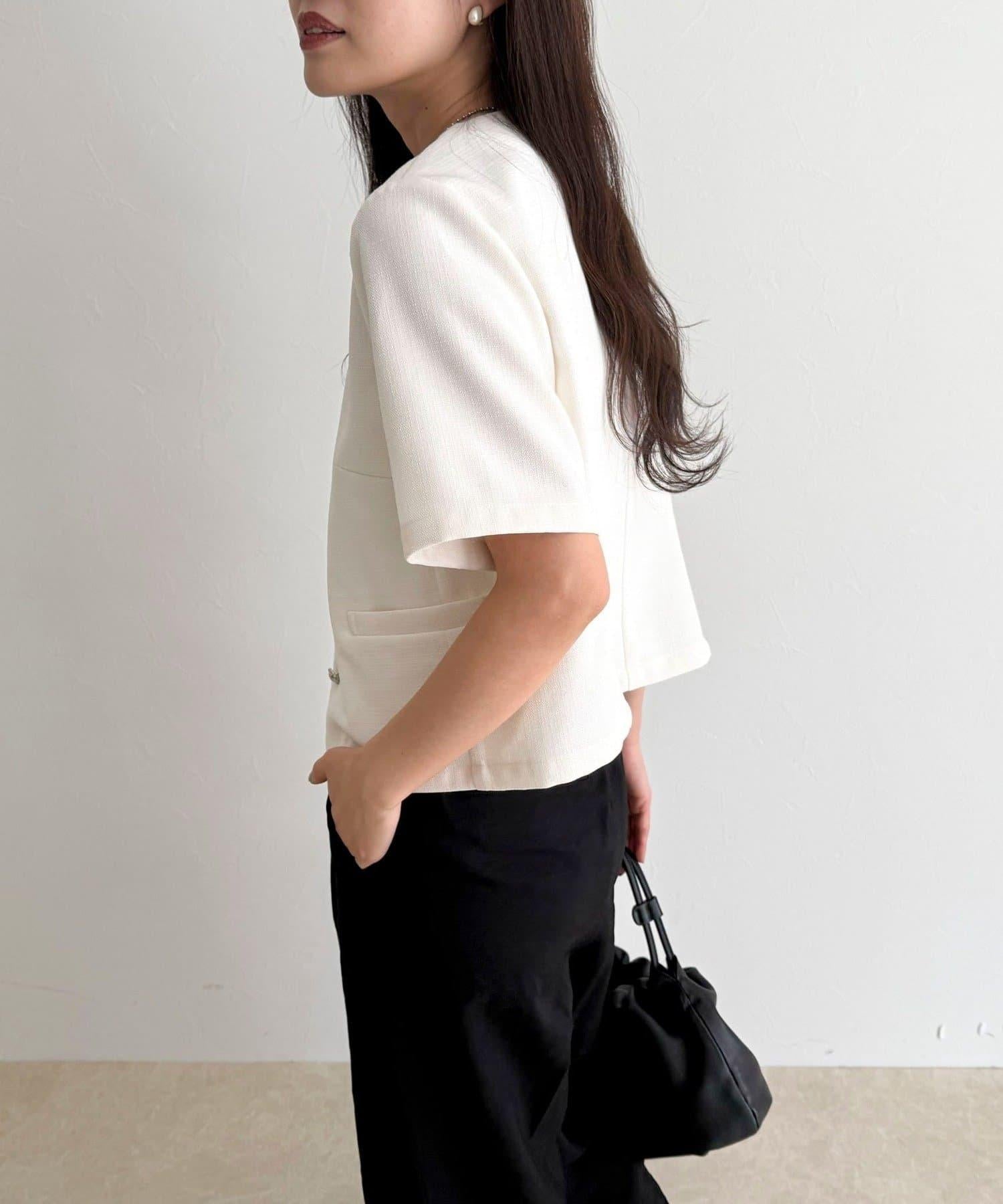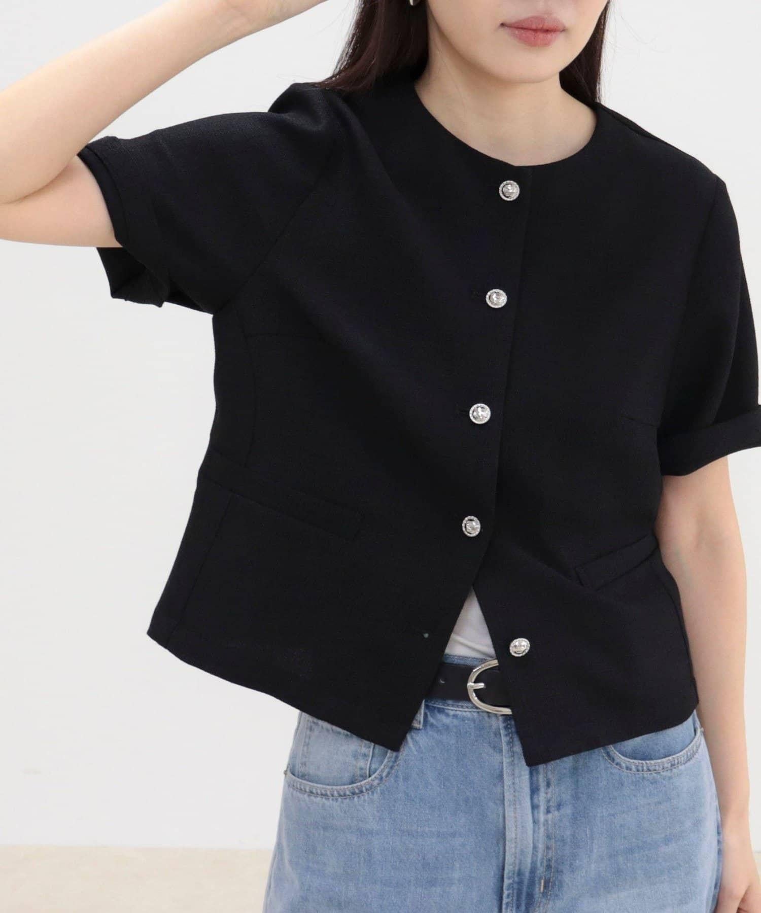 半袖夾克採用簡潔的無領設計,給人以優雅的印象。