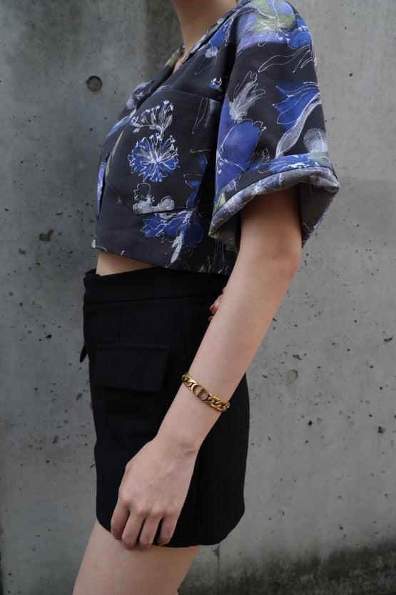 此圖案由 ESIÓ 原創。大膽的花卉圖案是以劍蘭花的形象繪製的,細膩的色彩彷彿是噴上去的,形成了對比鮮明的圖案。這款襯衫與打字機盒襯衫屬於同一類型。
