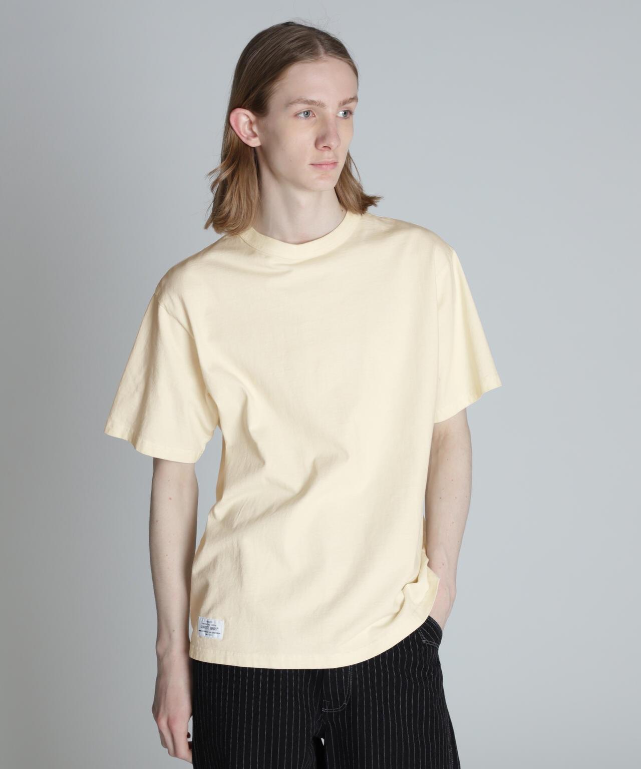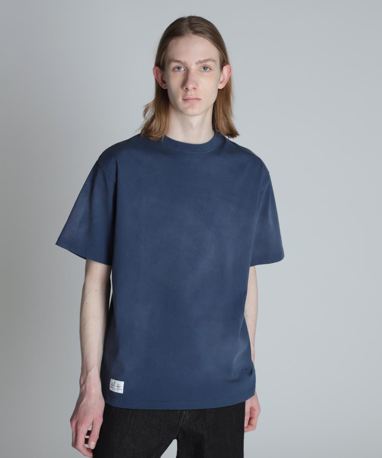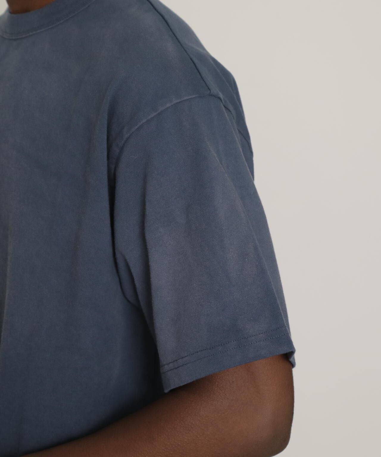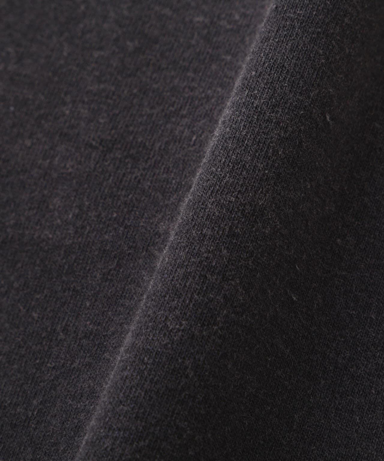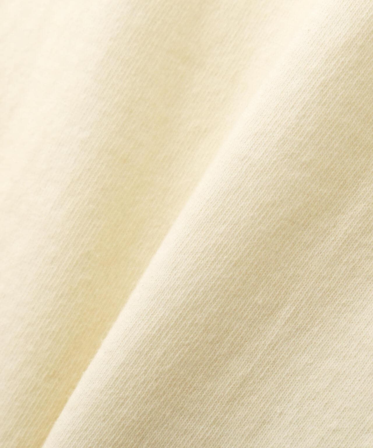 採用堅實厚實的 7 盎司紗體。硬、幹、粗糙的質地,加上只有開口紗才能帶來的蓬鬆、豐滿的手感,給人一種美國品牌的印象。採用捆綁式領口,縫製時將帶狀領口部分包裹在主體上。這樣的規格既能滿足大量使用,又不失厚實的衣身。運用品牌獨創的褪色處理,使其具有其他品牌所沒有的表現力。背面印有盾牌標誌,深色(黑色、藏青色)採用顏料印刷,印花乾淨利落。淺色則採用浸漬印花。通過對印花的關注,整體感覺和質感得到了提升。