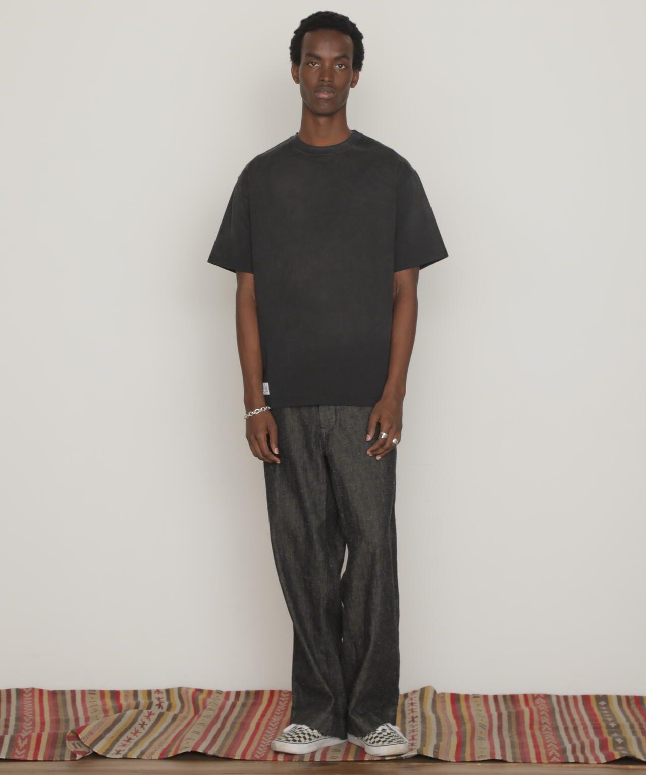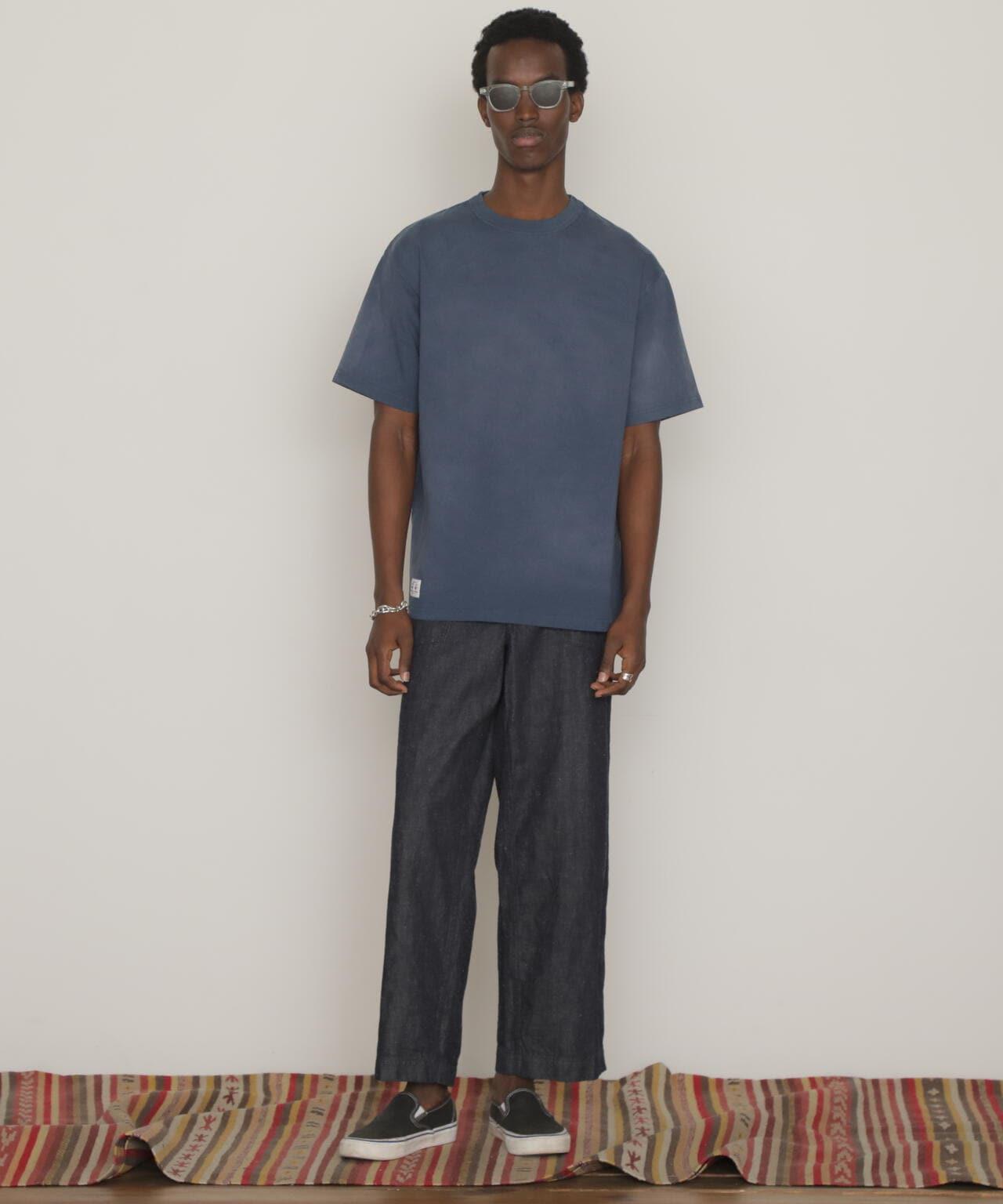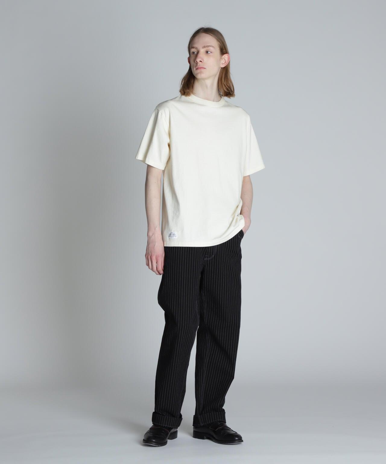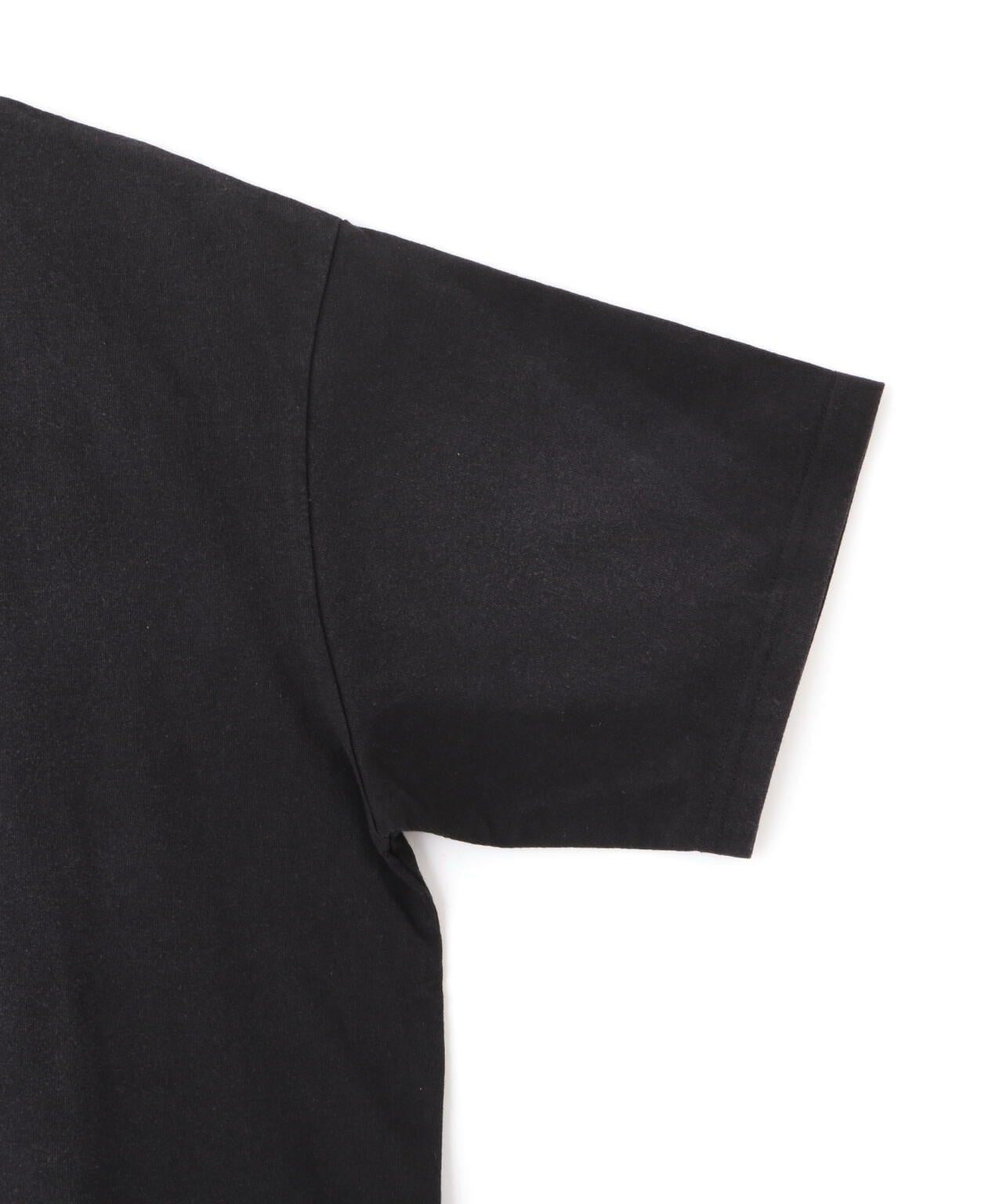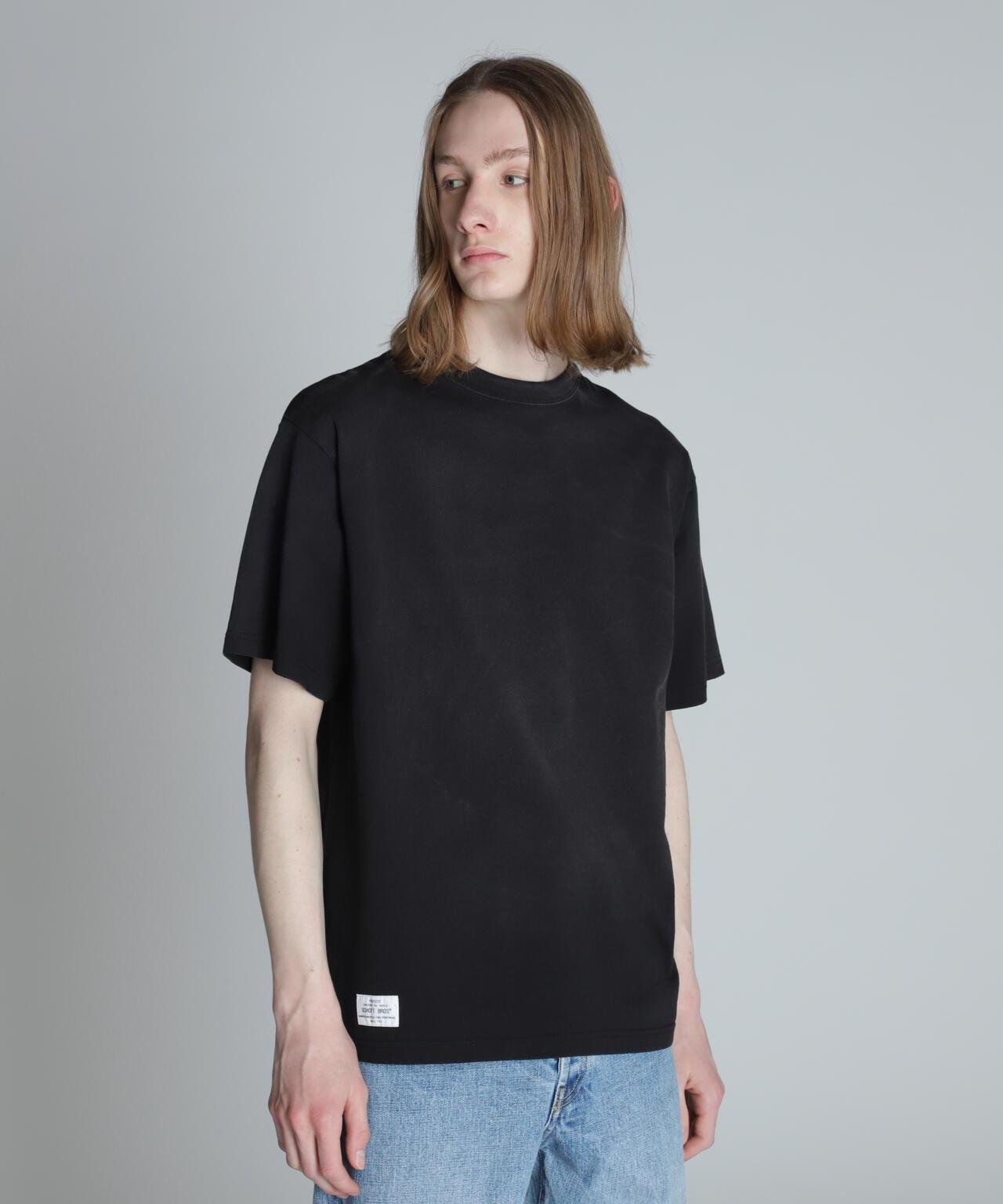 採用堅實厚實的 7 盎司紗體。硬、幹、粗糙的質地,加上只有開口紗才能帶來的蓬鬆、豐滿的手感,給人一種美國品牌的印象。採用捆綁式領口,縫製時將帶狀領口部分包裹在主體上。這樣的規格既能滿足大量使用,又不失厚實的衣身。運用品牌獨創的褪色處理,使其具有其他品牌所沒有的表現力。背面印有盾牌標誌,深色(黑色、藏青色)採用顏料印刷,印花乾淨利落。淺色則採用浸漬印花。通過對印花的關注,整體感覺和質感得到了提升。