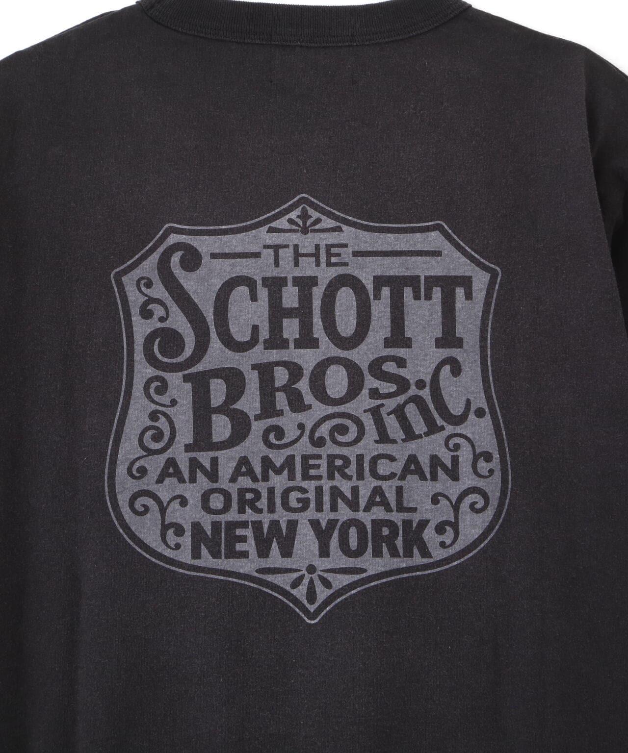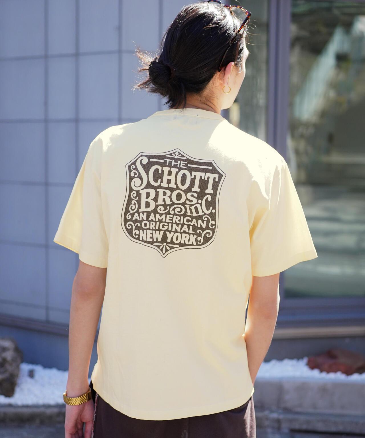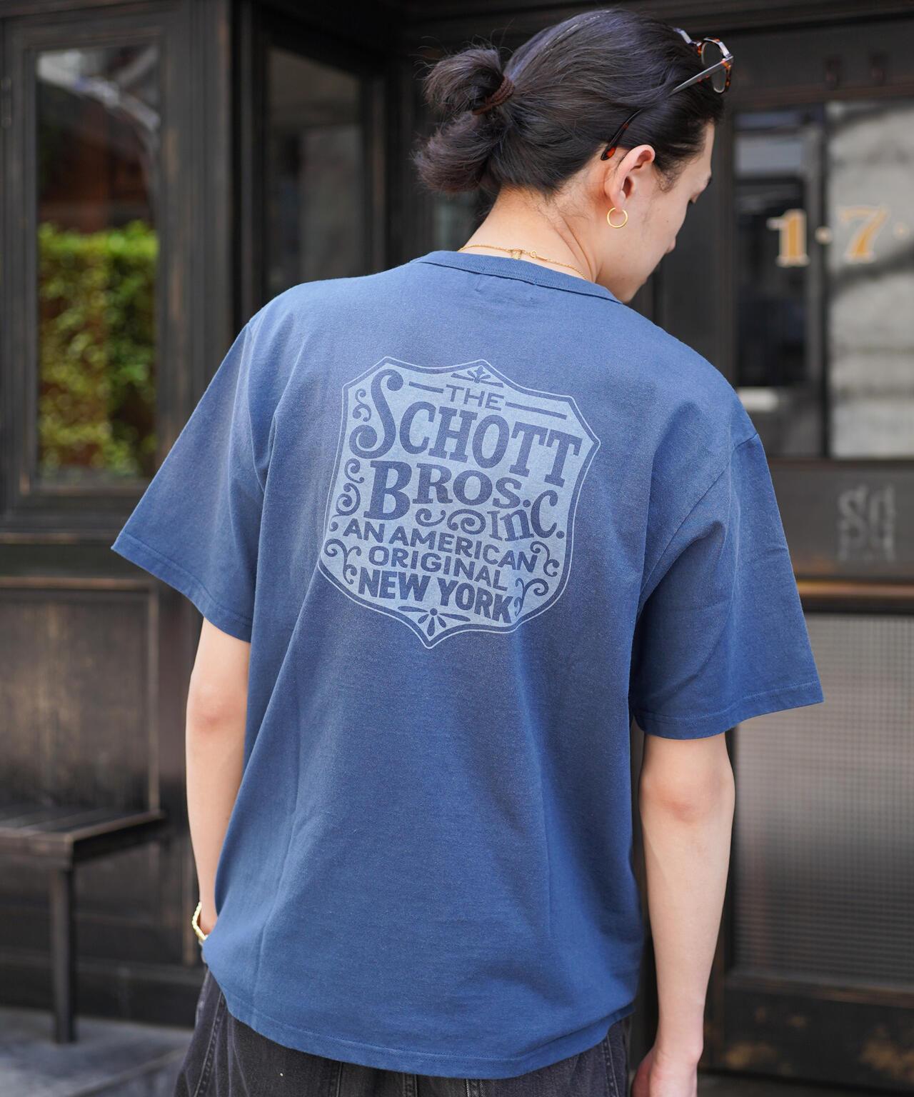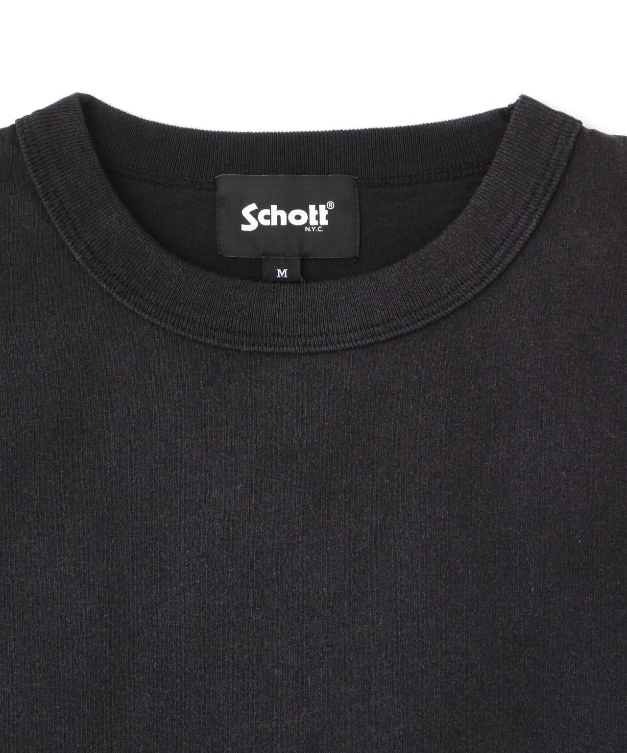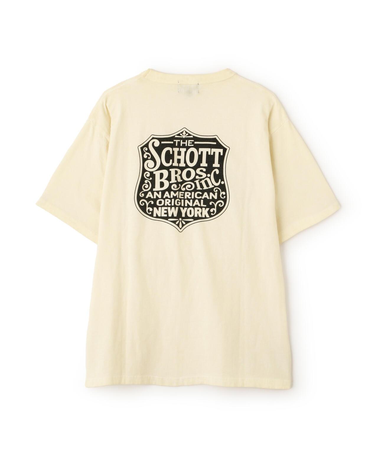 採用堅實厚實的 7 盎司紗體。硬、幹、粗糙的質地,加上只有開口紗才能帶來的蓬鬆、豐滿的手感,給人一種美國品牌的印象。採用捆綁式領口,縫製時將帶狀領口部分包裹在主體上。這樣的規格既能滿足大量使用,又不失厚實的衣身。運用品牌獨創的褪色處理,使其具有其他品牌所沒有的表現力。背面印有盾牌標誌,深色(黑色、藏青色)採用顏料印刷,印花乾淨利落。淺色則採用浸漬印花。通過對印花的關注,整體感覺和質感得到了提升。