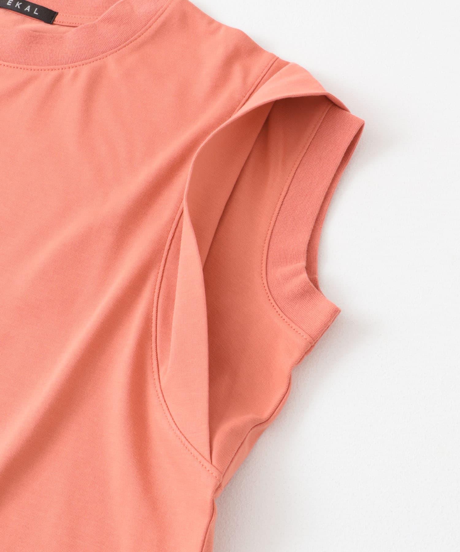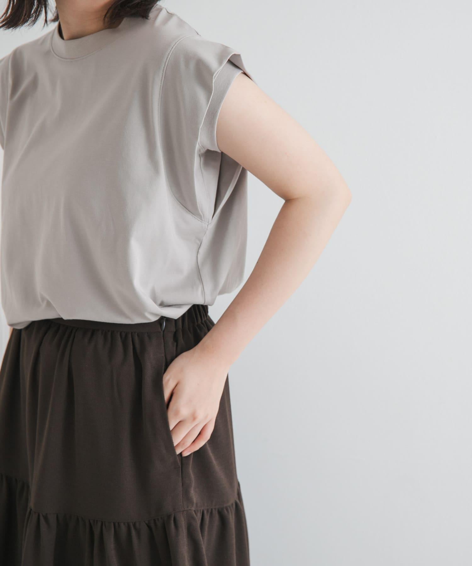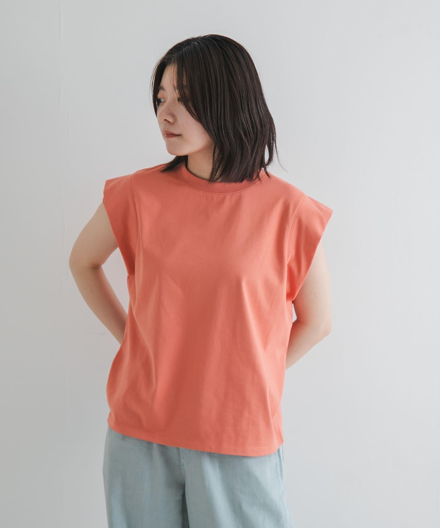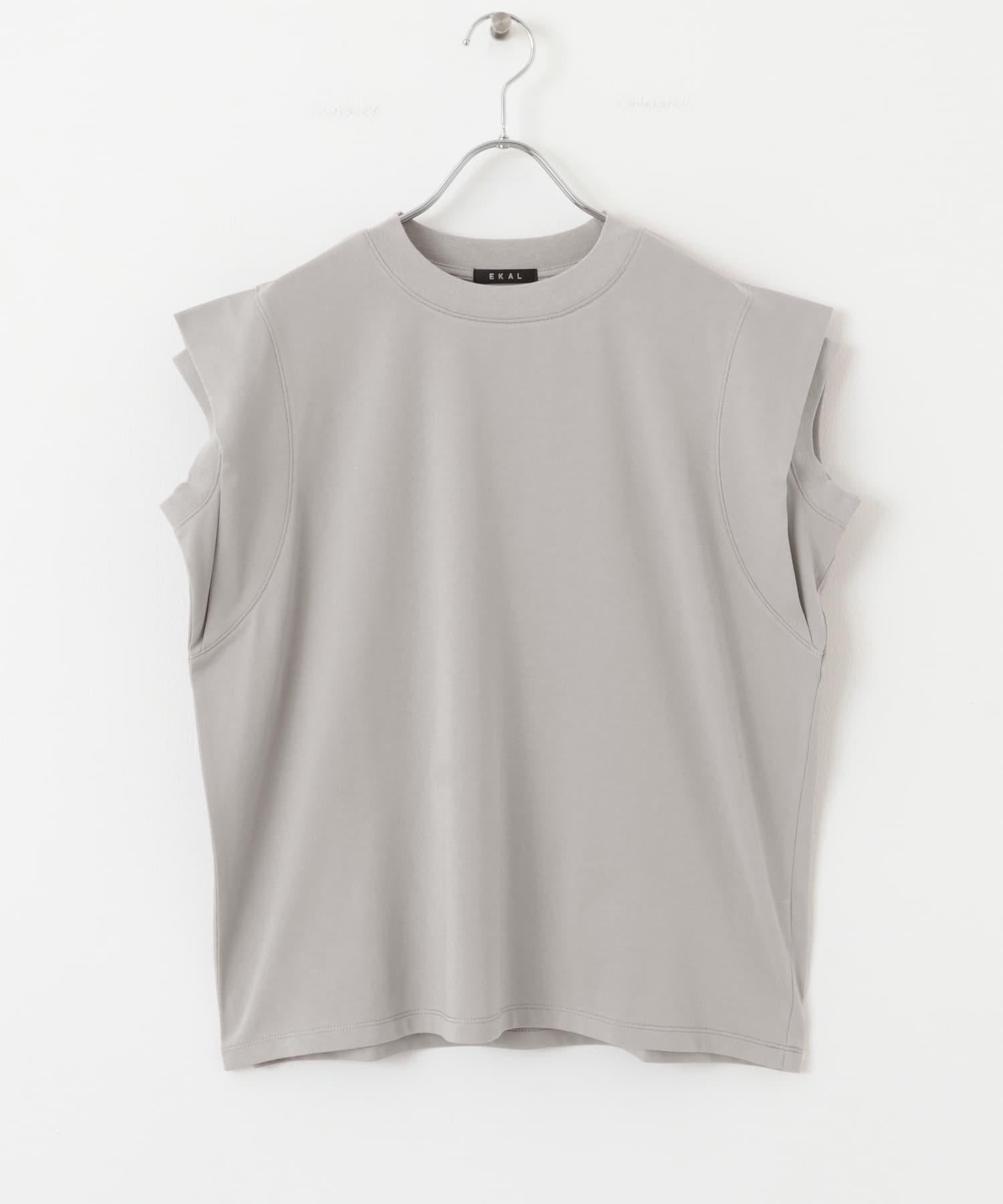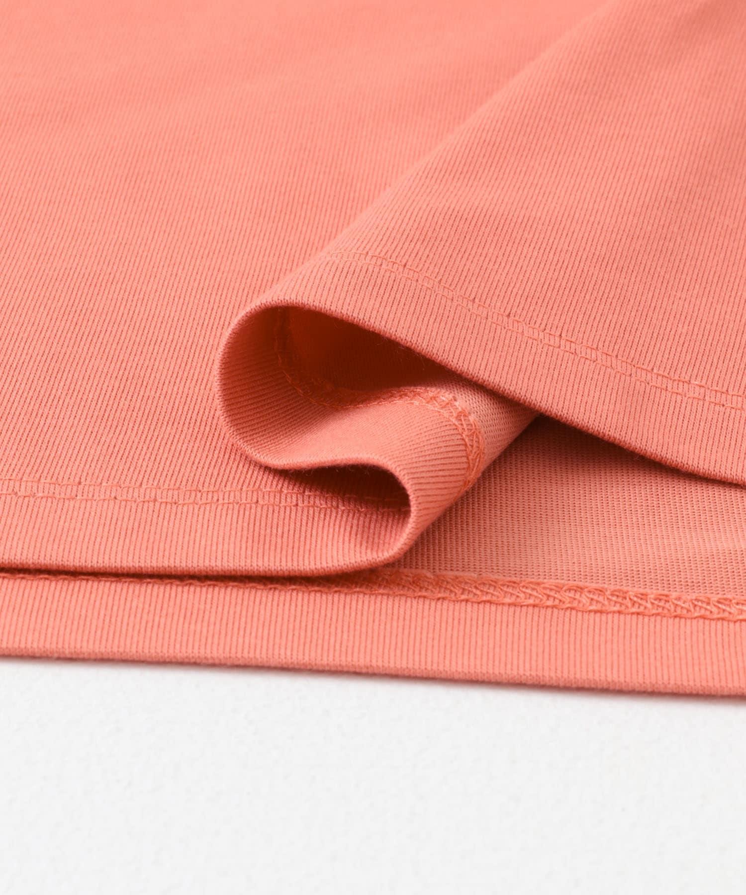 正面由 30s 緊密棉製成,反面由 20s 鍍層針織布和 75d 功能性 Pe 紗製成。正面使用的棉紗是緊密紡紗,這意味著表面的絨毛更少,外觀更整潔,還能減少起球。通過在法式袖子上添加荷葉邊,實現了方正的輪廓,同時減少了垂墜感,是一款不會對手臂造成困擾的設計。這種剪裁和縫製方式,單穿時搭配任何下裝都很好看。