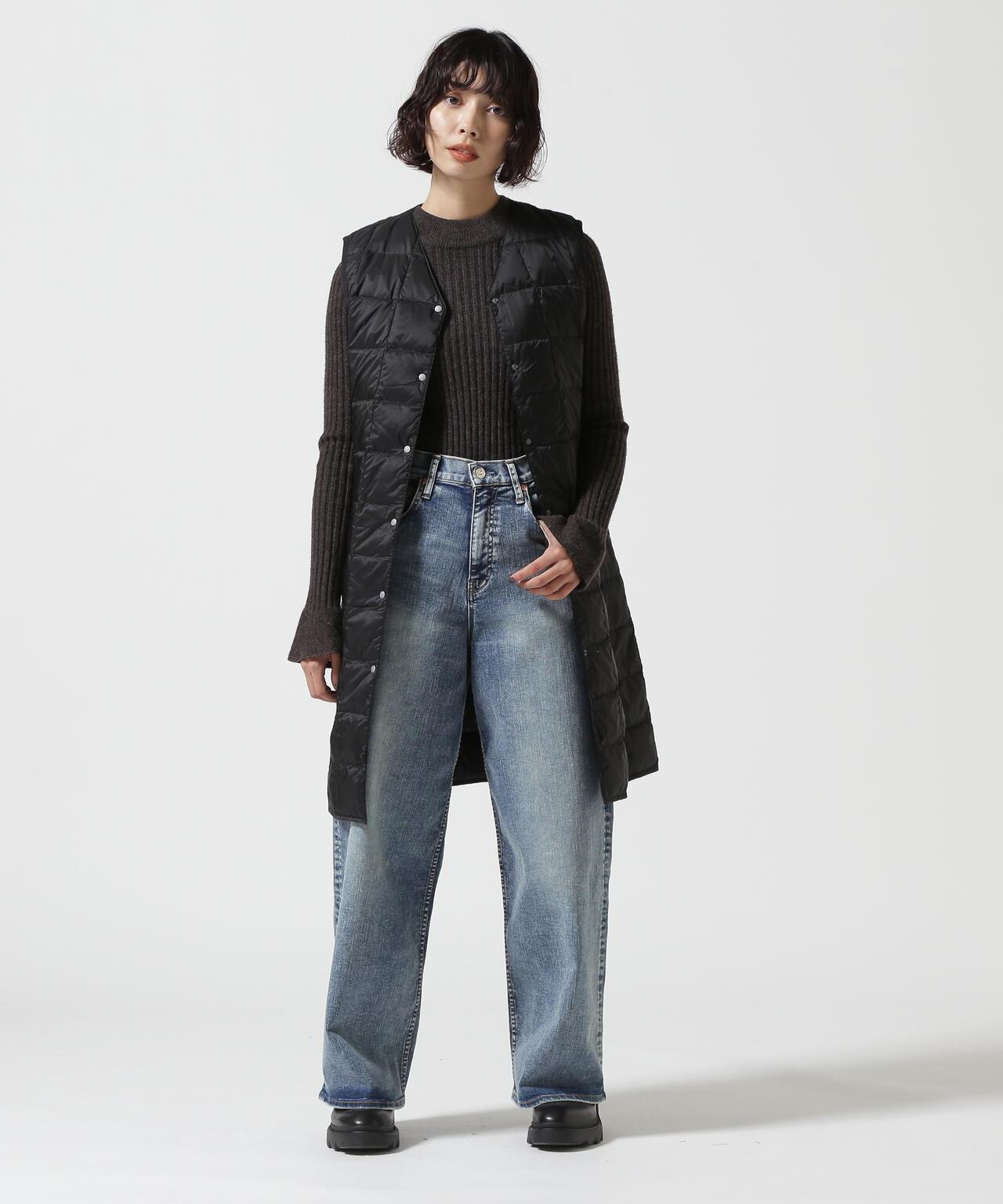 TAION "一款適合搭配大衣的女士長款羽絨馬甲",長款羽絨馬甲採用略微修身的剪裁,穿著整潔而不臃腫。它設計簡潔,輕便、保暖、易穿,可輕鬆套在剪裁縫製的襯衫和針織衫等外面。將它穿在心愛的大衣裡面,還能拓展穿著場景,是一款非常受歡迎的單品。前面板採用 YKK 平面織物。前幅使用 YKK Prancer 紐扣。兩側有拉鍊口袋。腋下有彈力滾邊,防止風進入。