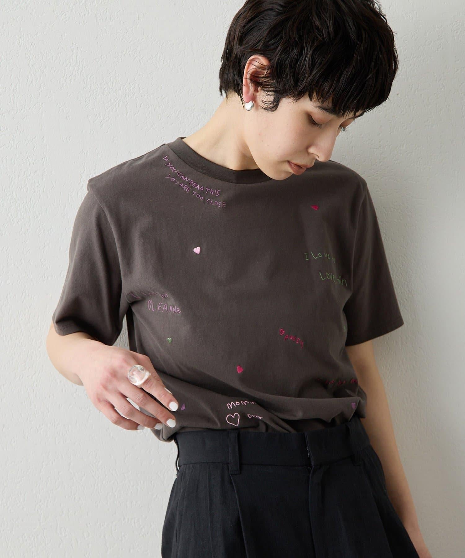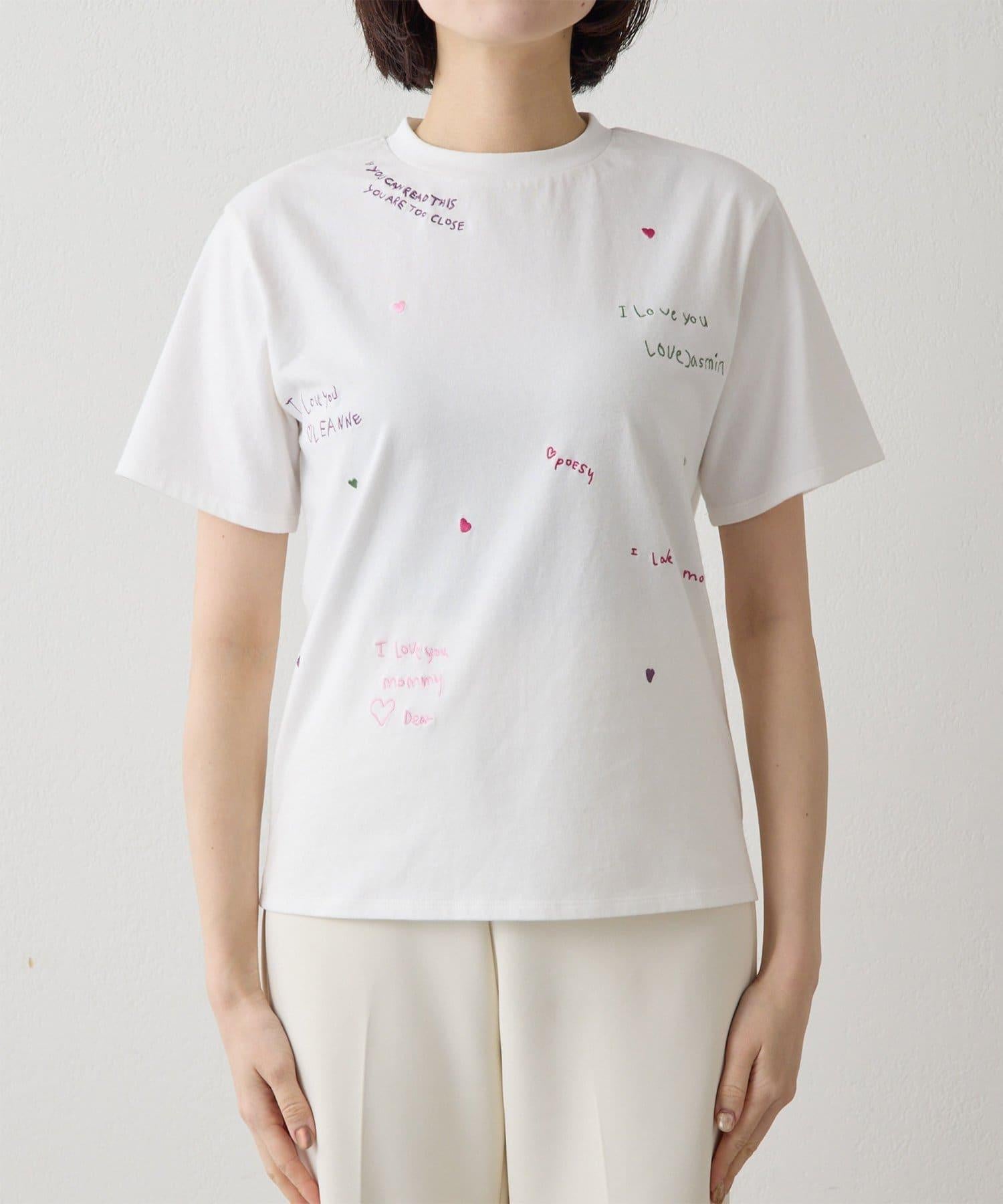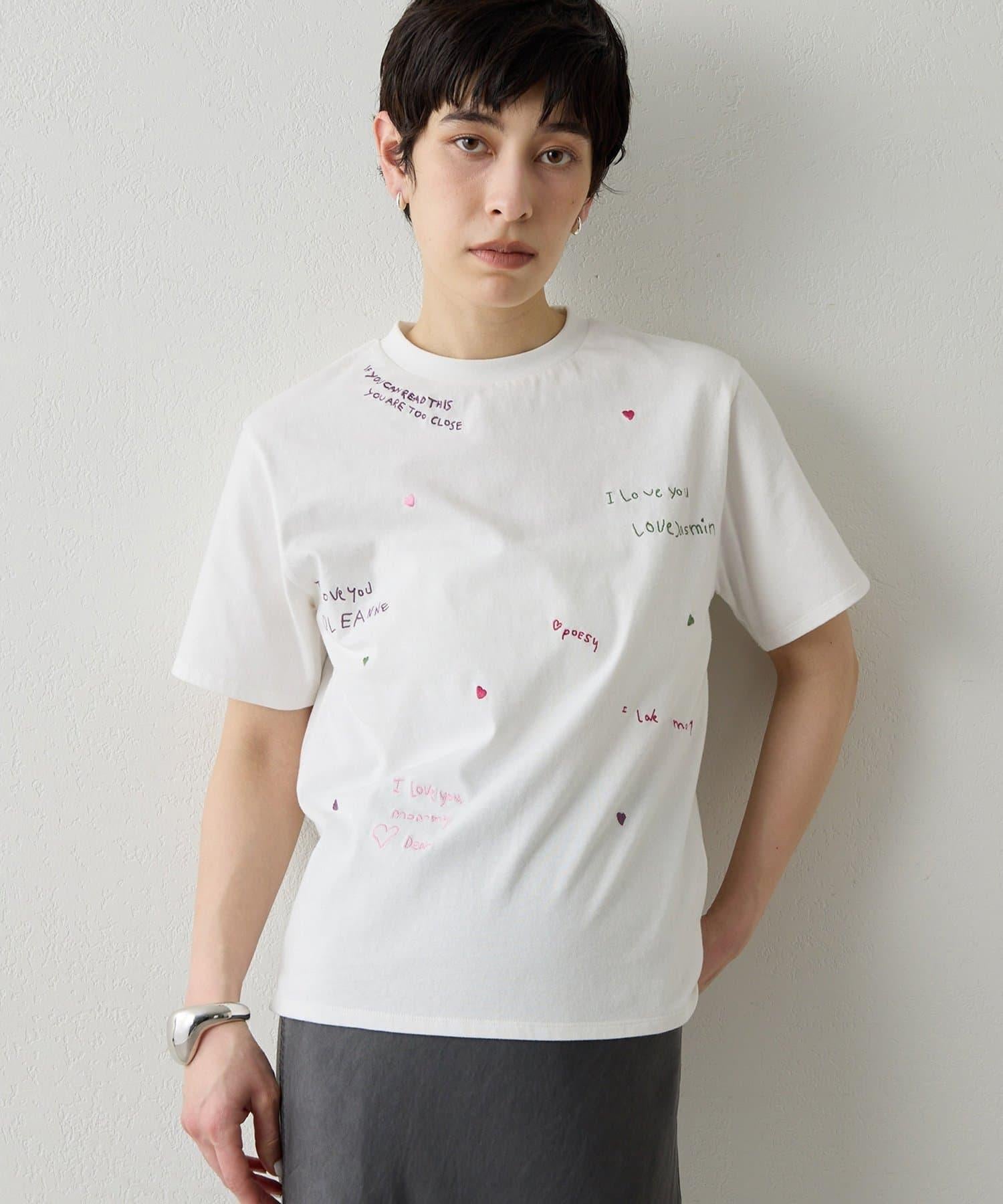 短袖 T 恤上繡有彩色信息和心形刺繡。
