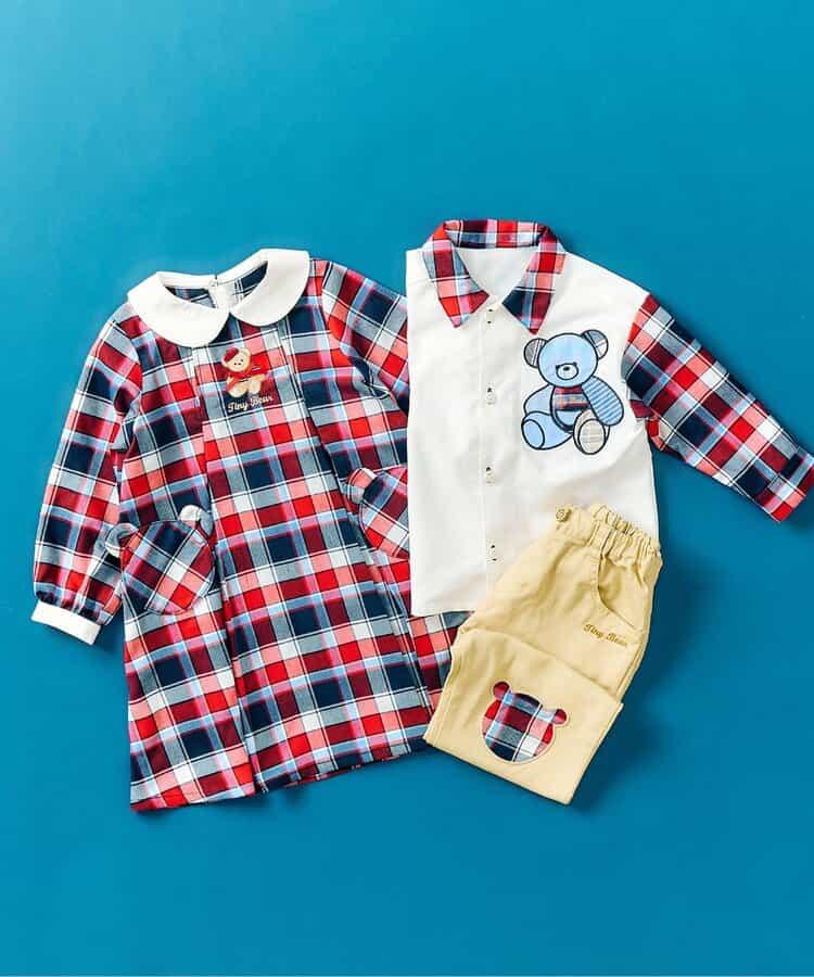 條紋圖案上印有小熊提著箱子出門的圖案,格紋圖案上繡有小熊圖案。
