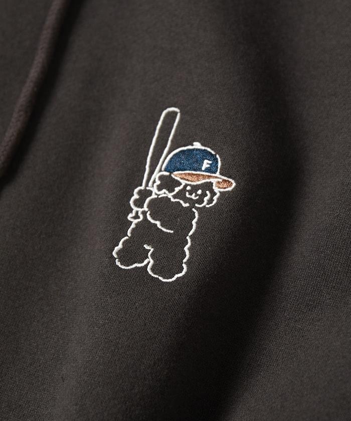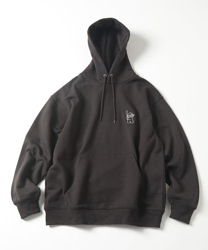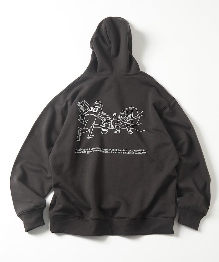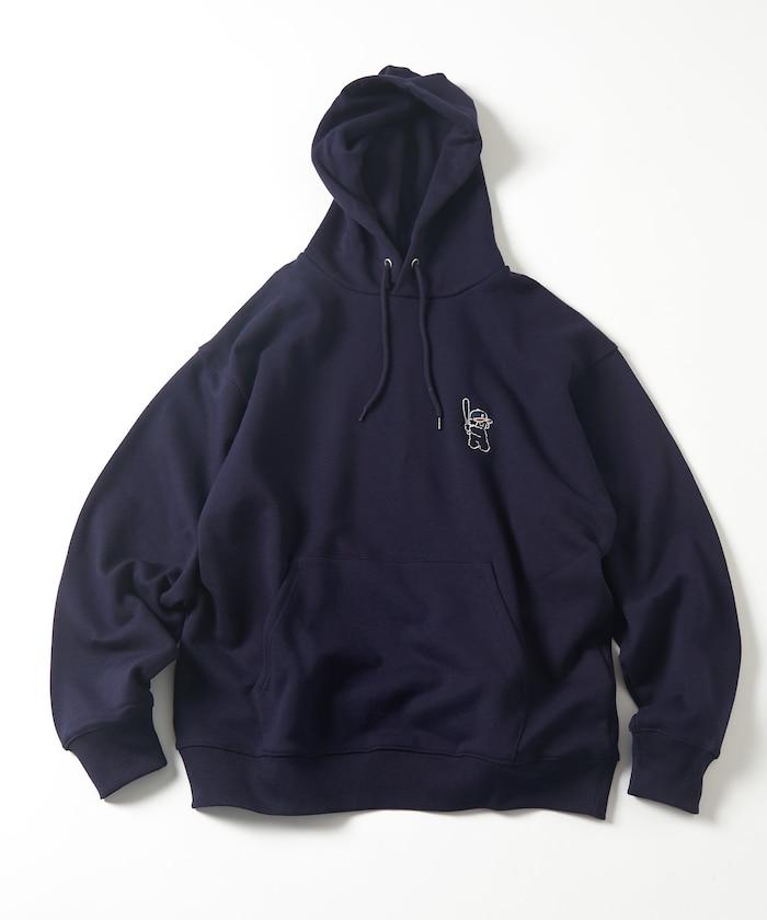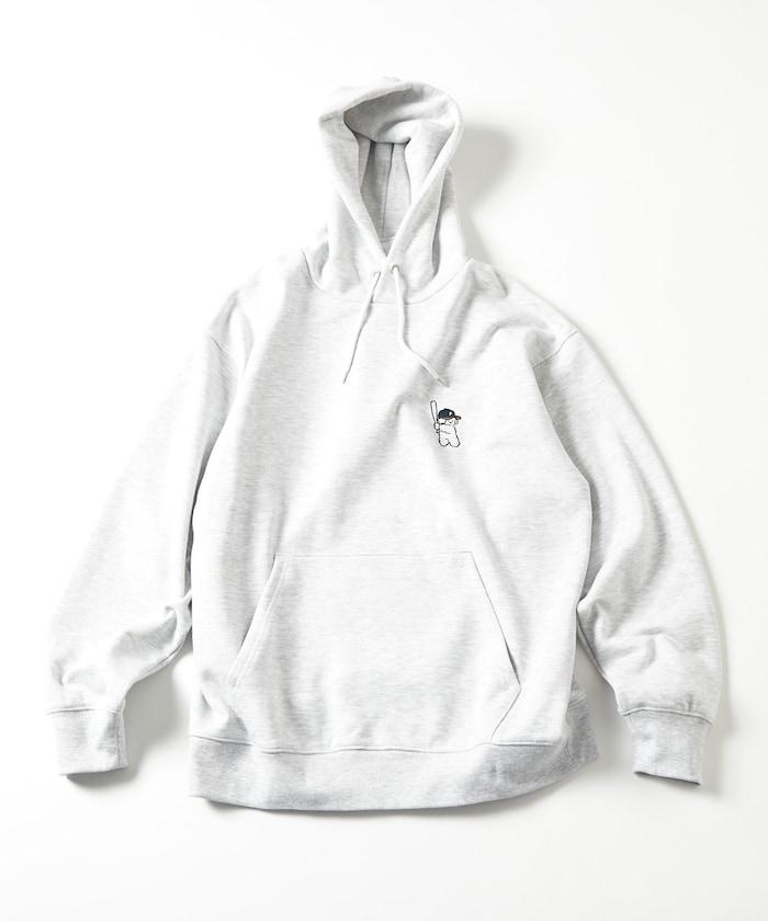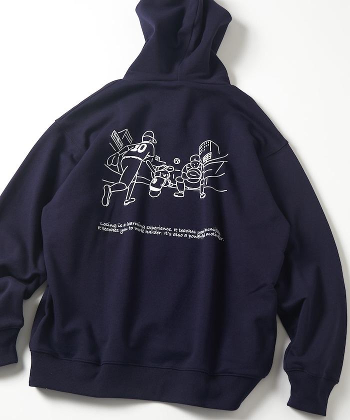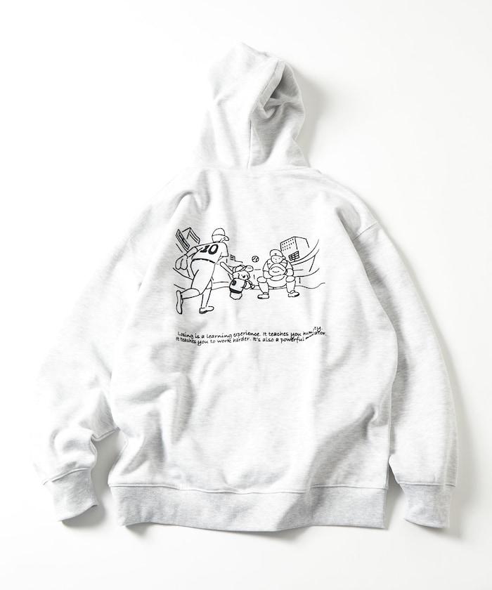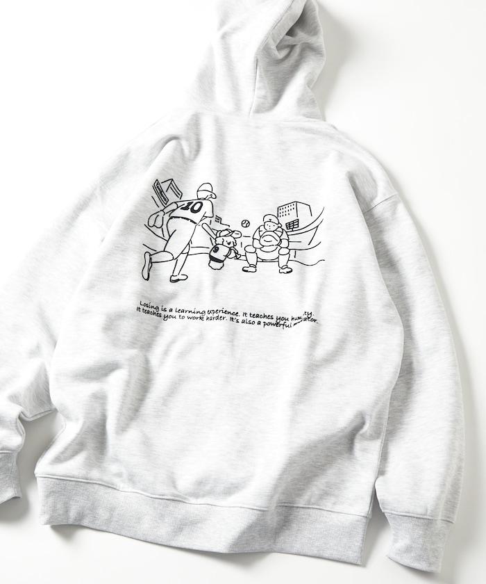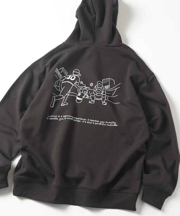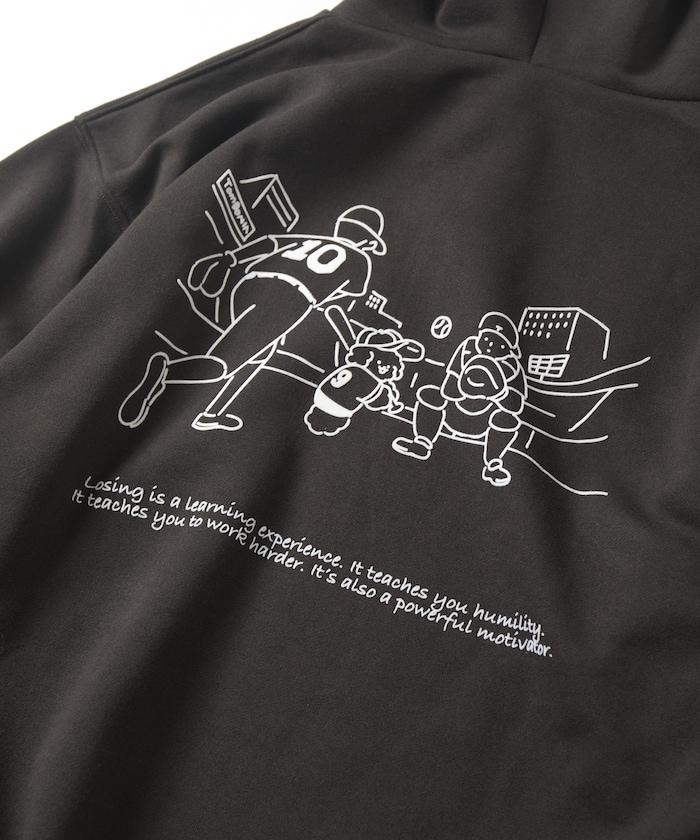 這件連帽衫的背面印有貴賓犬 Mukku 玩棒球的插圖,Mukku 是 tombonia 的標誌之一。