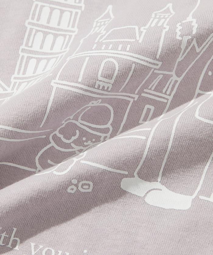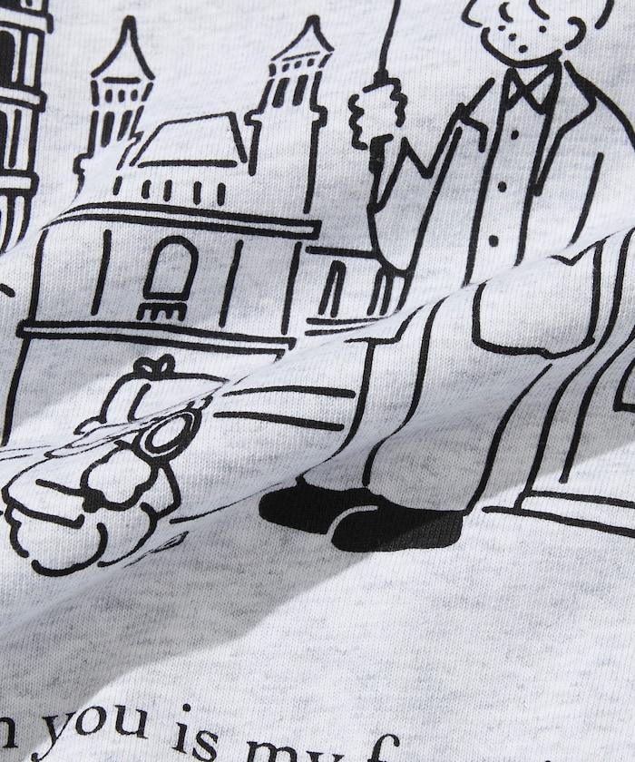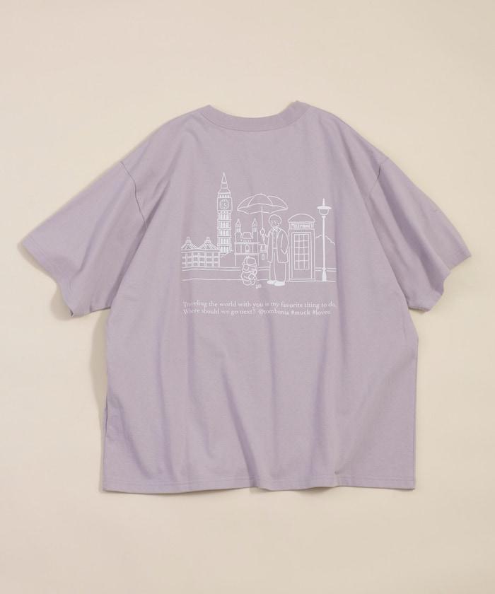 背面印有口袋的 T 恤,描繪了與 tombonia 的標誌性玩具貴賓犬 MUCK 一起去倫敦旅行的情景。