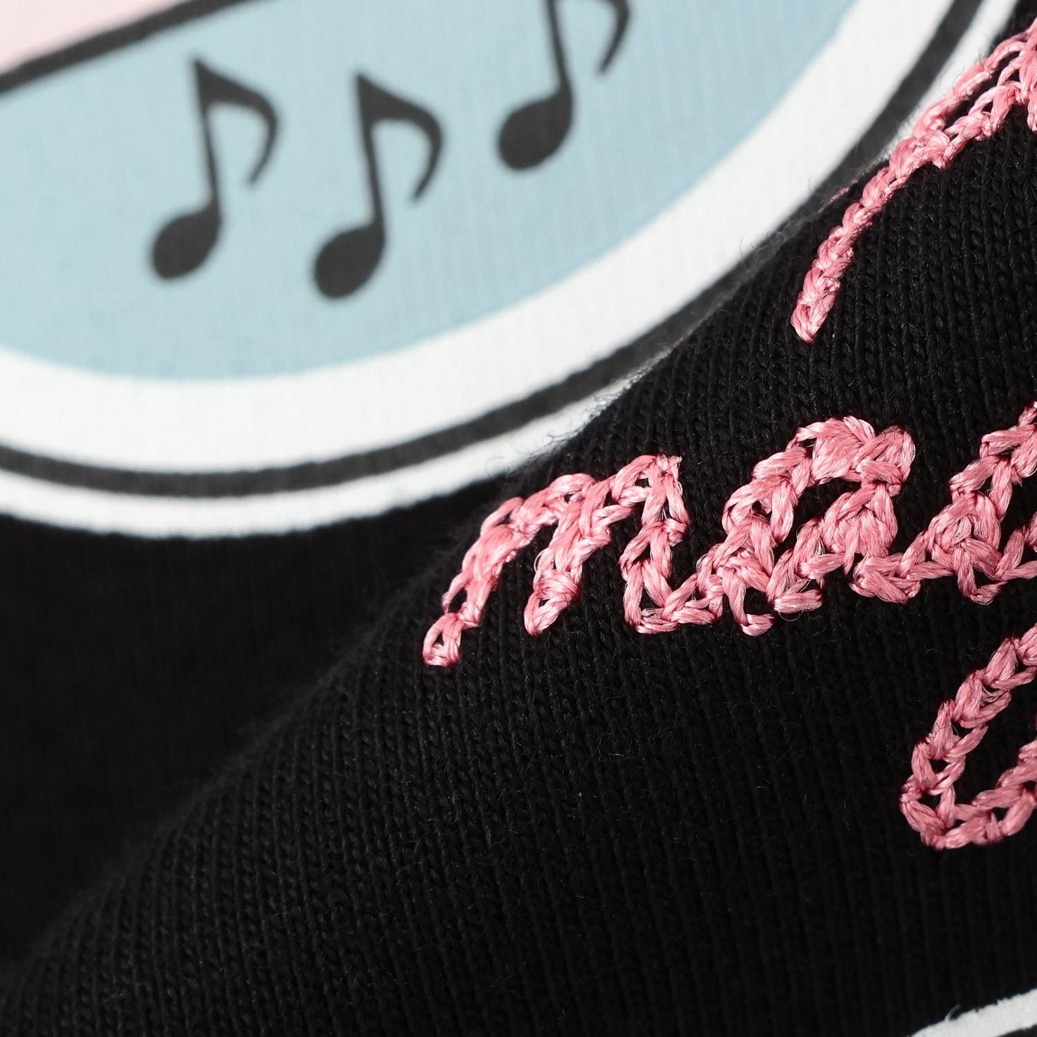 左胸飾有門票狀刺繡,後背飾有卡帶和唱片印花及貼片,設計充滿流行音樂情調和中性風。