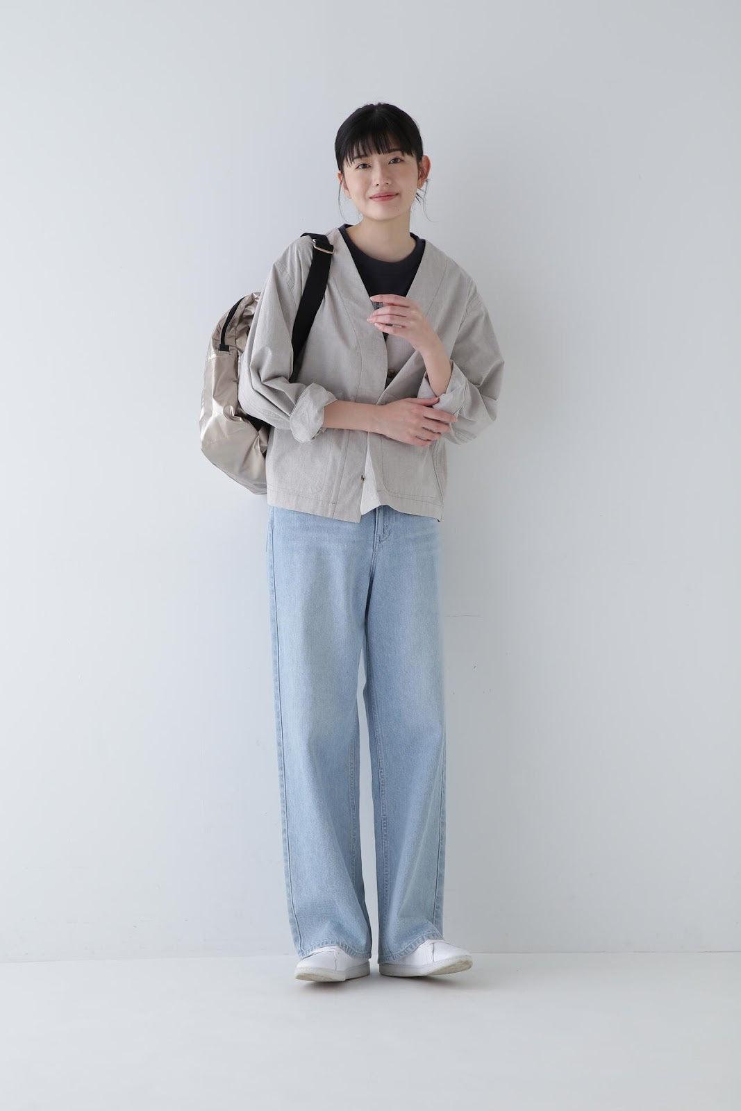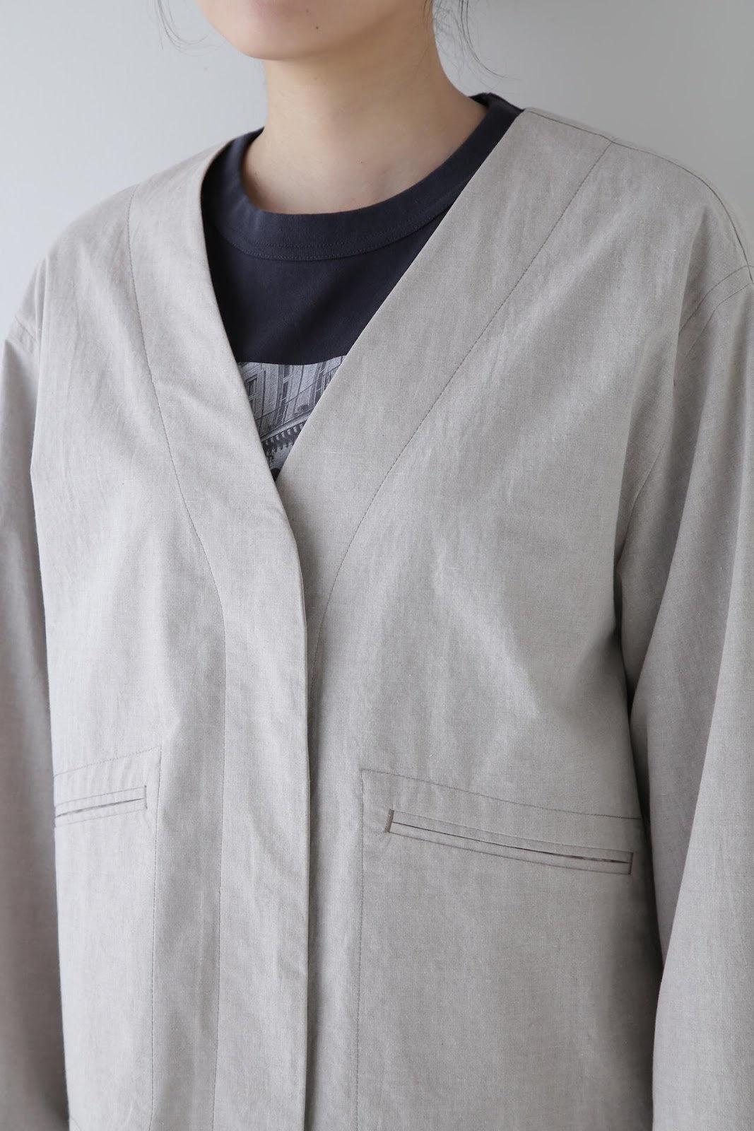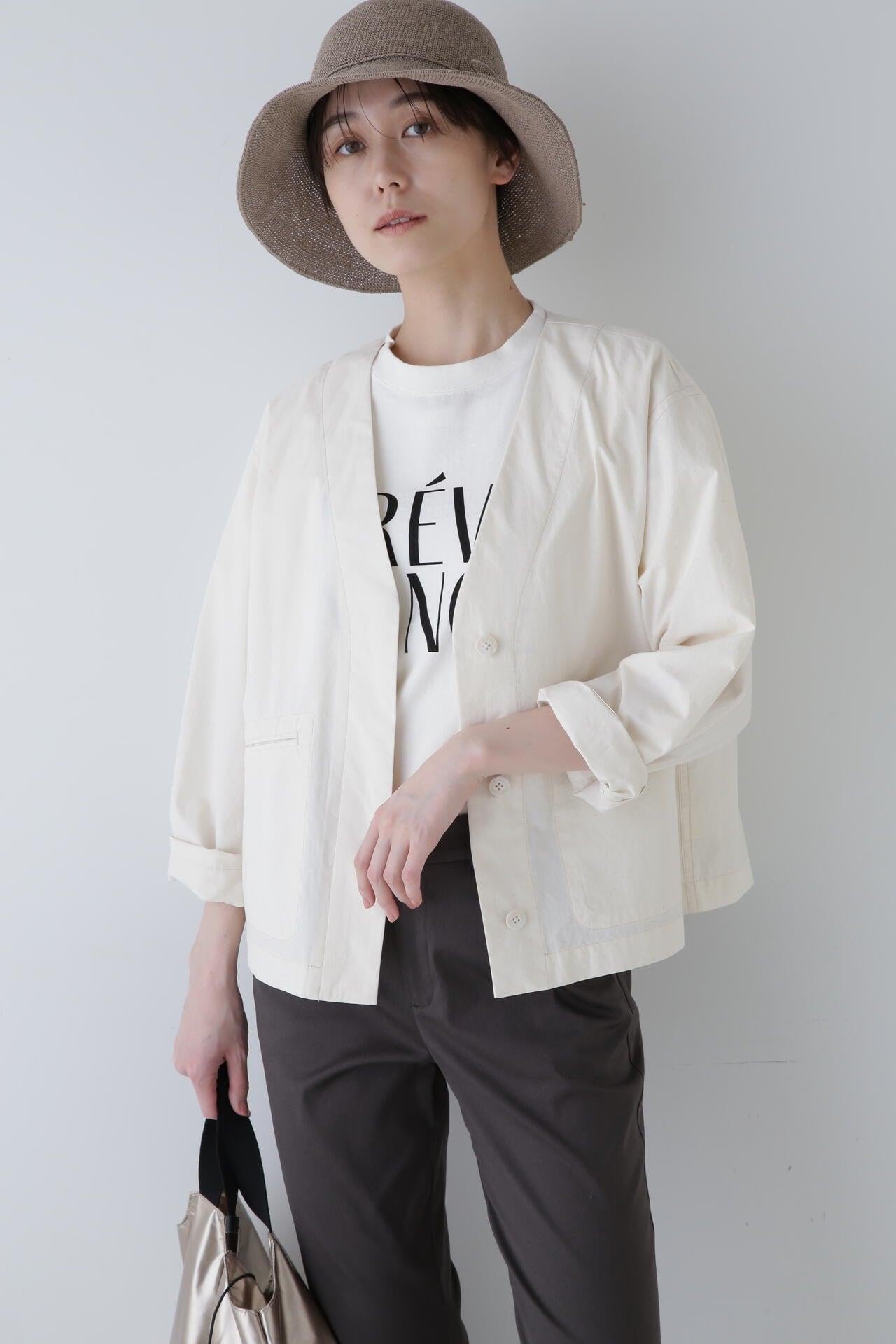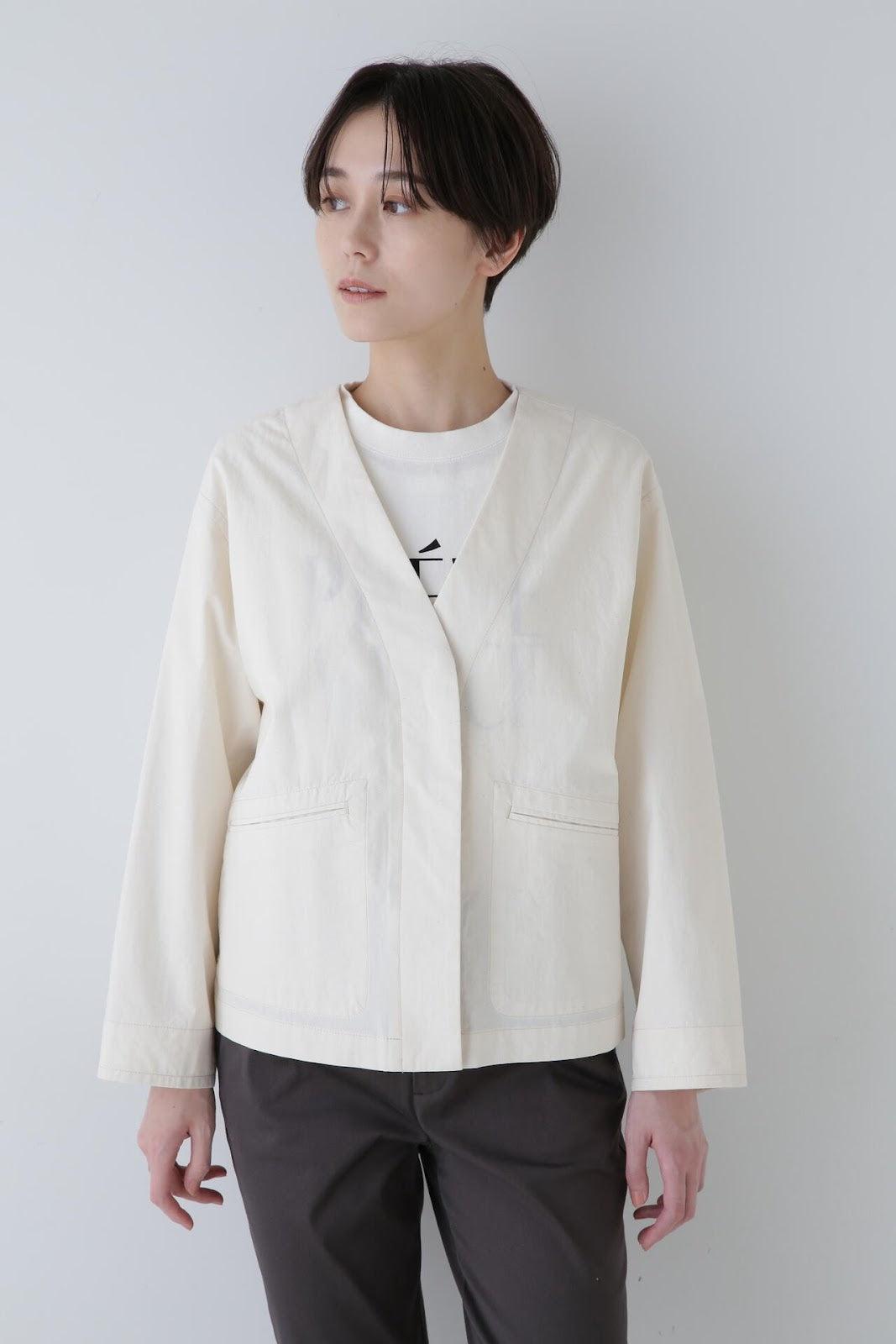 V 領設計簡潔,領口和縫線寬鬆。罩衫採用 30/1 天候面料製成,質地輕盈,外觀自然。有兩種顏色可供選擇:淺棕色和綠色。這是一款可以像襯衫一樣穿著的單品,在季節變化時非常方便。面料的質感可以讓人享受,因此我們建議將它簡單地套在 T 恤外面。