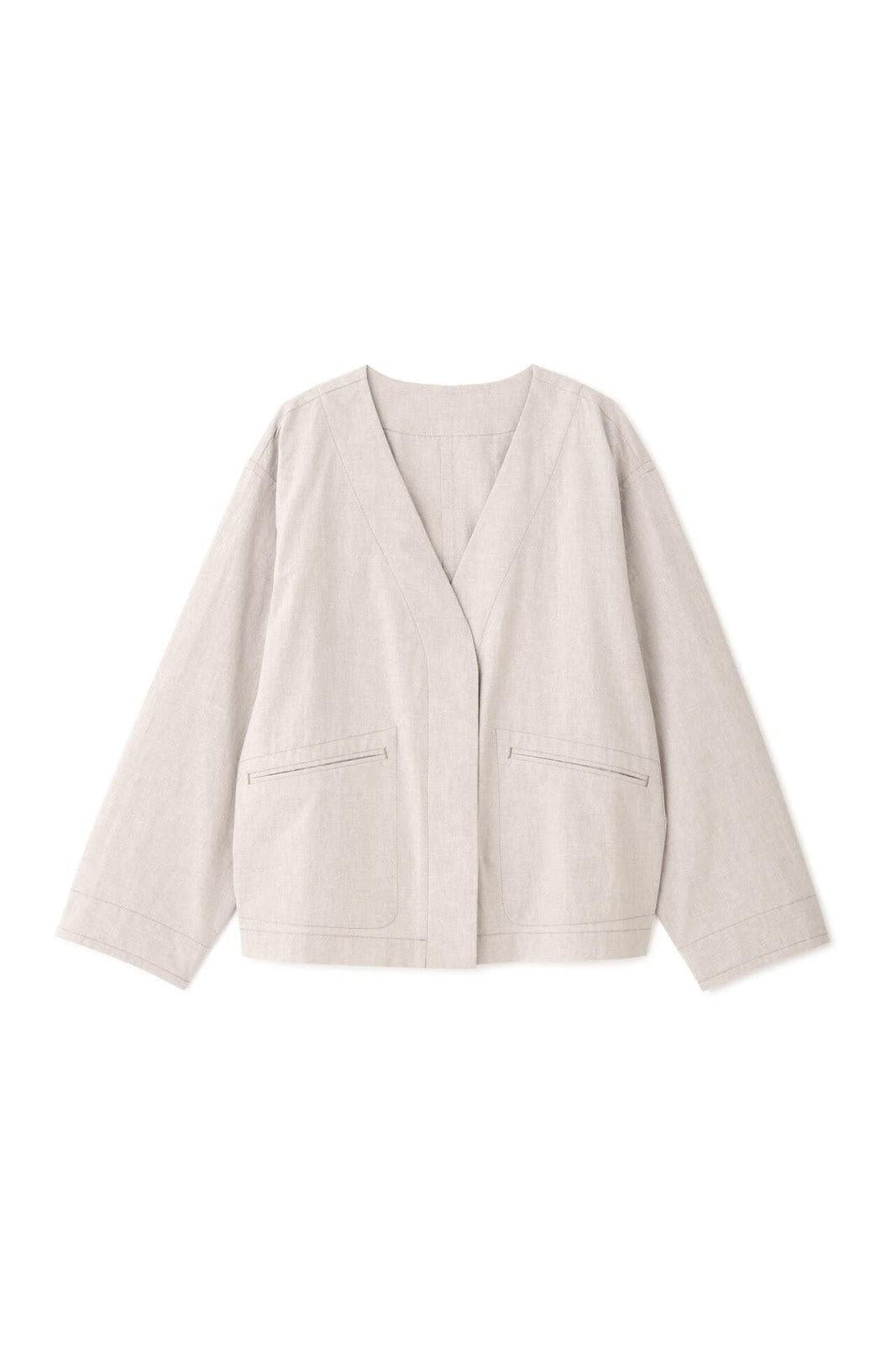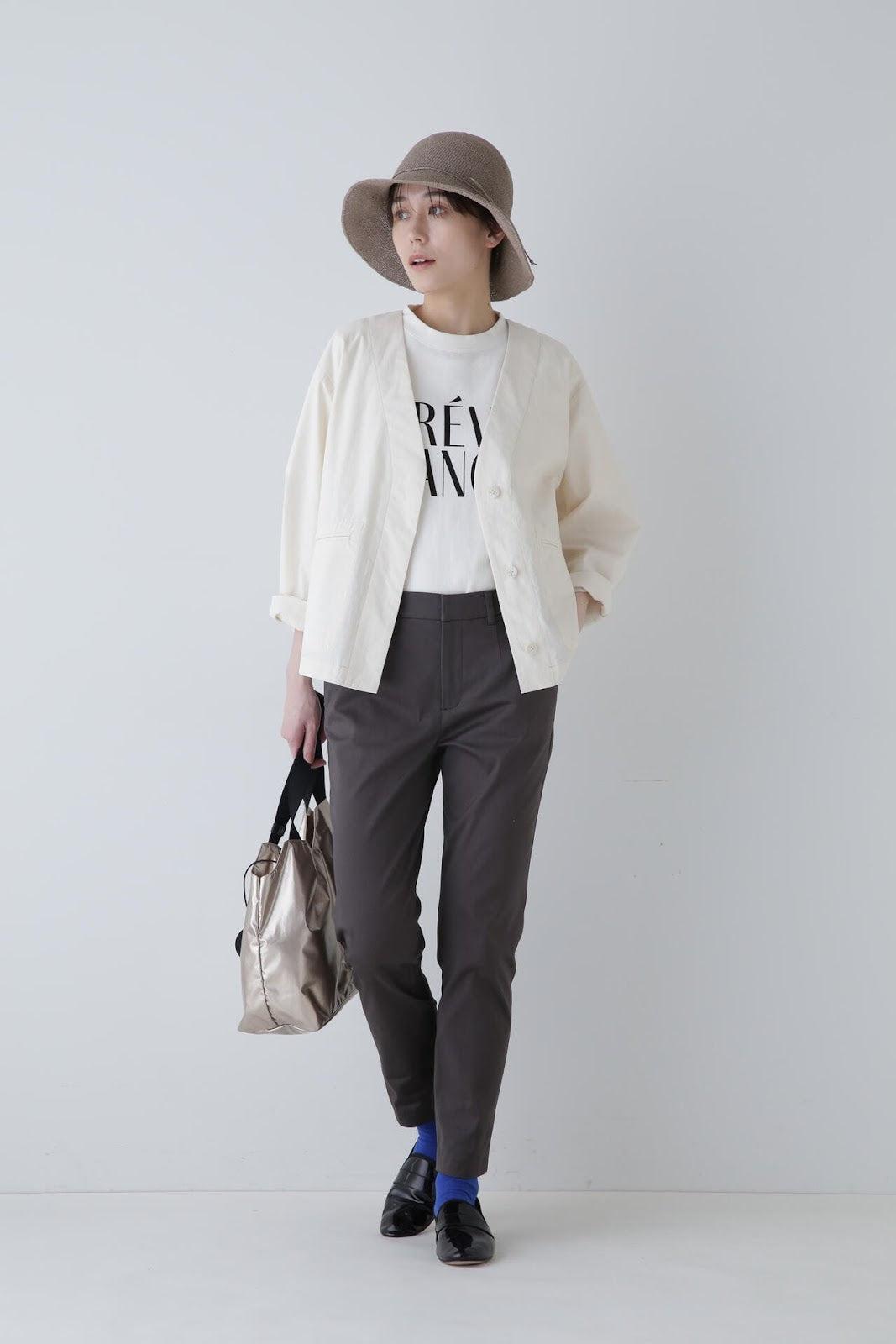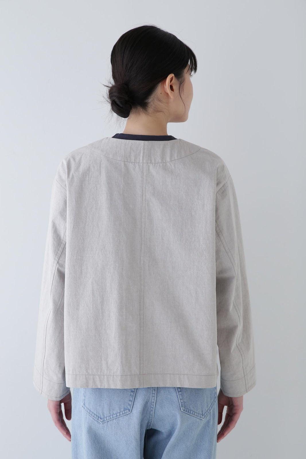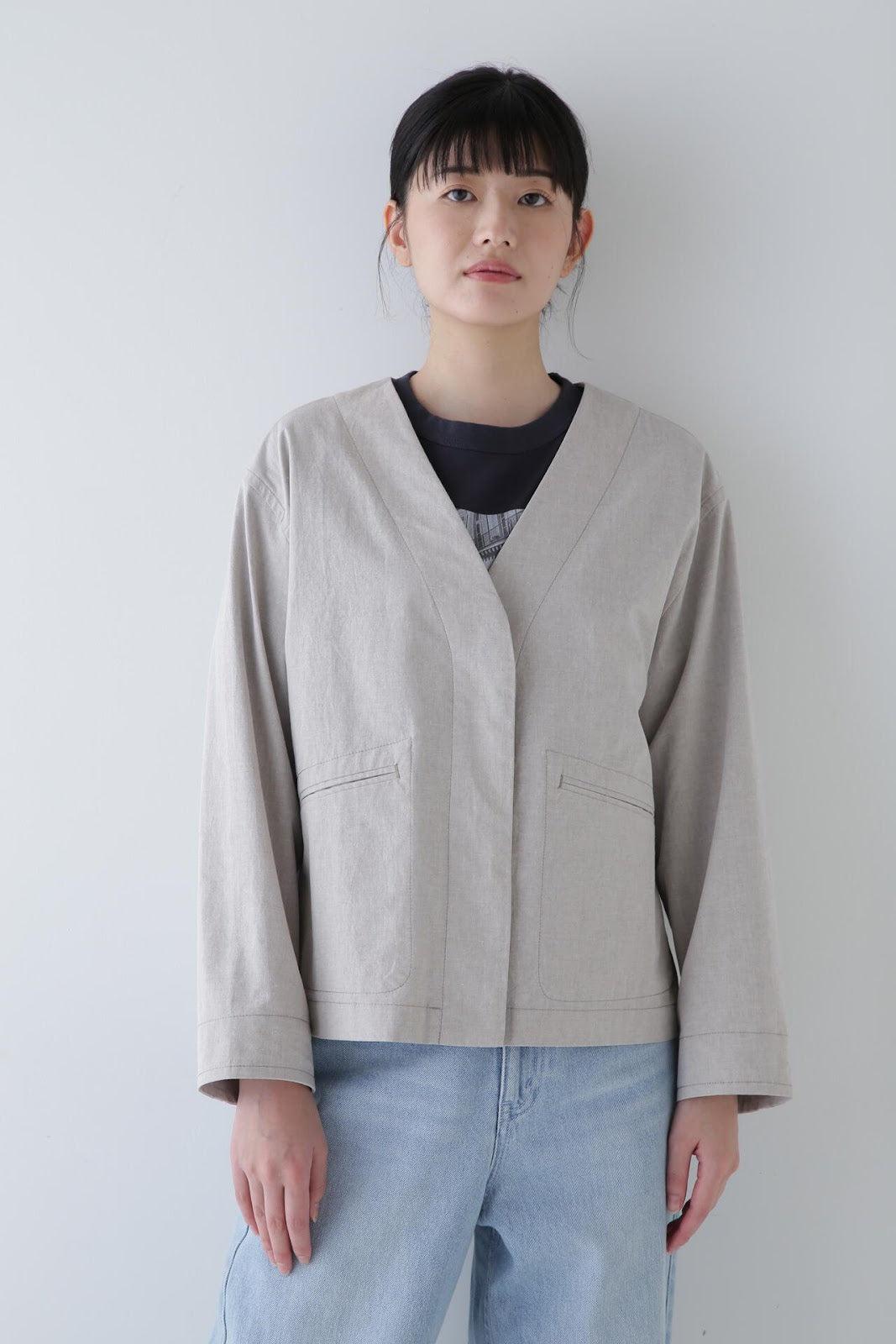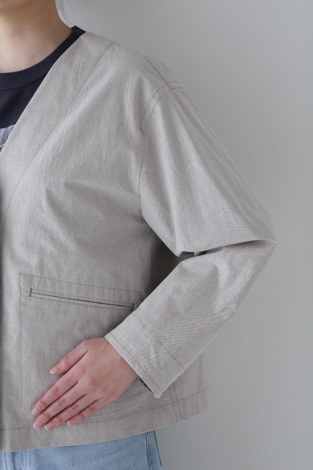 V 領設計簡潔,領口和縫線寬鬆。罩衫採用 30/1 天候面料製成,質地輕盈,外觀自然。有兩種顏色可供選擇:淺棕色和綠色。這是一款可以像襯衫一樣穿著的單品,在季節變化時非常方便。面料的質感可以讓人享受,因此我們建議將它簡單地套在 T 恤外面。