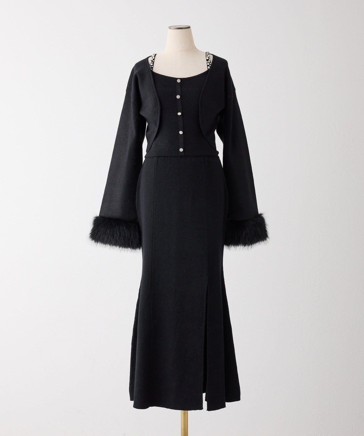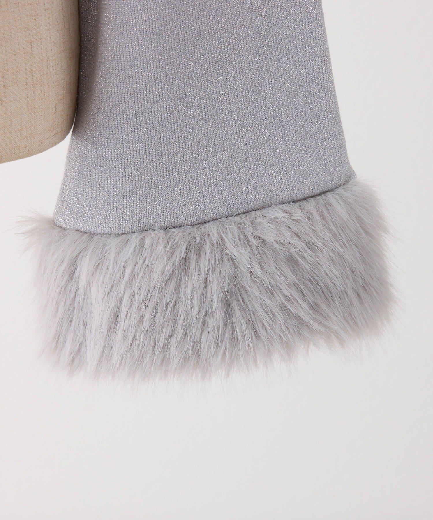 這款華麗的單品包括一件肩部飾有閃亮珠寶的針織吊帶衫和一件袖口飾有蓬鬆皮草的長筒連衣裙。