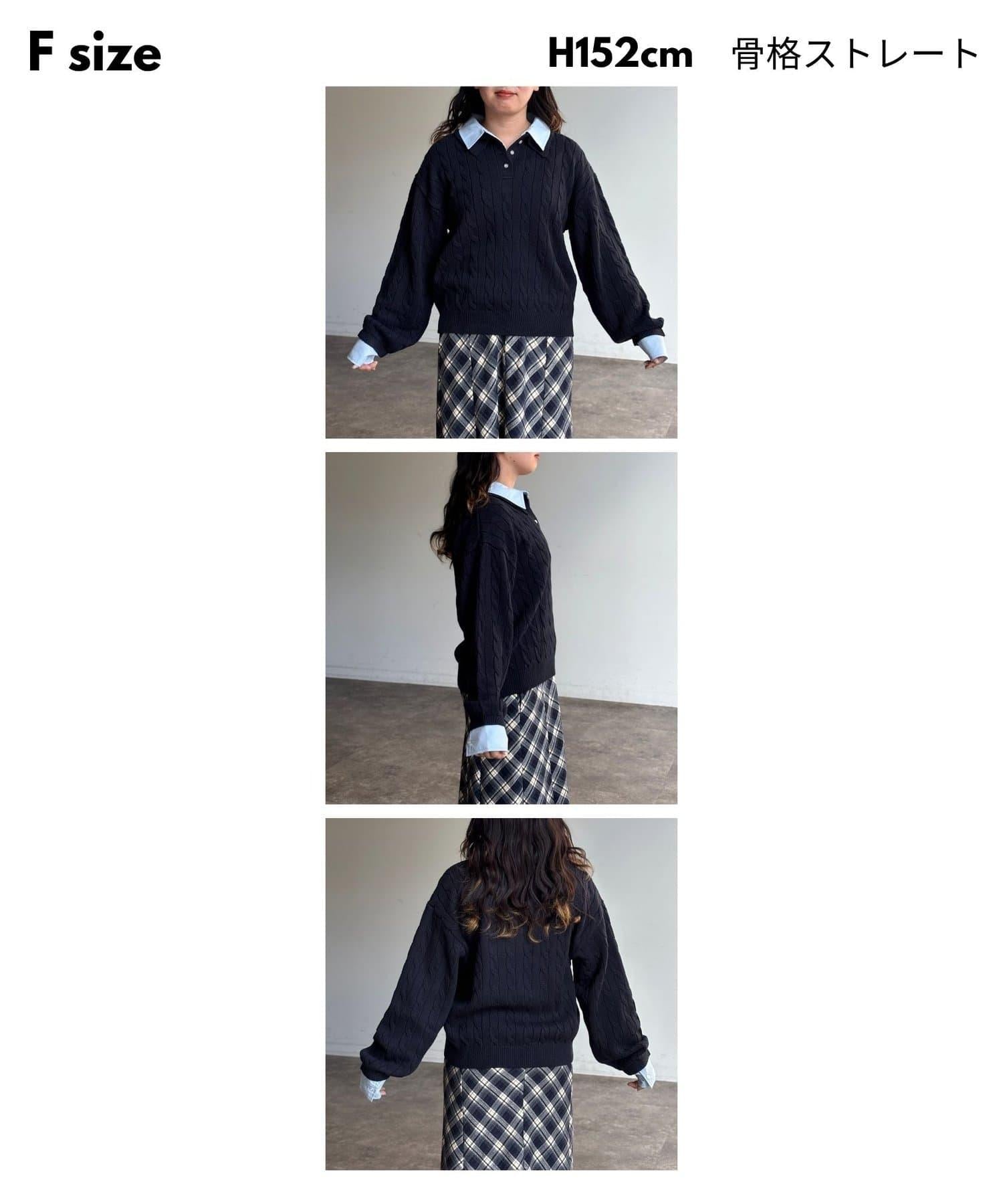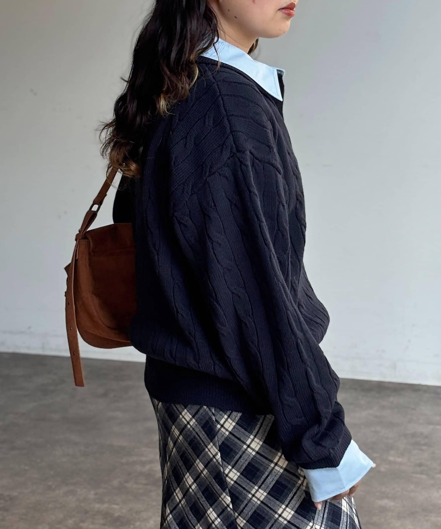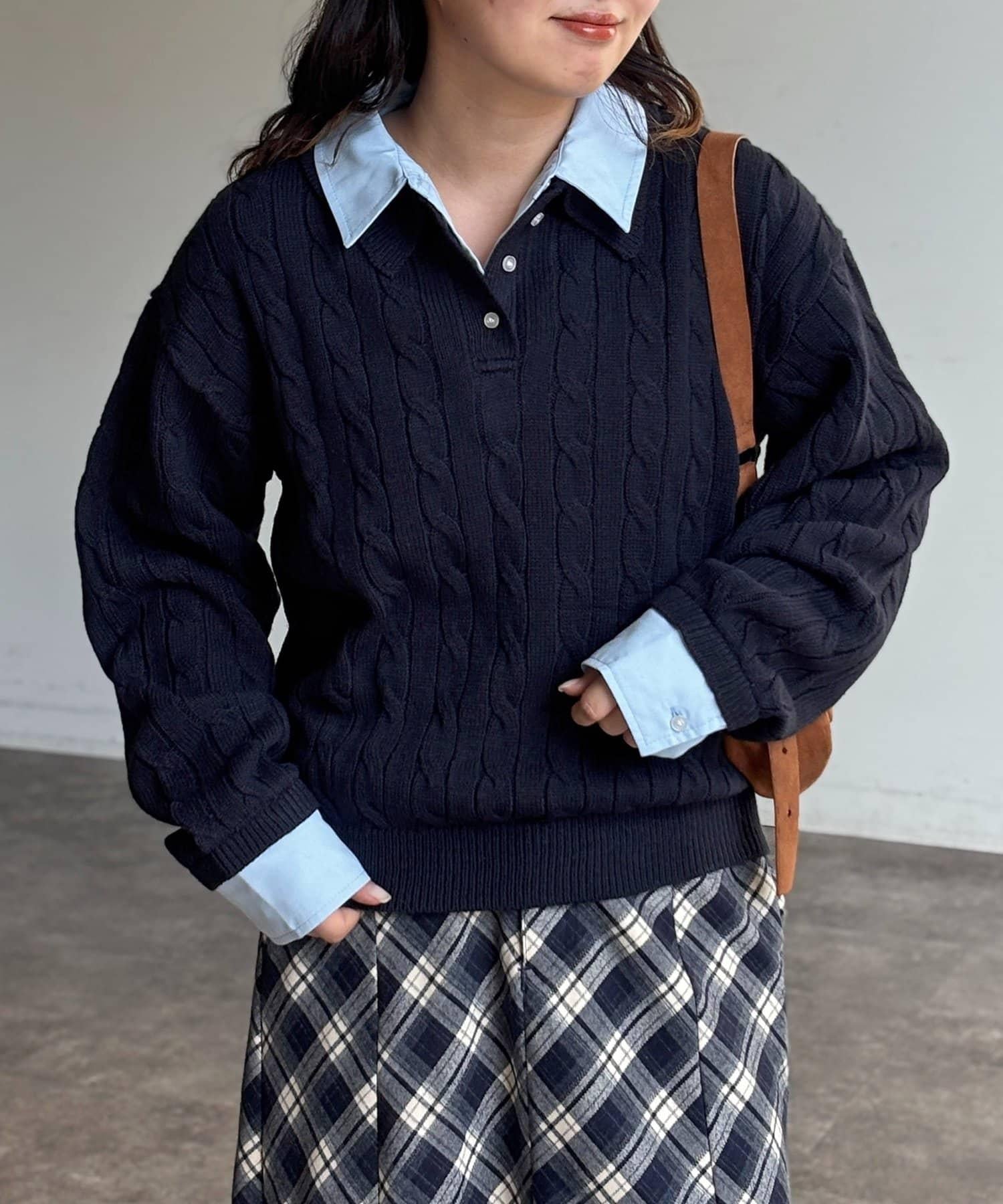深色電纜針織與襯衫領口的結合,給人優雅沉穩的印象。