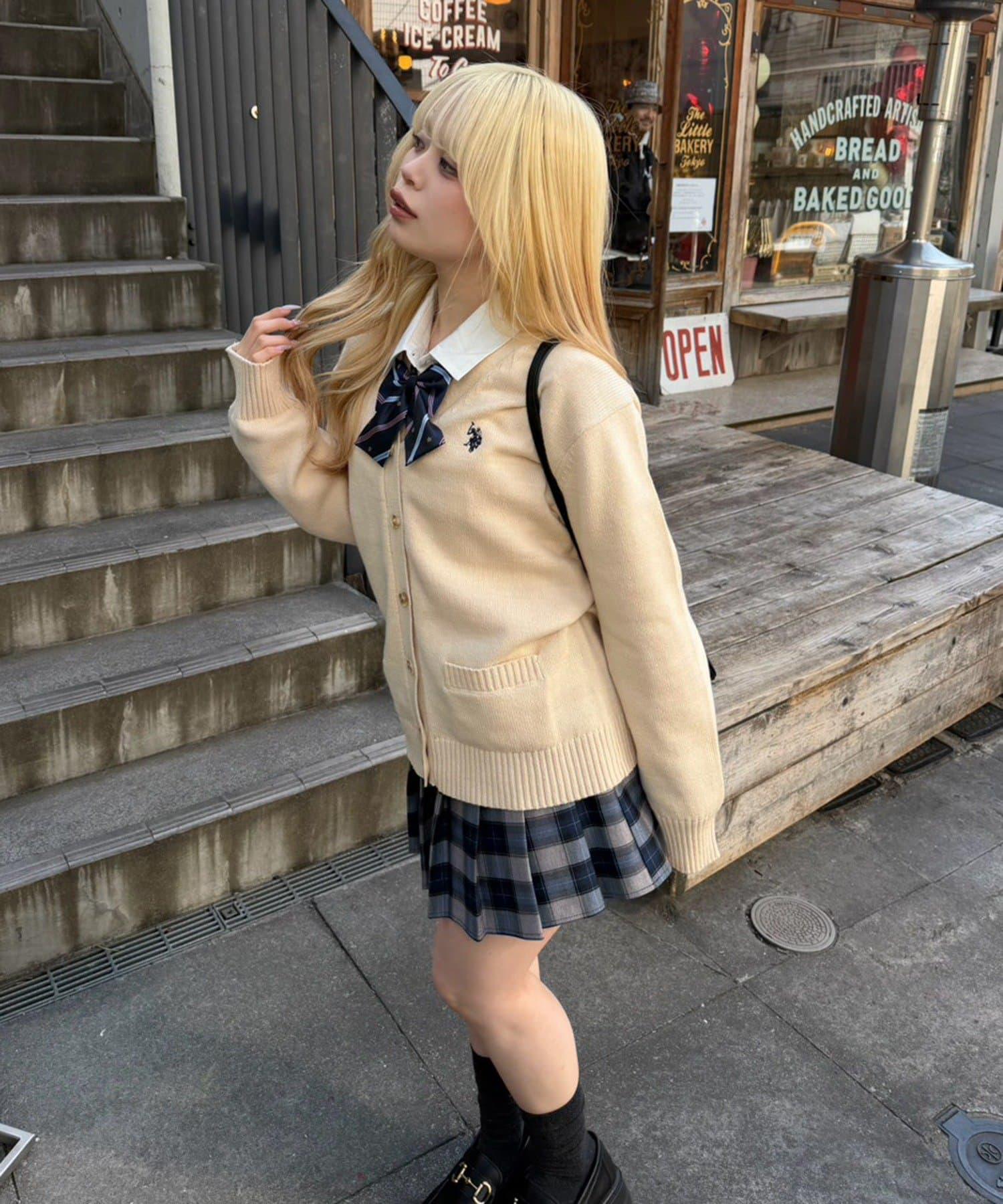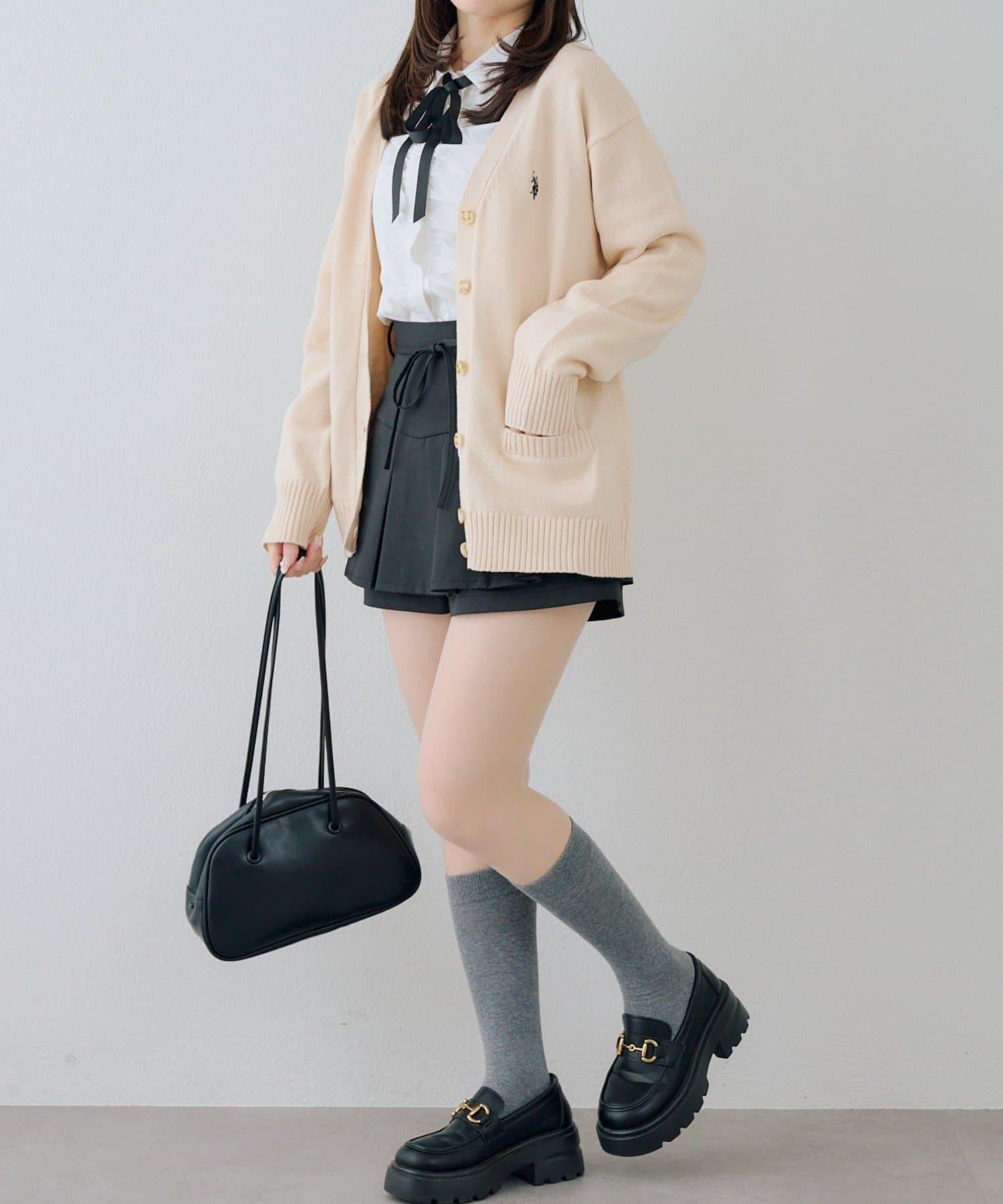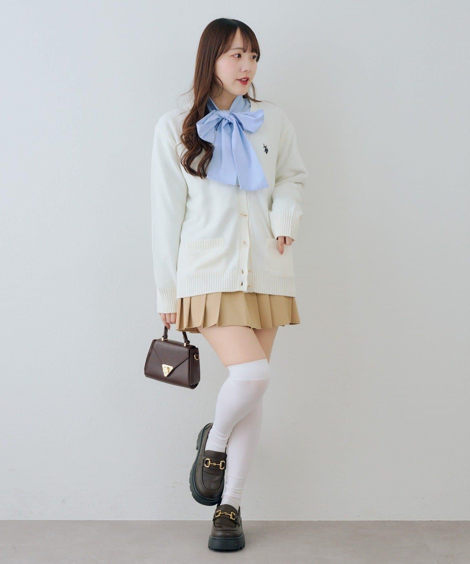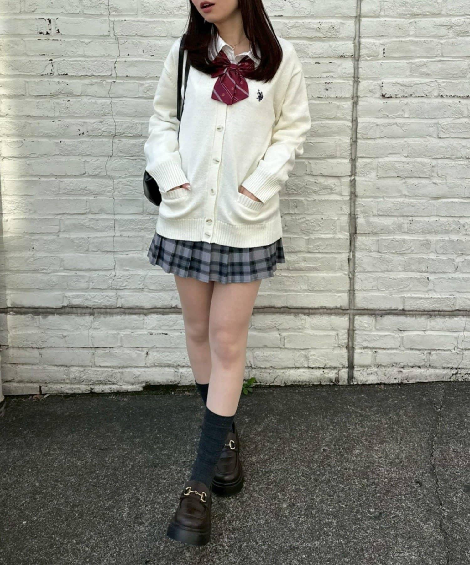 開衫外搭襯衫和迷你裙,腳踩樂福鞋,盡顯學生氣。