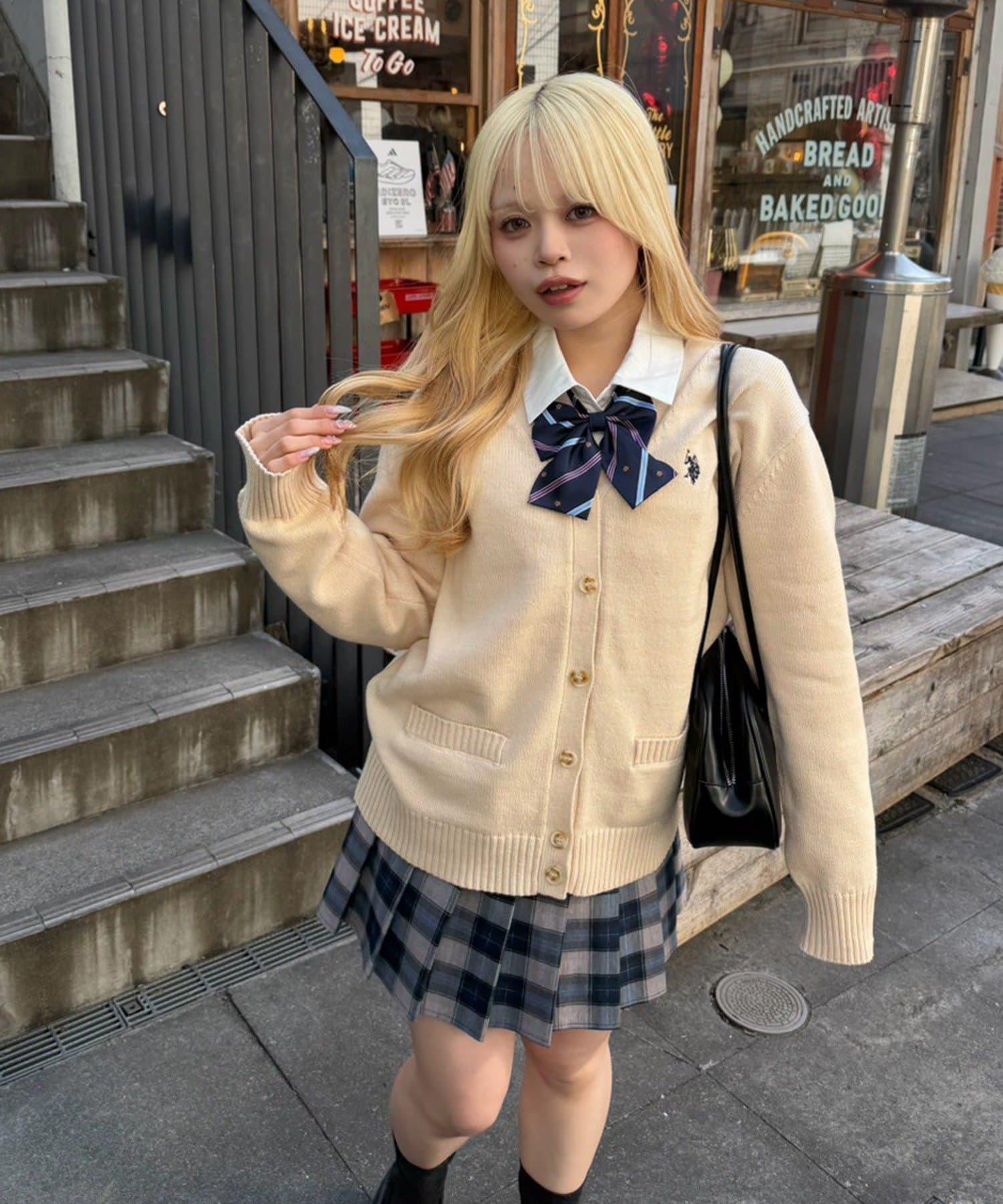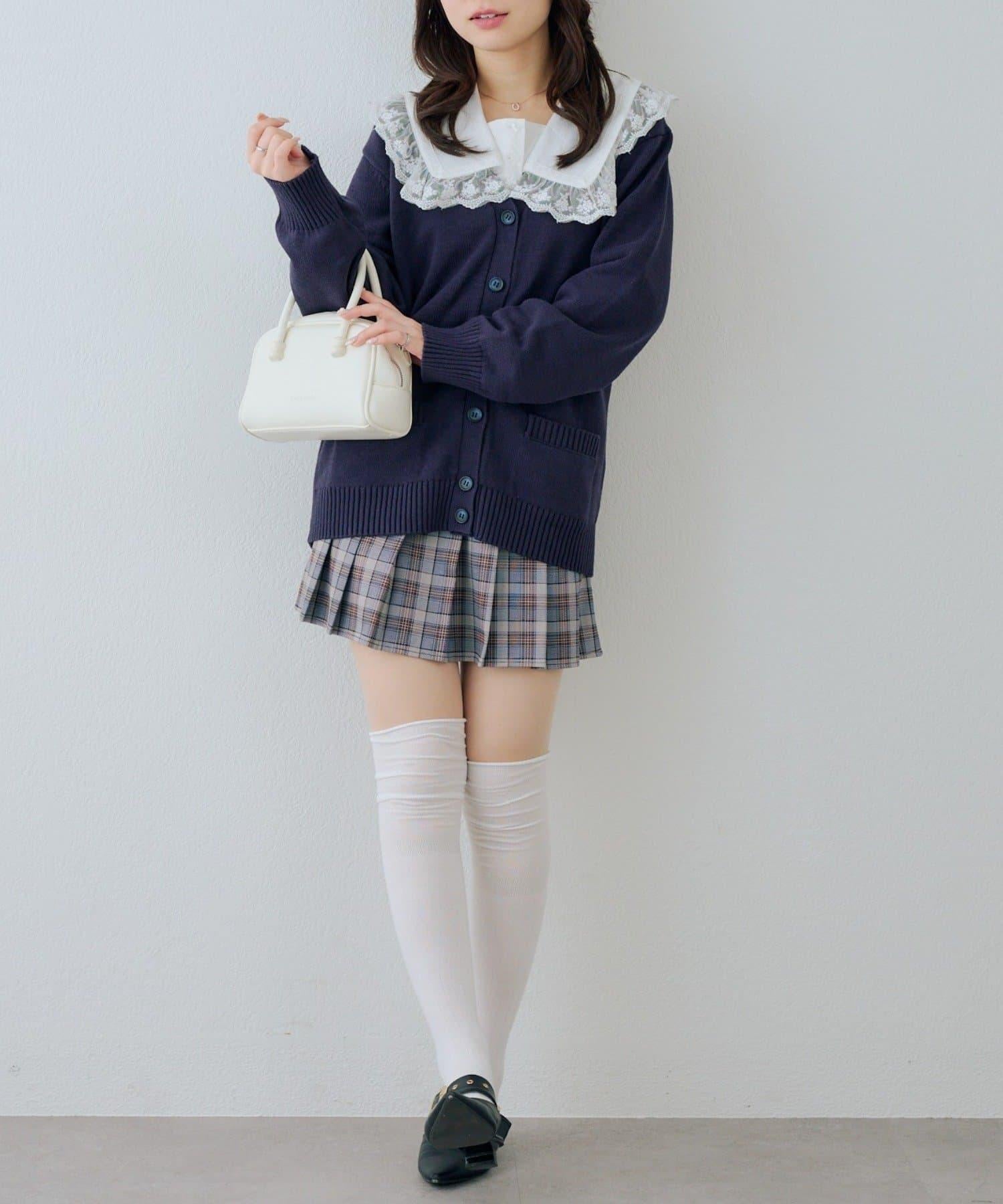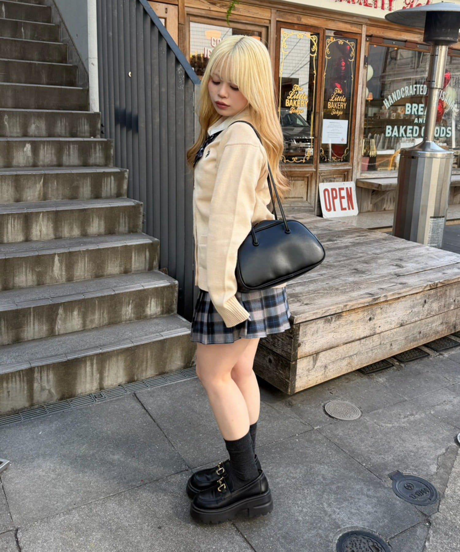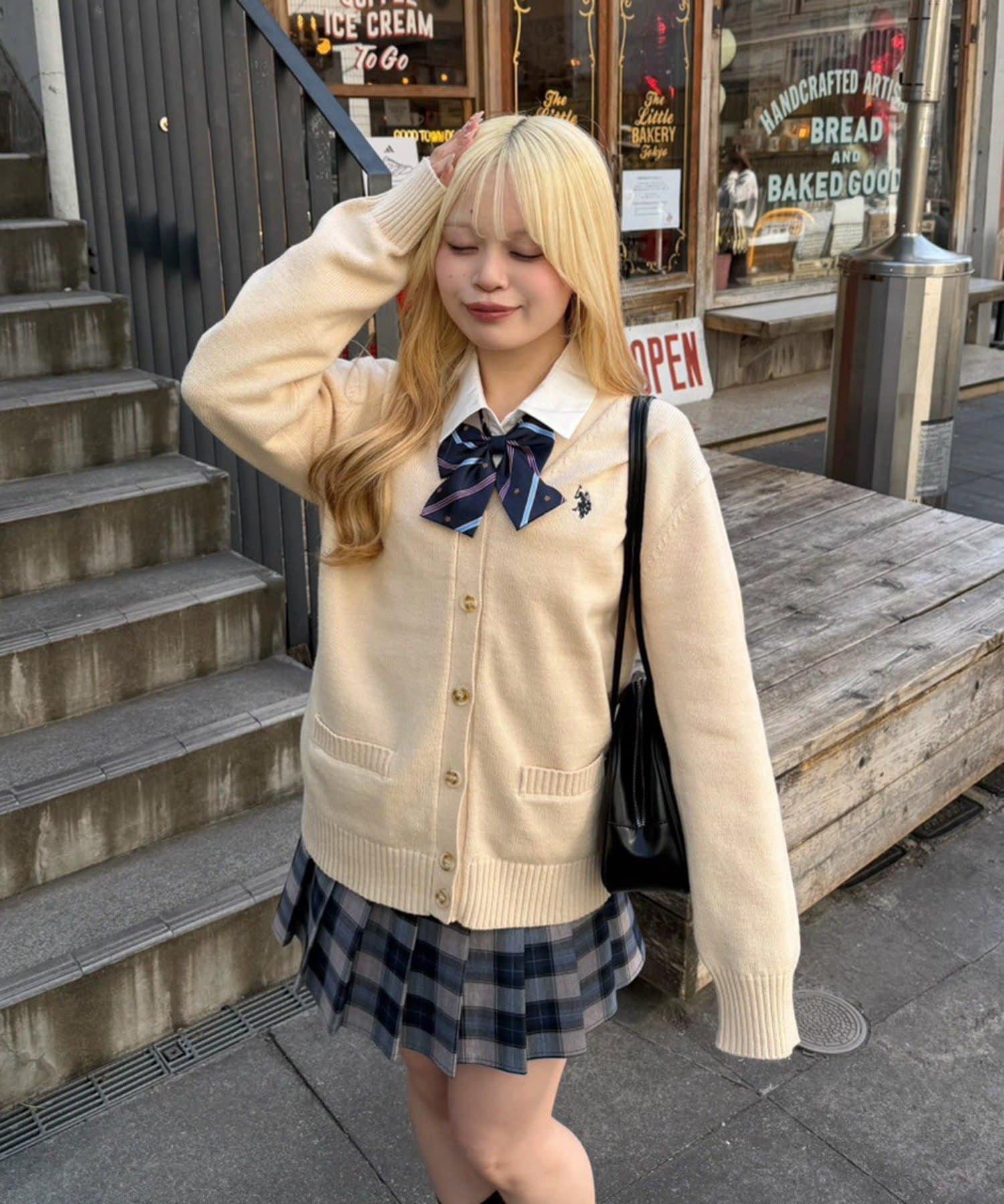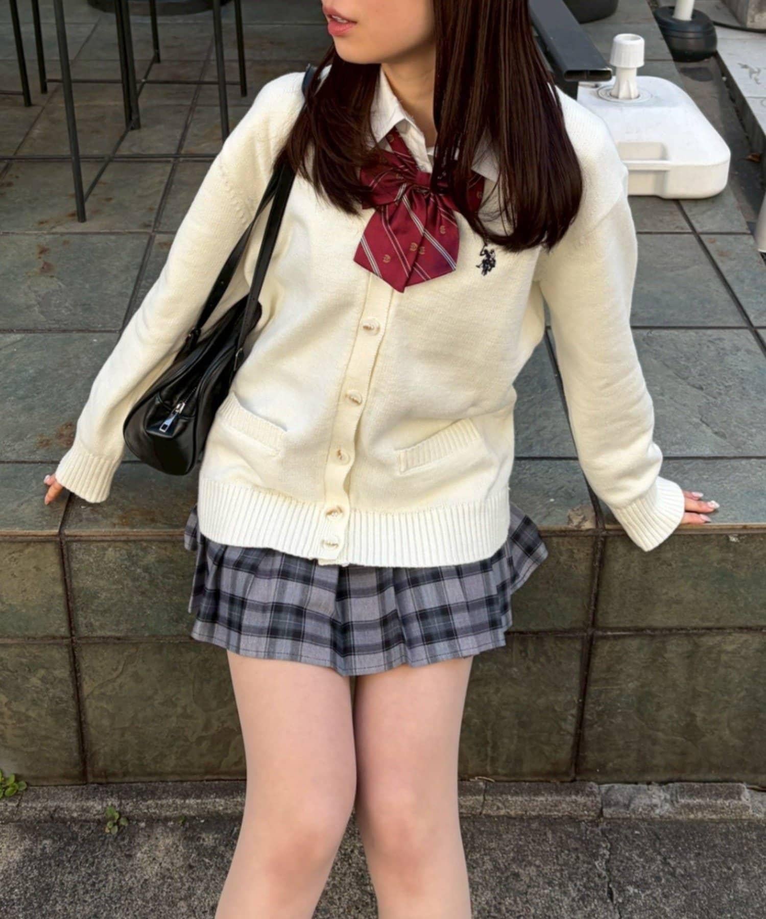 開衫外搭襯衫和迷你裙,腳踩樂福鞋,盡顯學生氣。