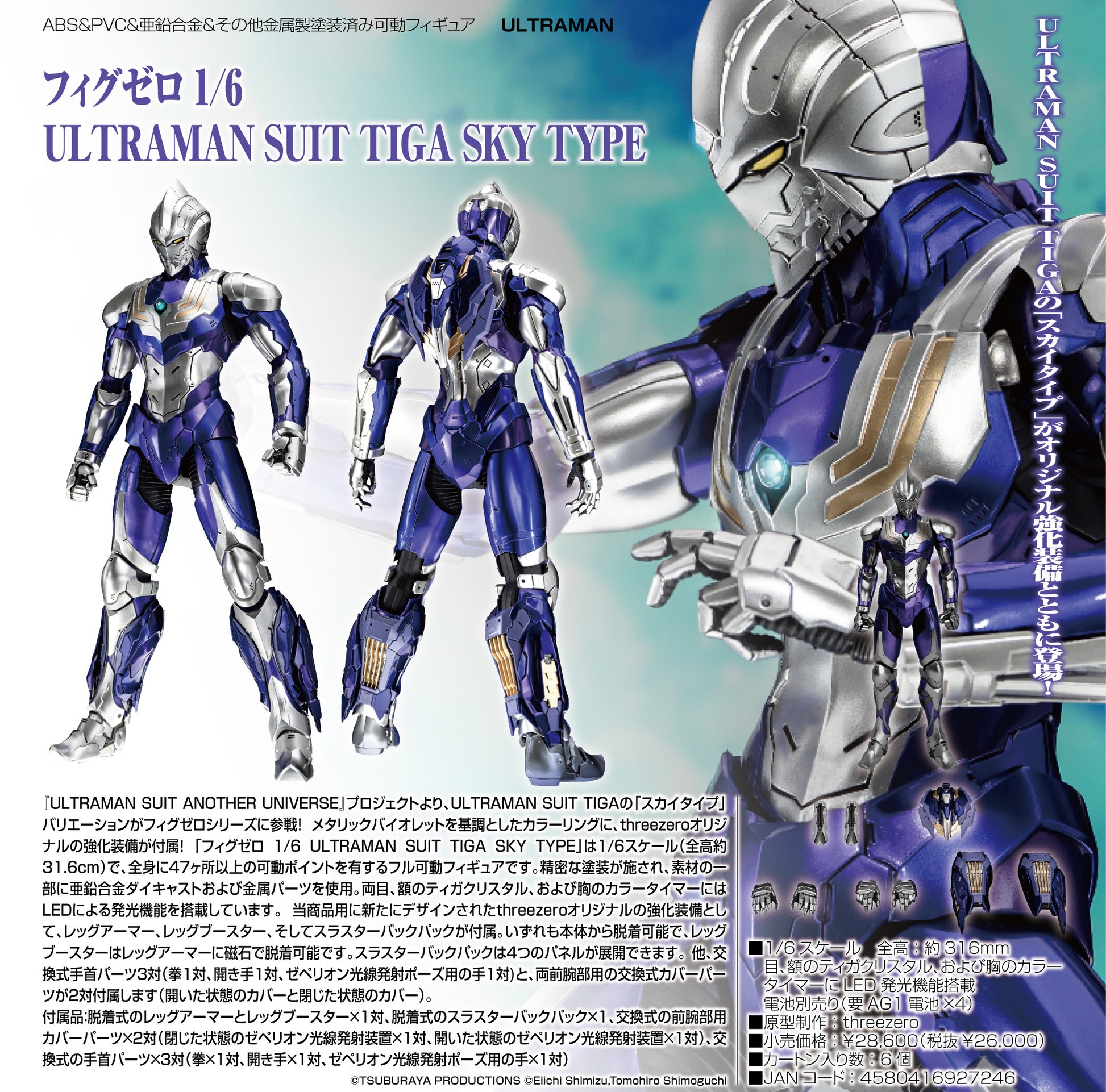 Figuero 1/6 超限戰士裝備 TIGA SKY TYPE 是一個 1/6 比例(高約 31.6 厘米)、可完全擺放的人物,全身有超過 47 個鉸接點。該模型採用精密塗裝,部分零件由鋅合金和金屬壓鑄而成。雙眼、額頭上的蒂加水晶和胸前的彩色計時器都配有 LED 發光功能。