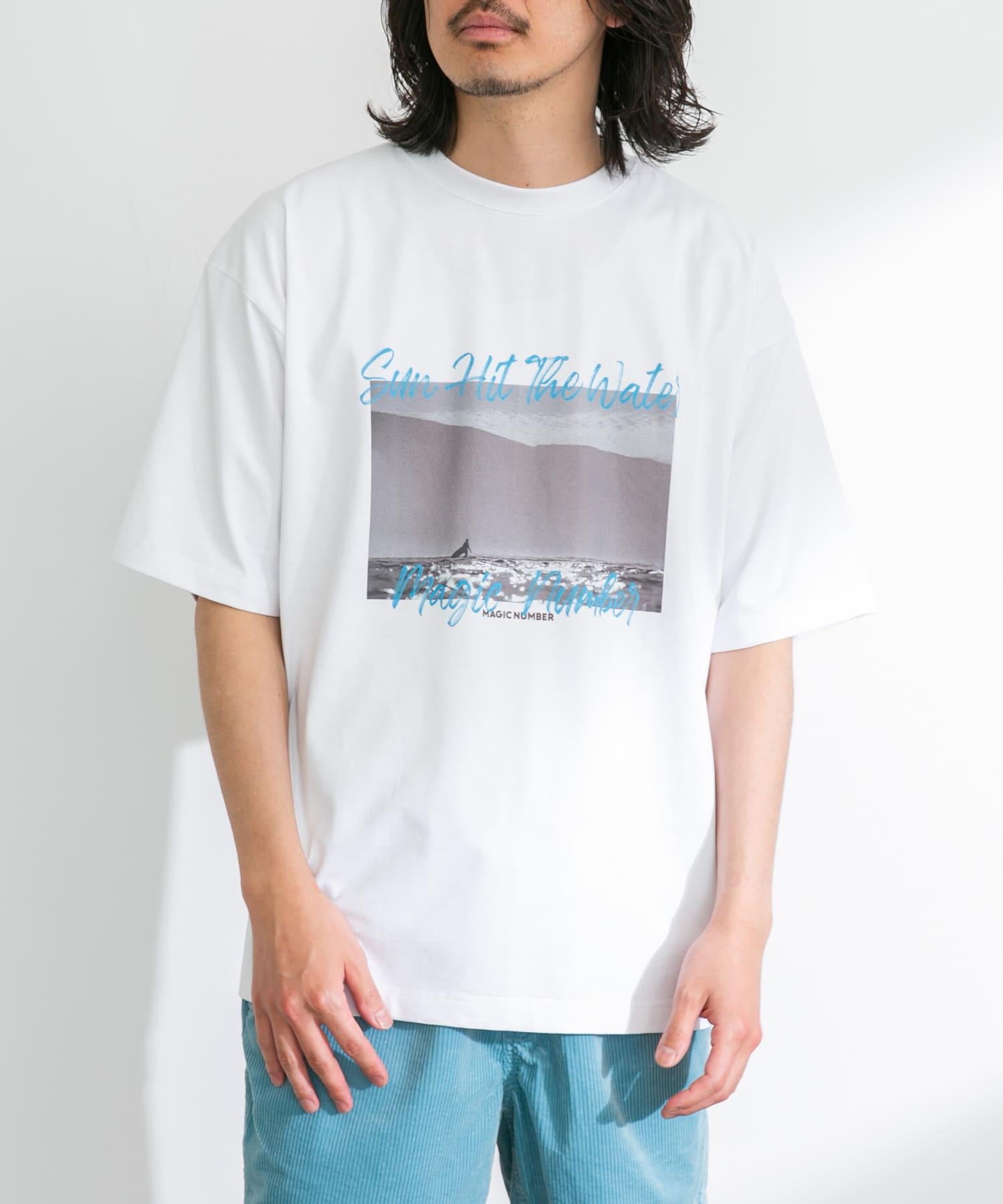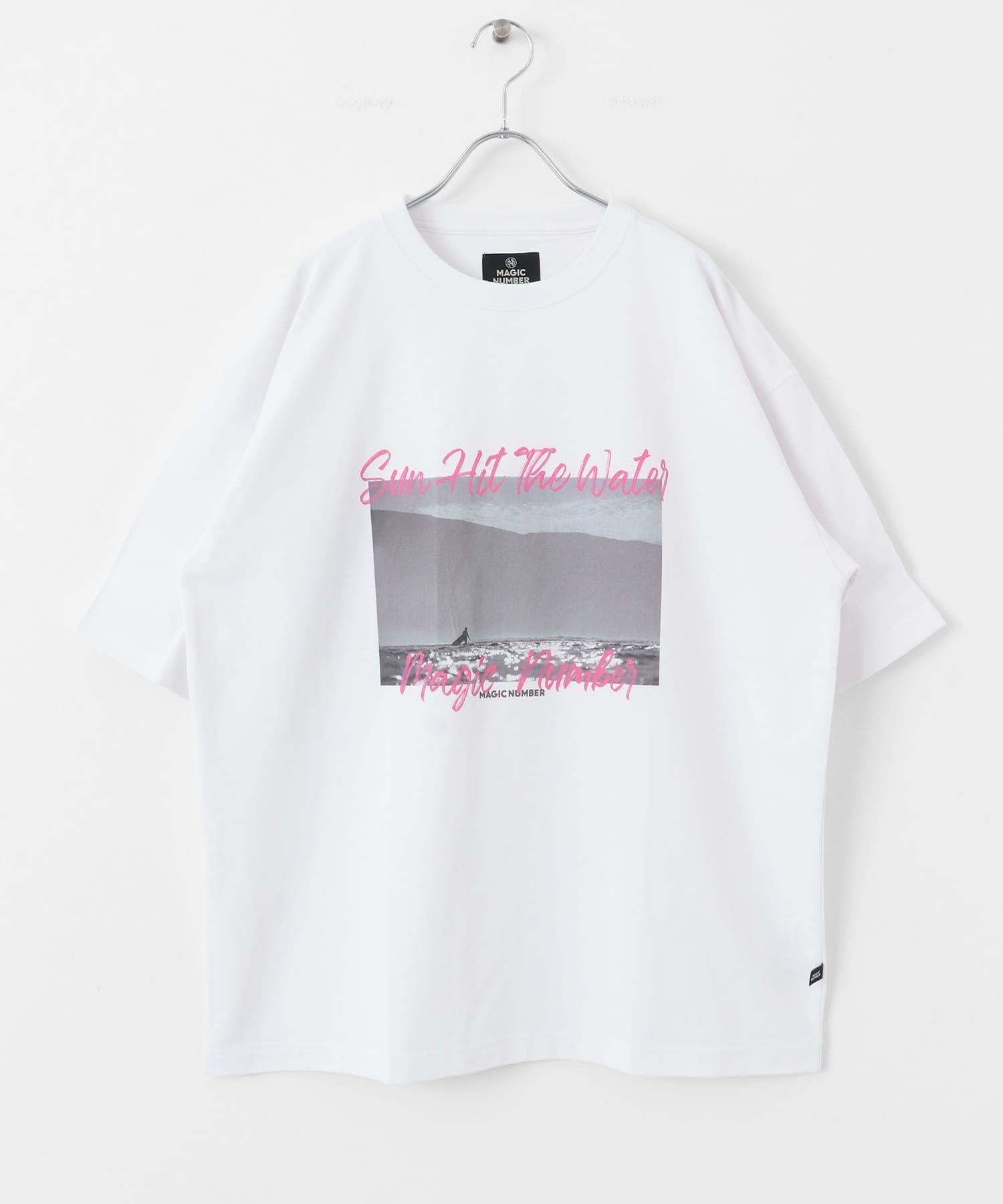 寬鬆的 T 恤上印有一張清新的海景照片。