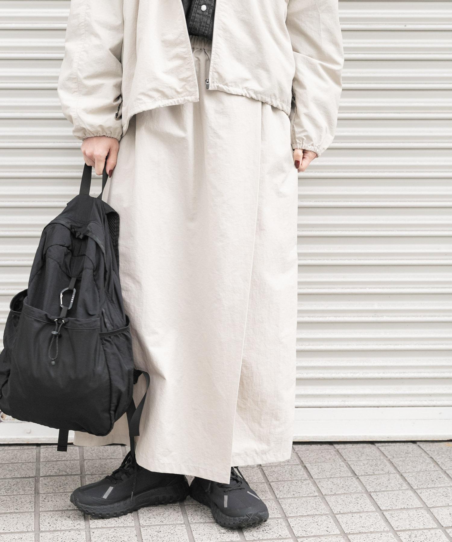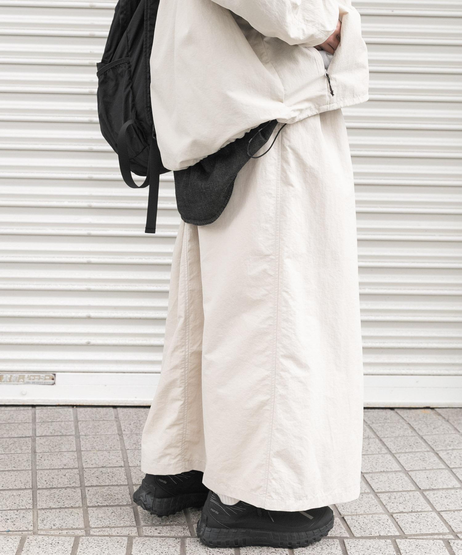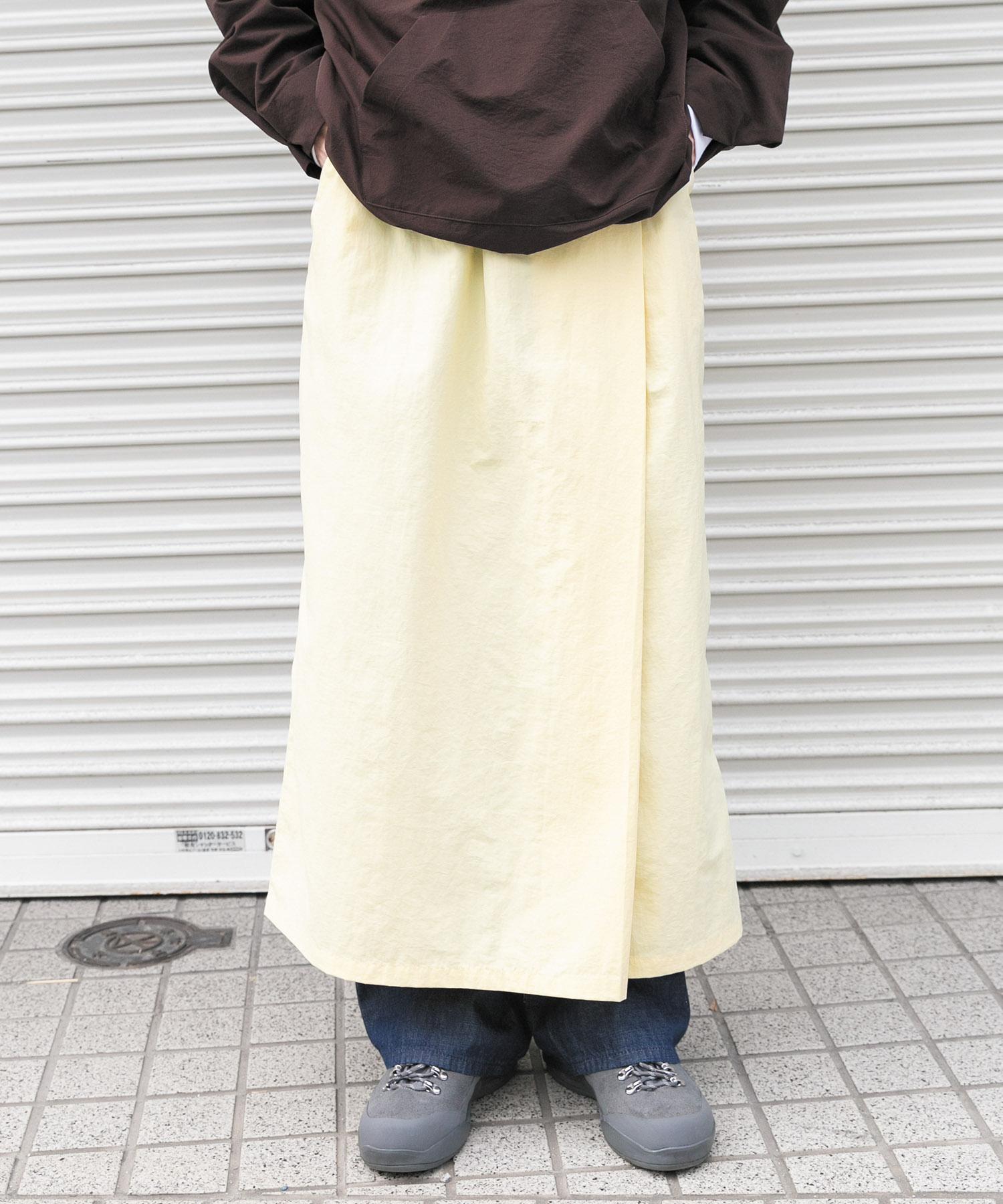 這款採用褶襉設計的裹身裙由尼龍 Tussah 製成,具有防水和防紫外線功能,乾爽的觸感帶來涼爽清爽的感覺。腰部可通過抽繩規格調節大小,褶襉後部有開衩,方便活動,口袋袋面料採用網眼戶外規格,是一款不僅可用於海濱活動場景,也可用於日常的簡約desa。這款簡單的 desa゙in 不僅可用於水邊活動場景,也可用於日常使用。此外,還建議與長褲或緊身褲搭配使用。