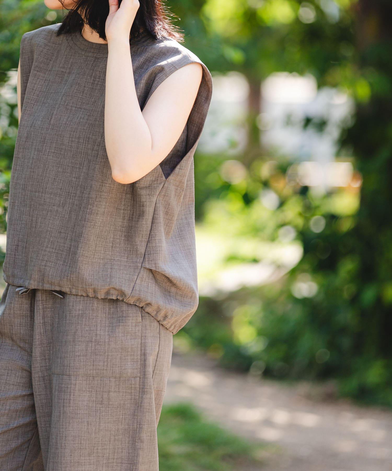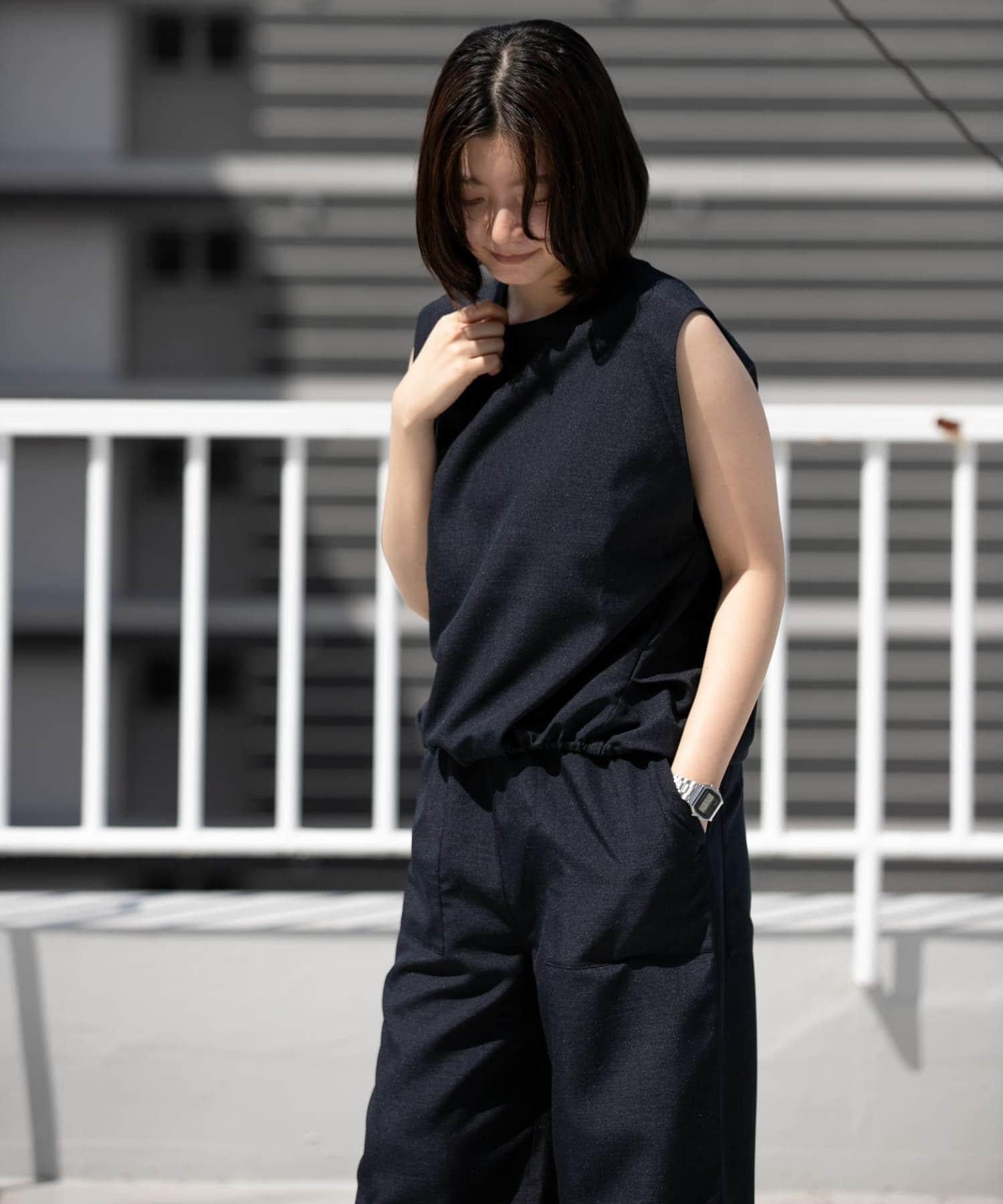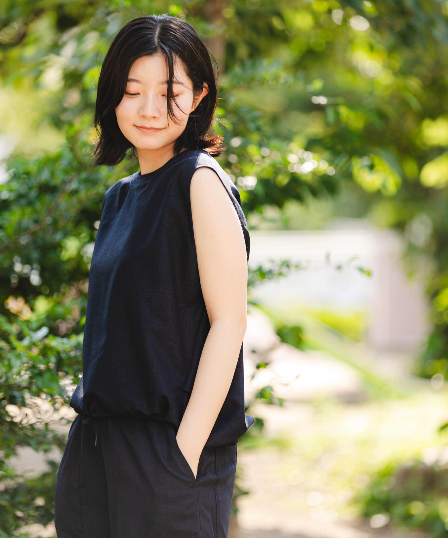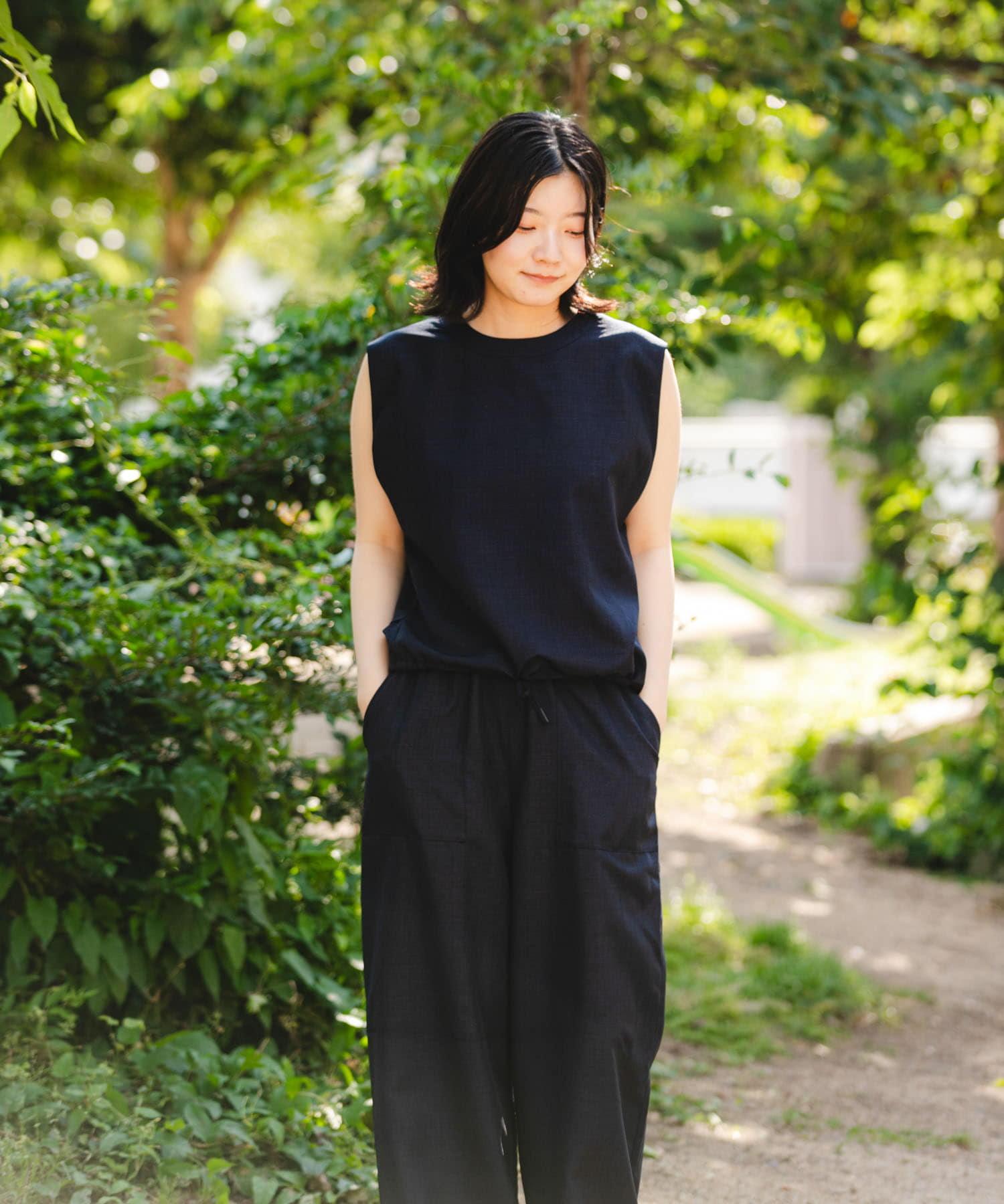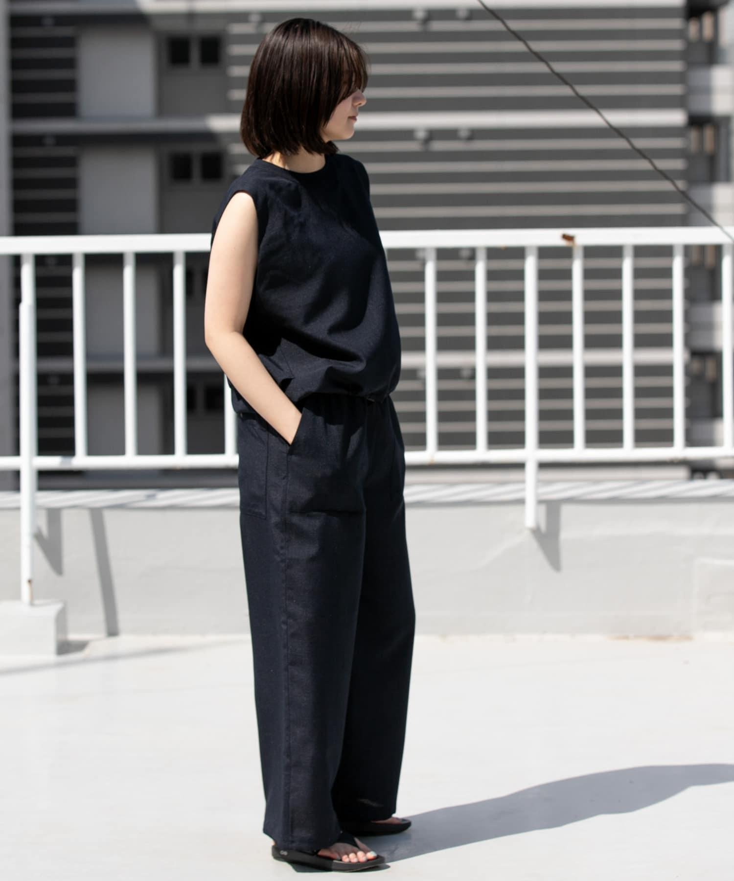 高捻亞麻類滌綸面料輕薄舒適,可一直穿到仲夏。上衣採用方形設計,法式袖子,可作為馬甲搭配長袖或短袖穿著,也可作為無袖搭配背心或吊帶衫穿著。後開襟有 EKAL 標誌。下襬還可以通過抽繩下襬和褶襉來改變輪廓。可與同種面料的長褲搭配,也可像 Salopette 一樣穿著。別緻的木色使其適用於各種夏季活動和市內穿著,不會過於隨意。