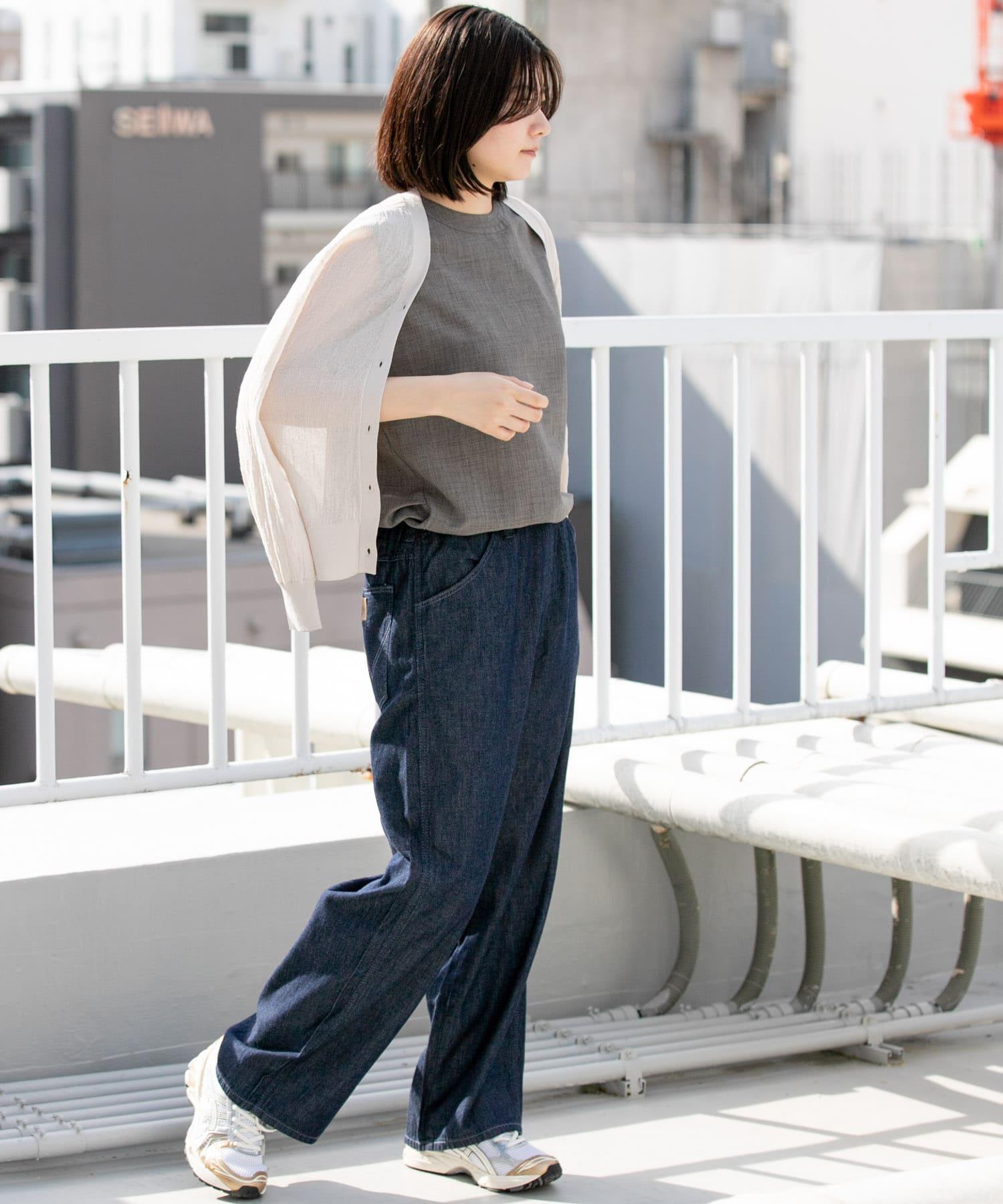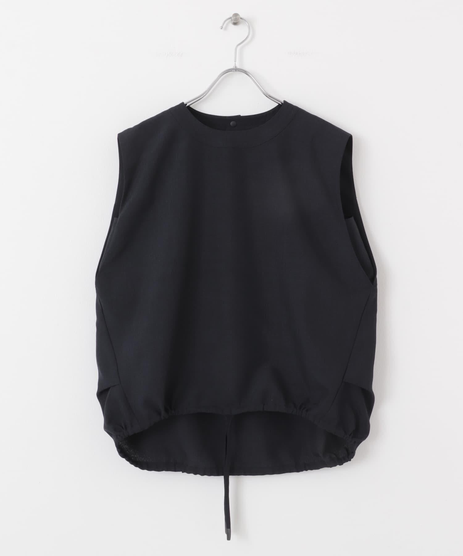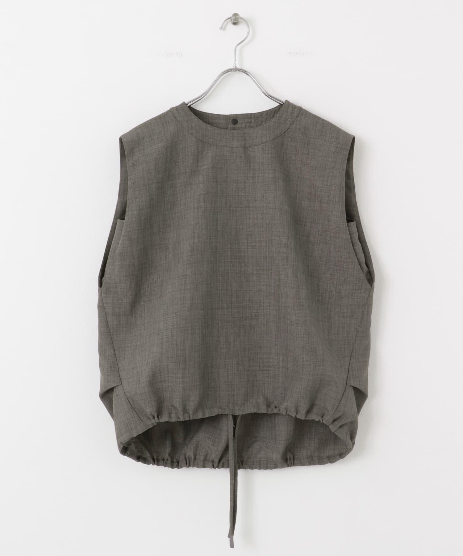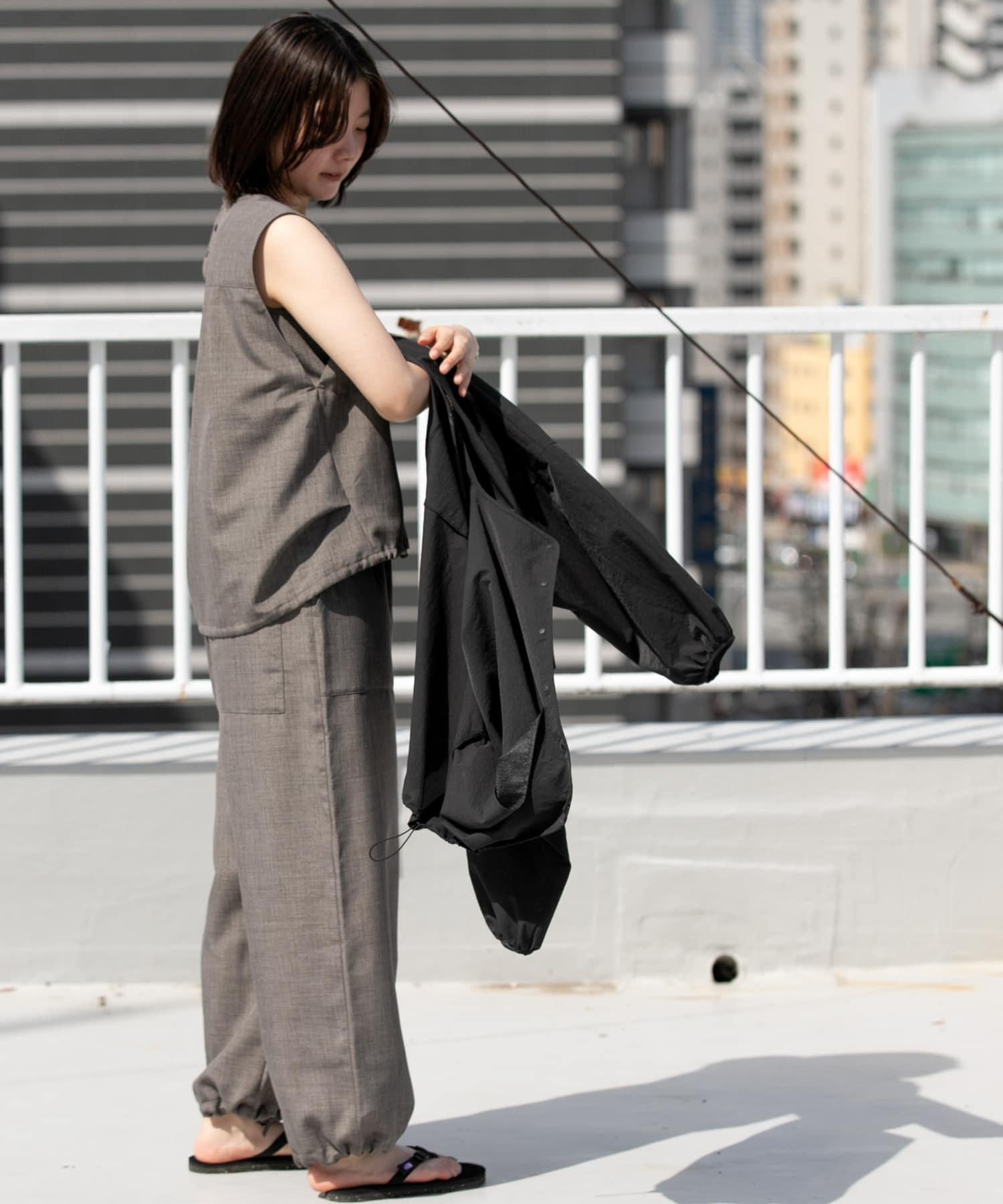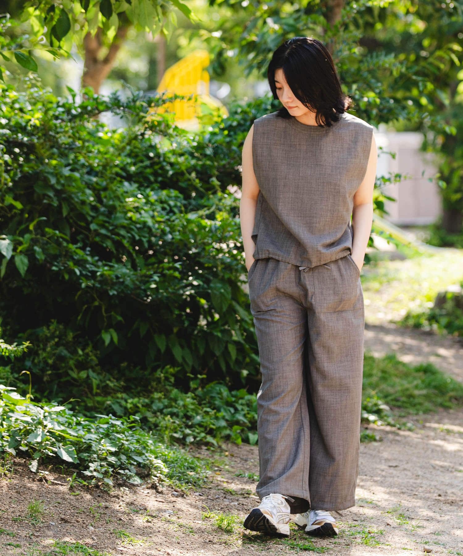 高捻亞麻類滌綸面料輕薄舒適,可一直穿到仲夏。上衣採用方形設計,法式袖子,可作為馬甲搭配長袖或短袖穿著,也可作為無袖搭配背心或吊帶衫穿著。後開襟有 EKAL 標誌。下襬還可以通過抽繩下襬和褶襉來改變輪廓。可與同種面料的長褲搭配,也可像 Salopette 一樣穿著。別緻的木色使其適用於各種夏季活動和市內穿著,不會過於隨意。
