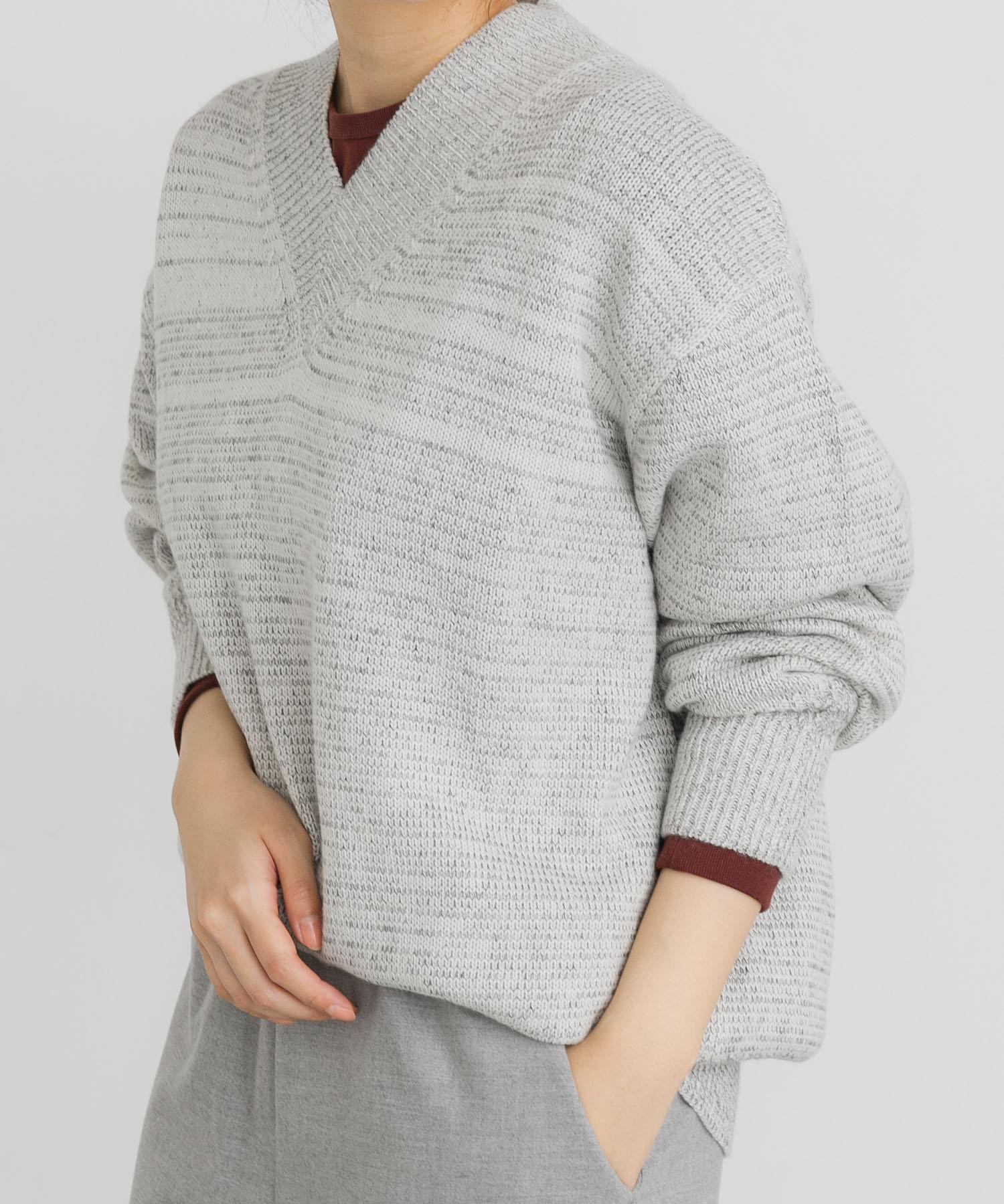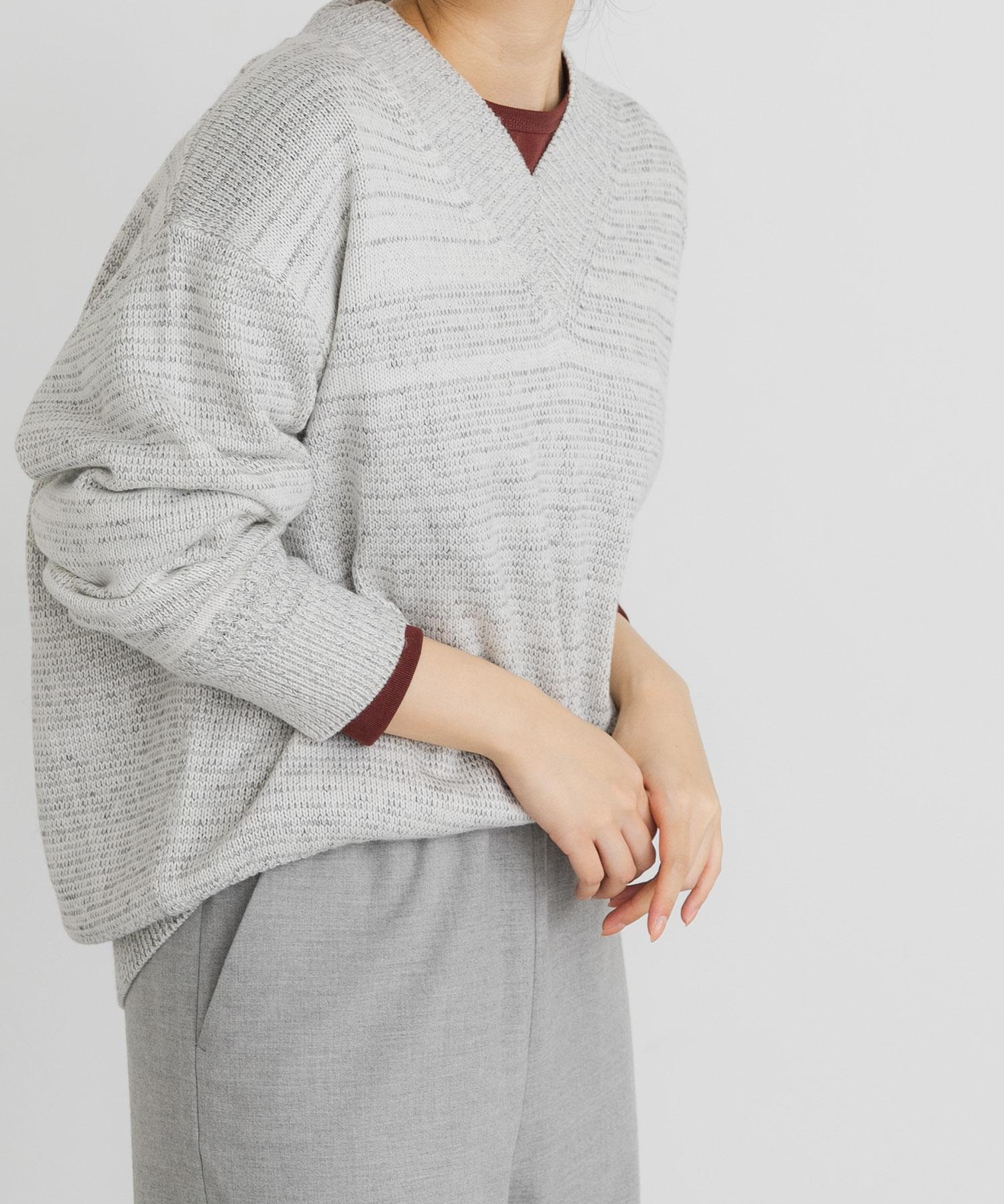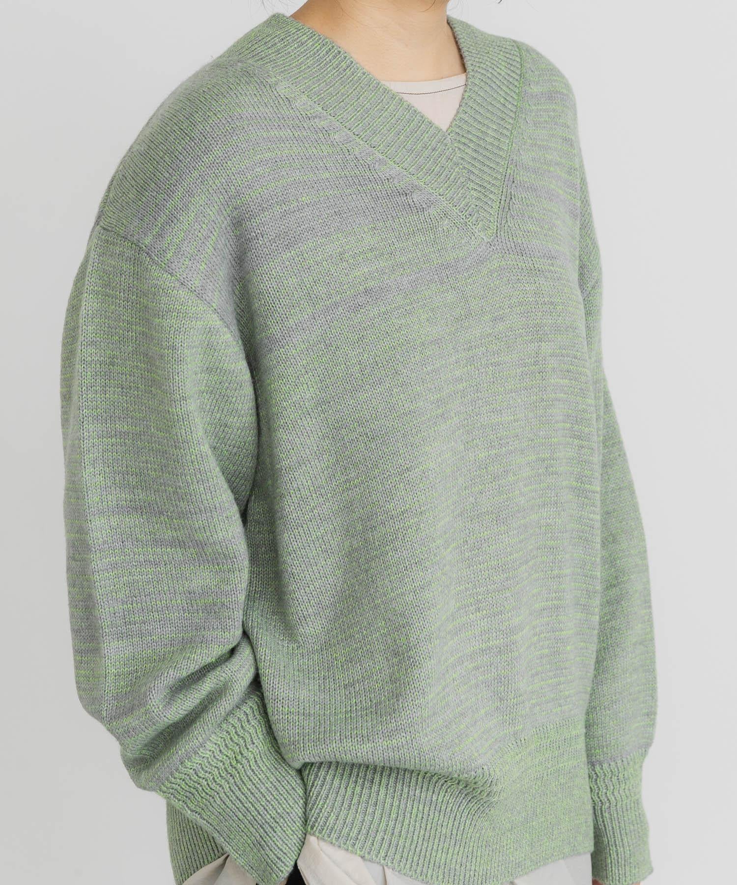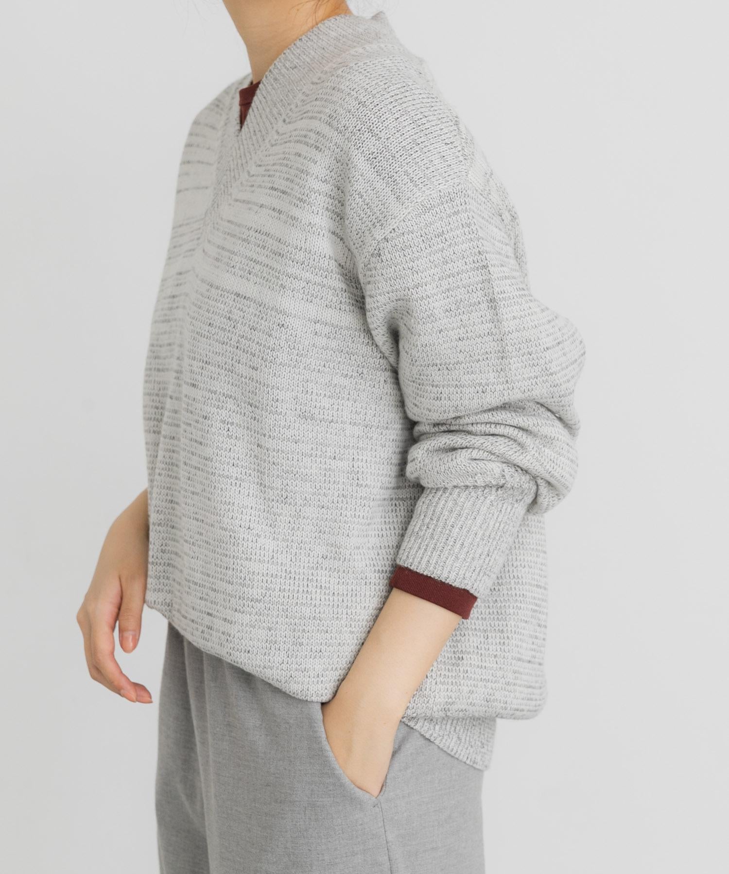 原創紗線由粗支紗和細支回收滌綸紗拼接而成。 通過改變編織技術來表現邊線風格,創造出不對稱的圖案感覺。 簡潔的 V 領設計便於搭配任何下裝。
