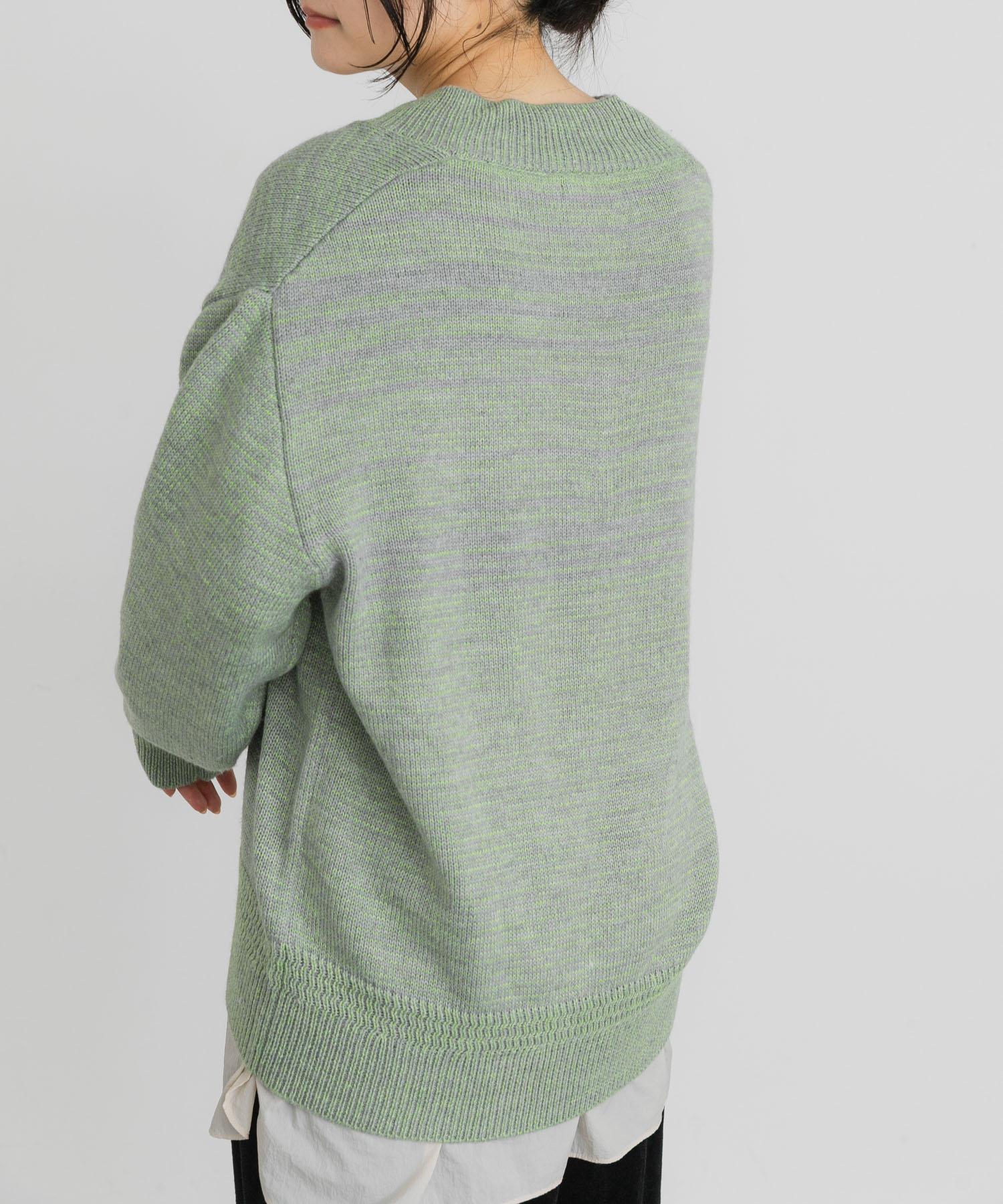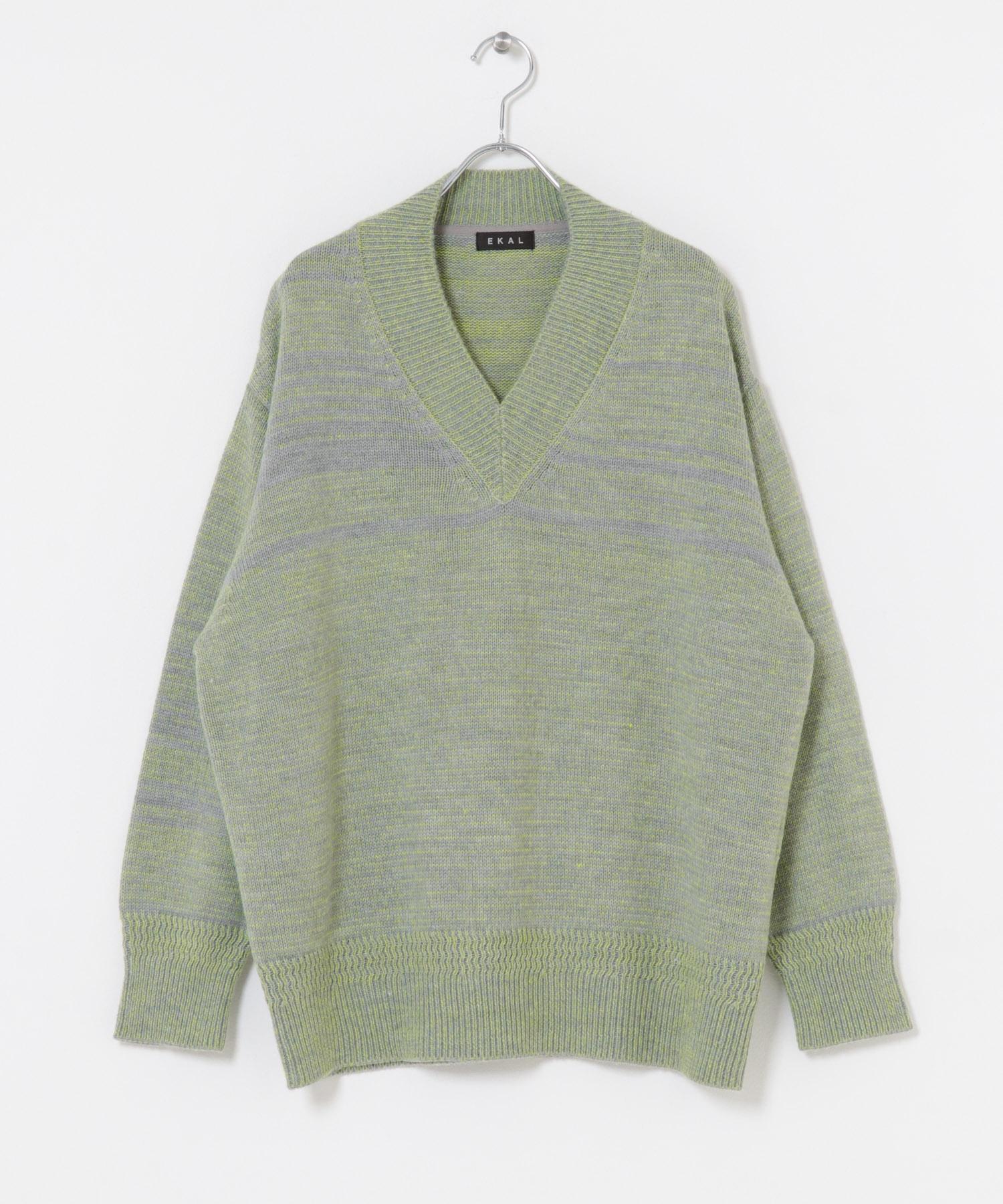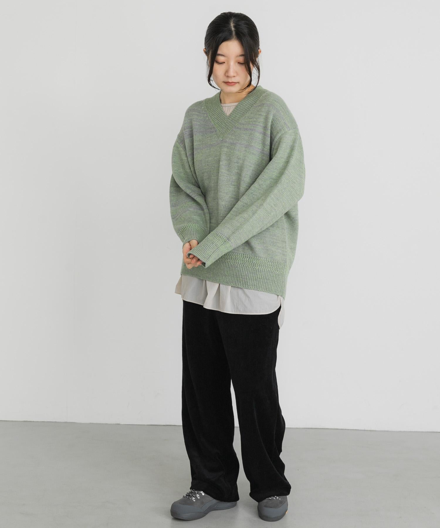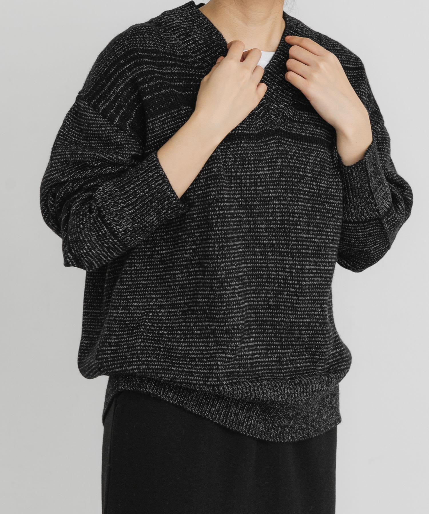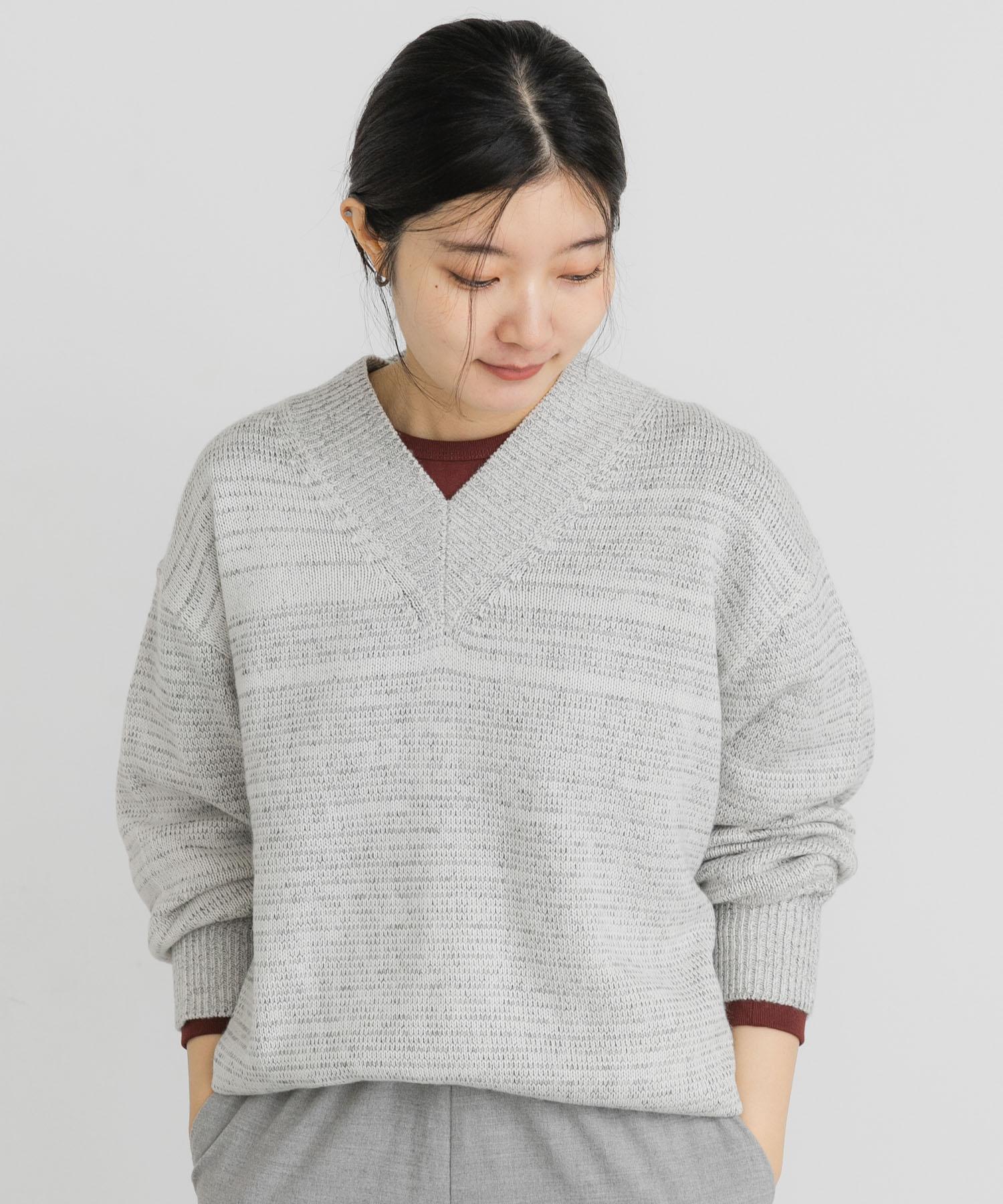 原創紗線由粗支紗和細支回收滌綸紗拼接而成。 通過改變編織技術來表現邊線風格,創造出不對稱的圖案感覺。 簡潔的 V 領設計便於搭配任何下裝。