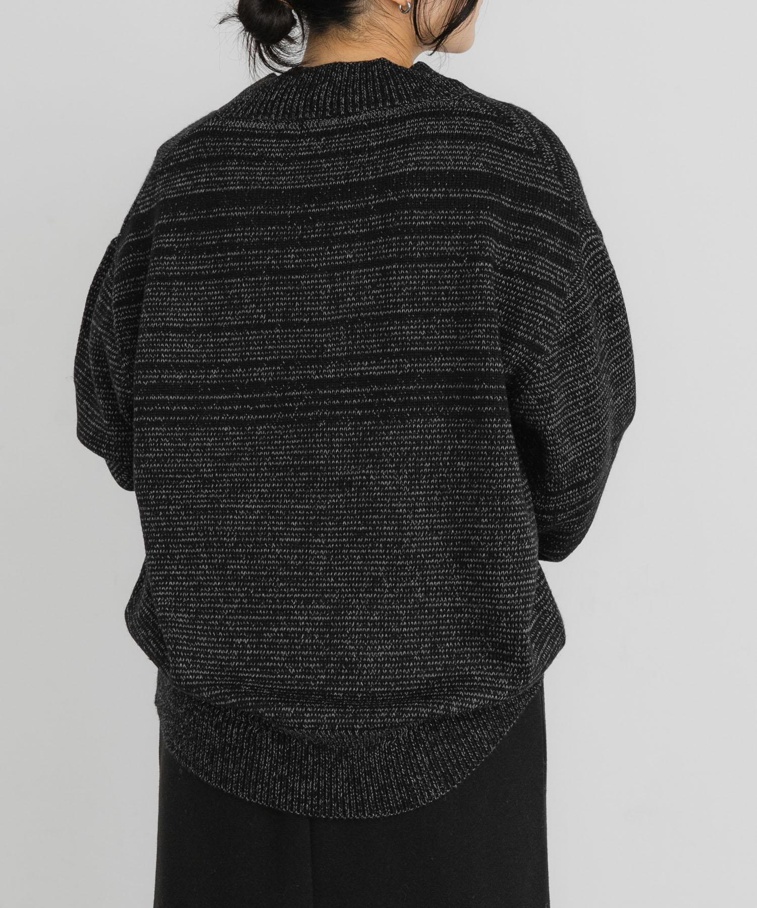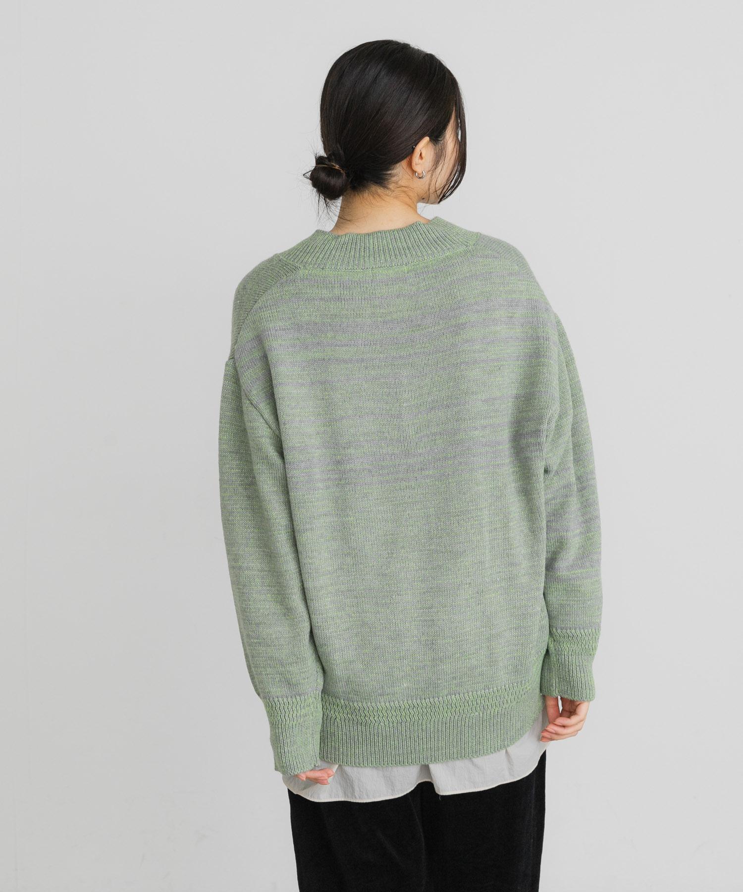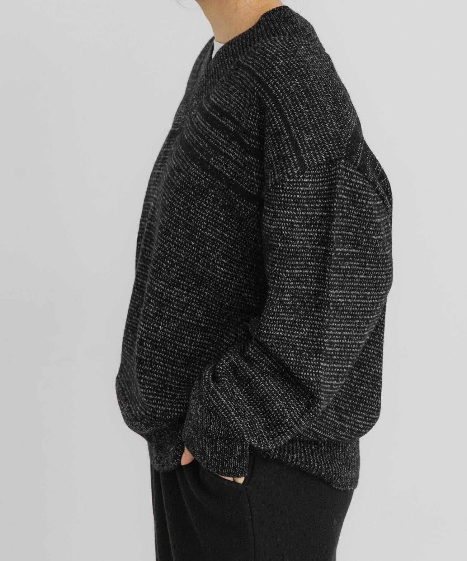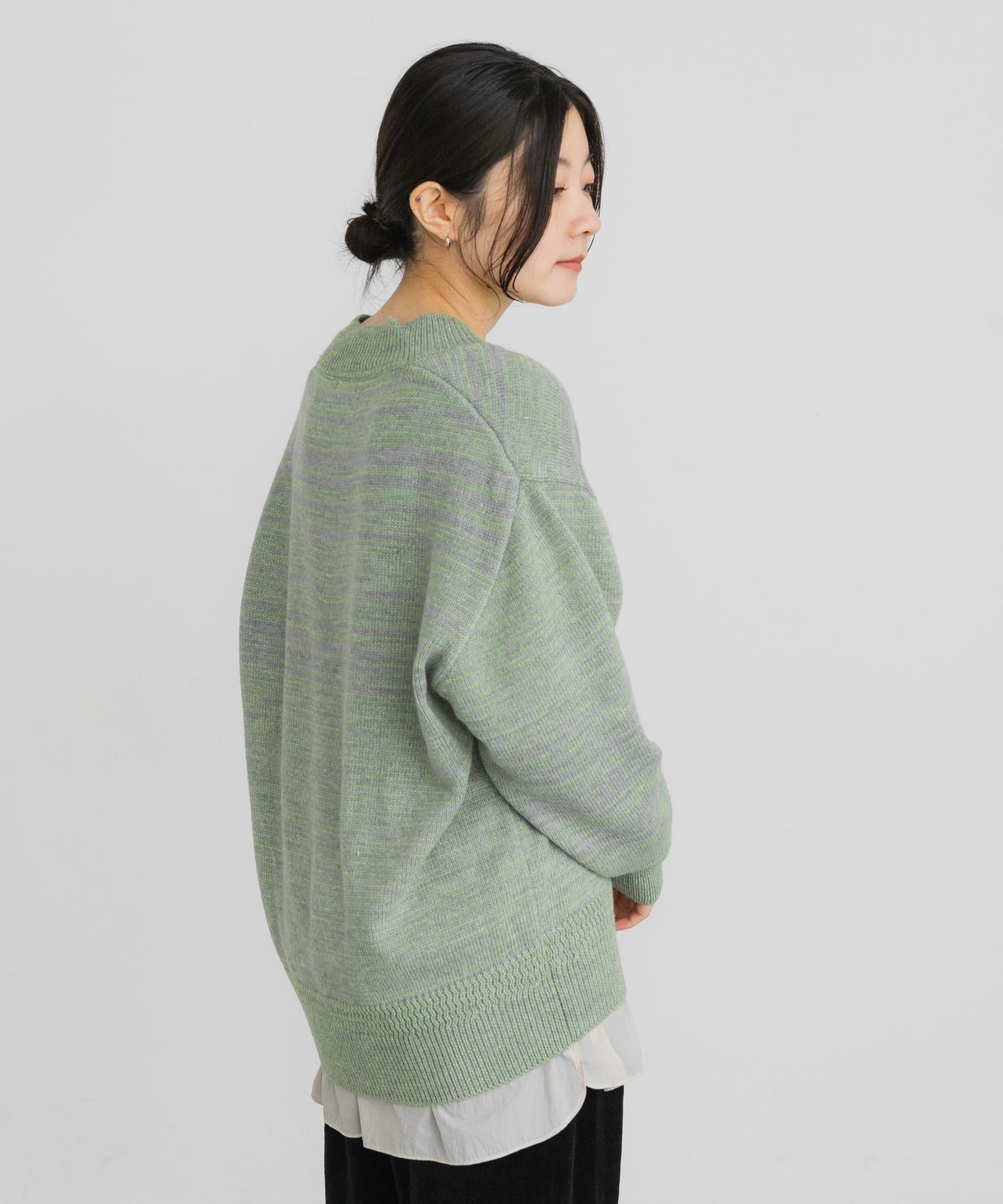 原創紗線由粗支紗和細支回收滌綸紗拼接而成。 通過改變編織技術來表現邊線風格,創造出不對稱的圖案感覺。 簡潔的 V 領設計便於搭配任何下裝。
