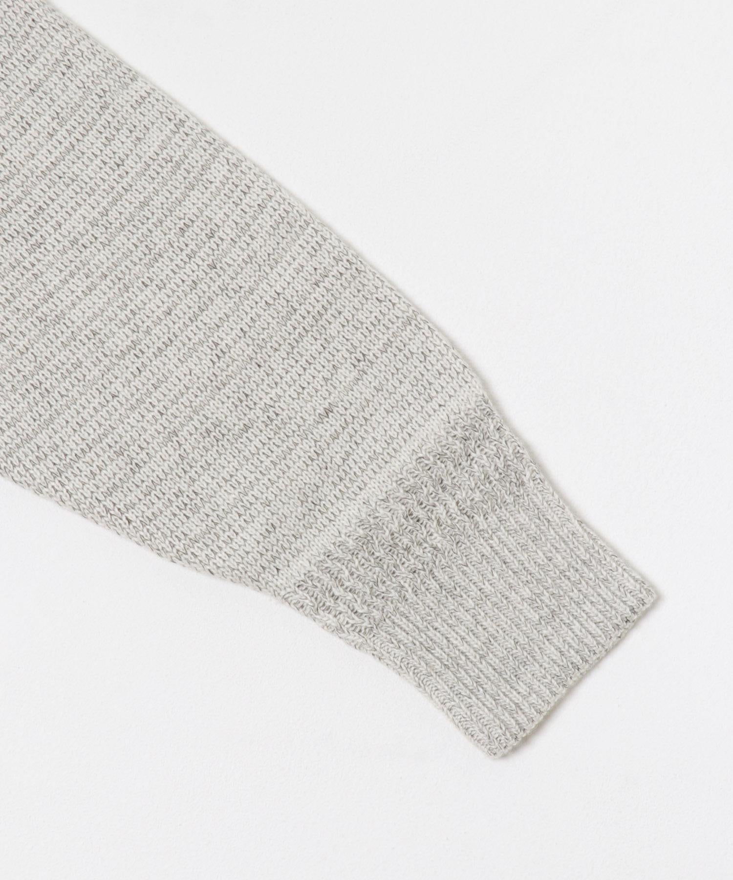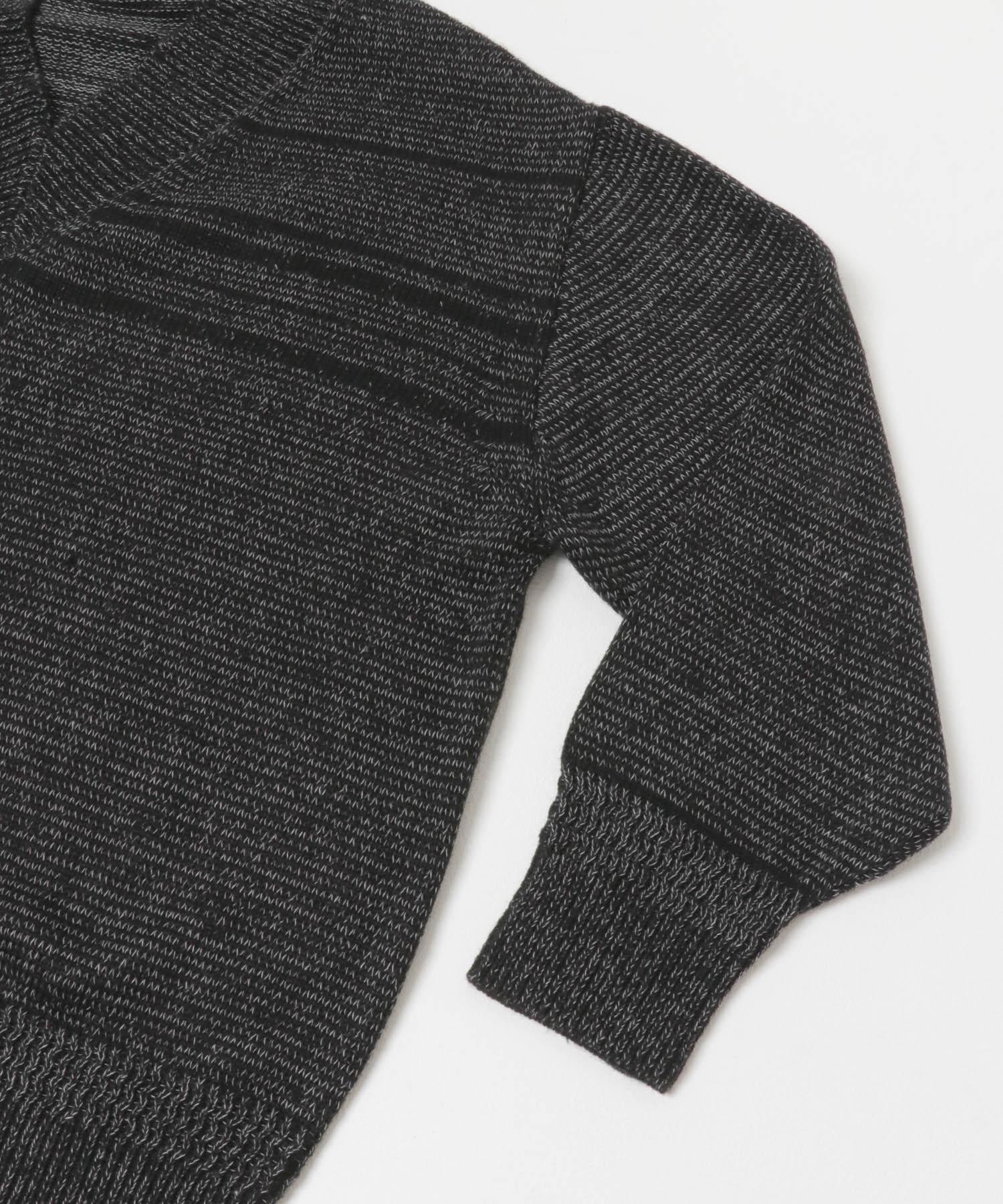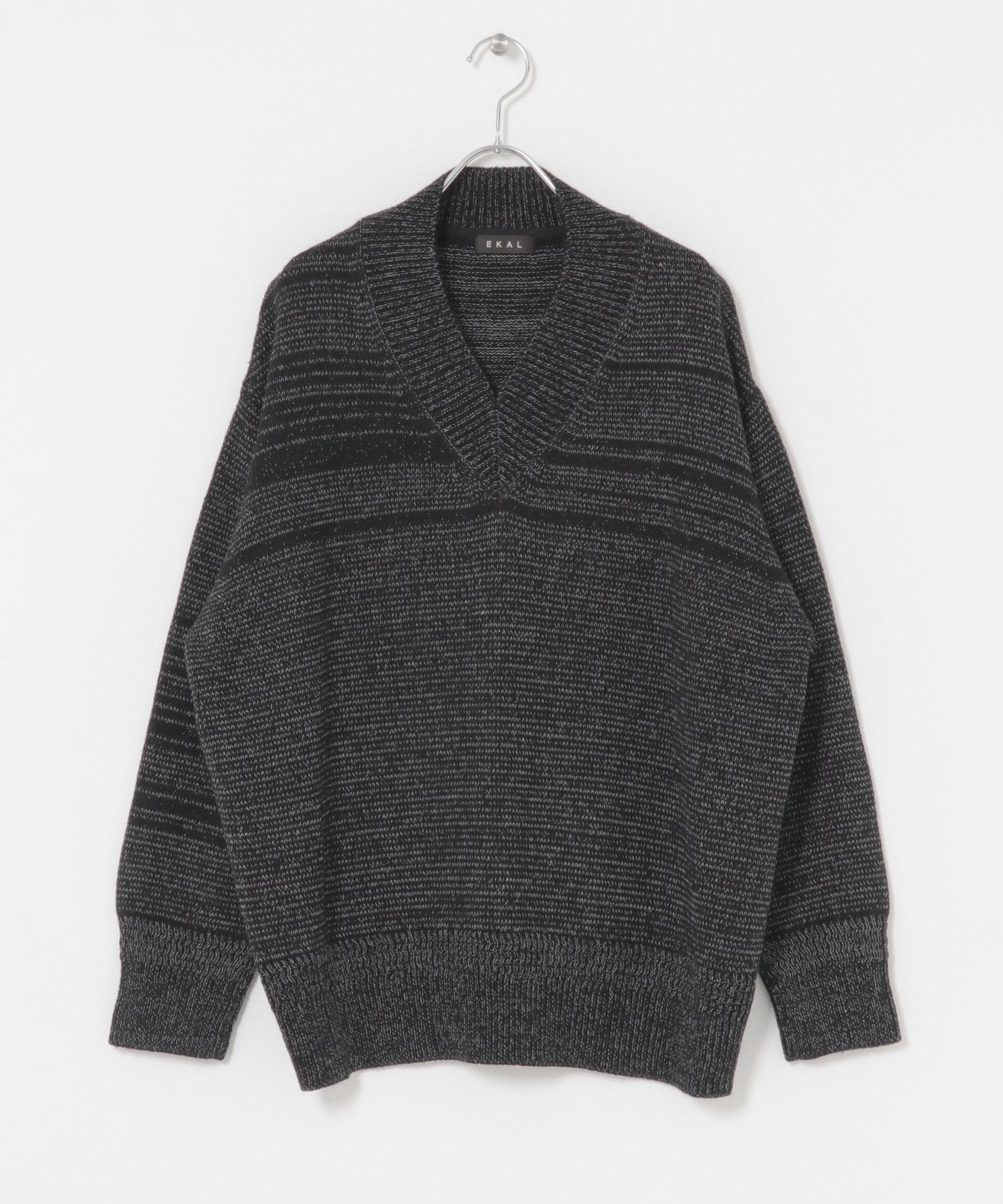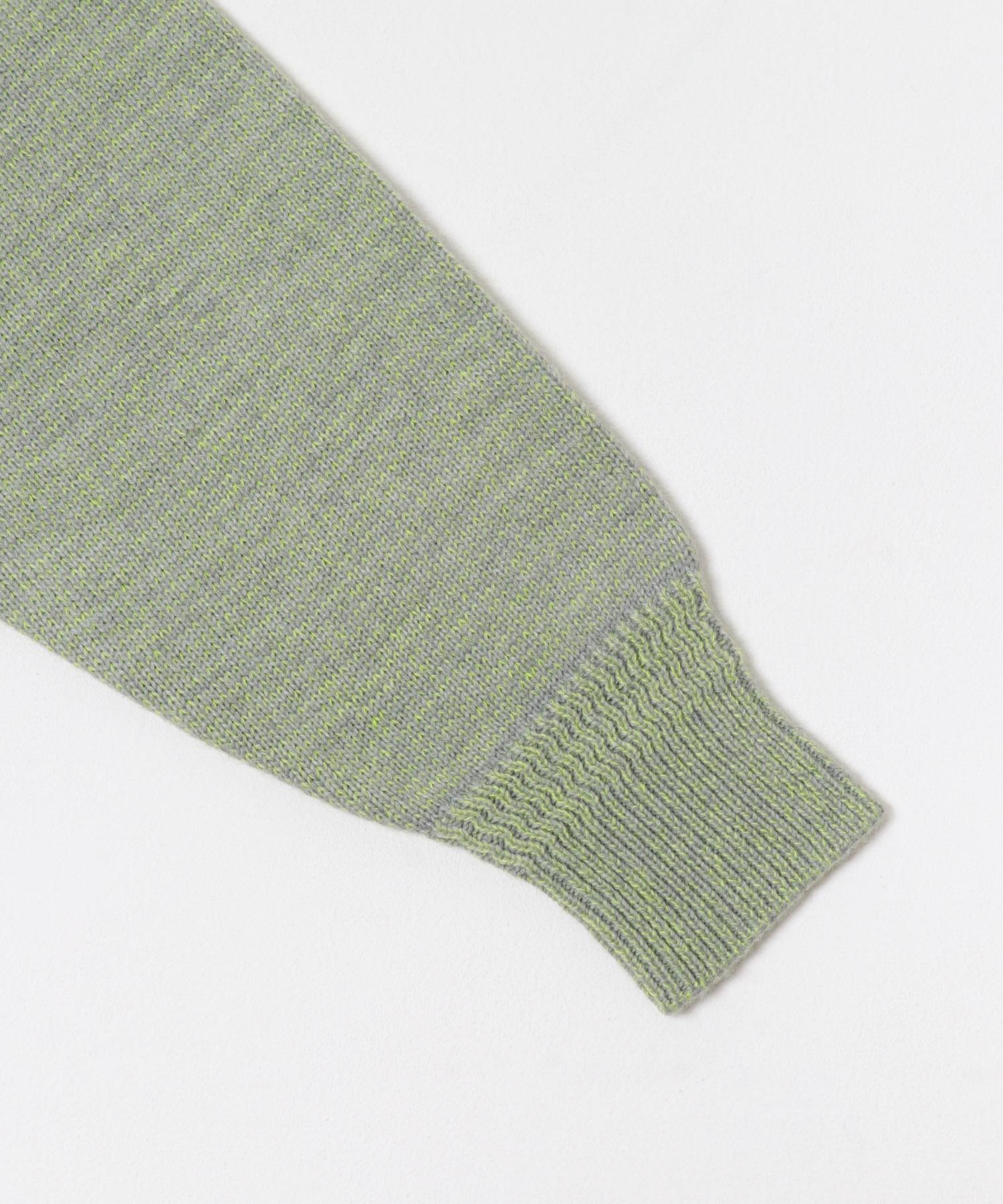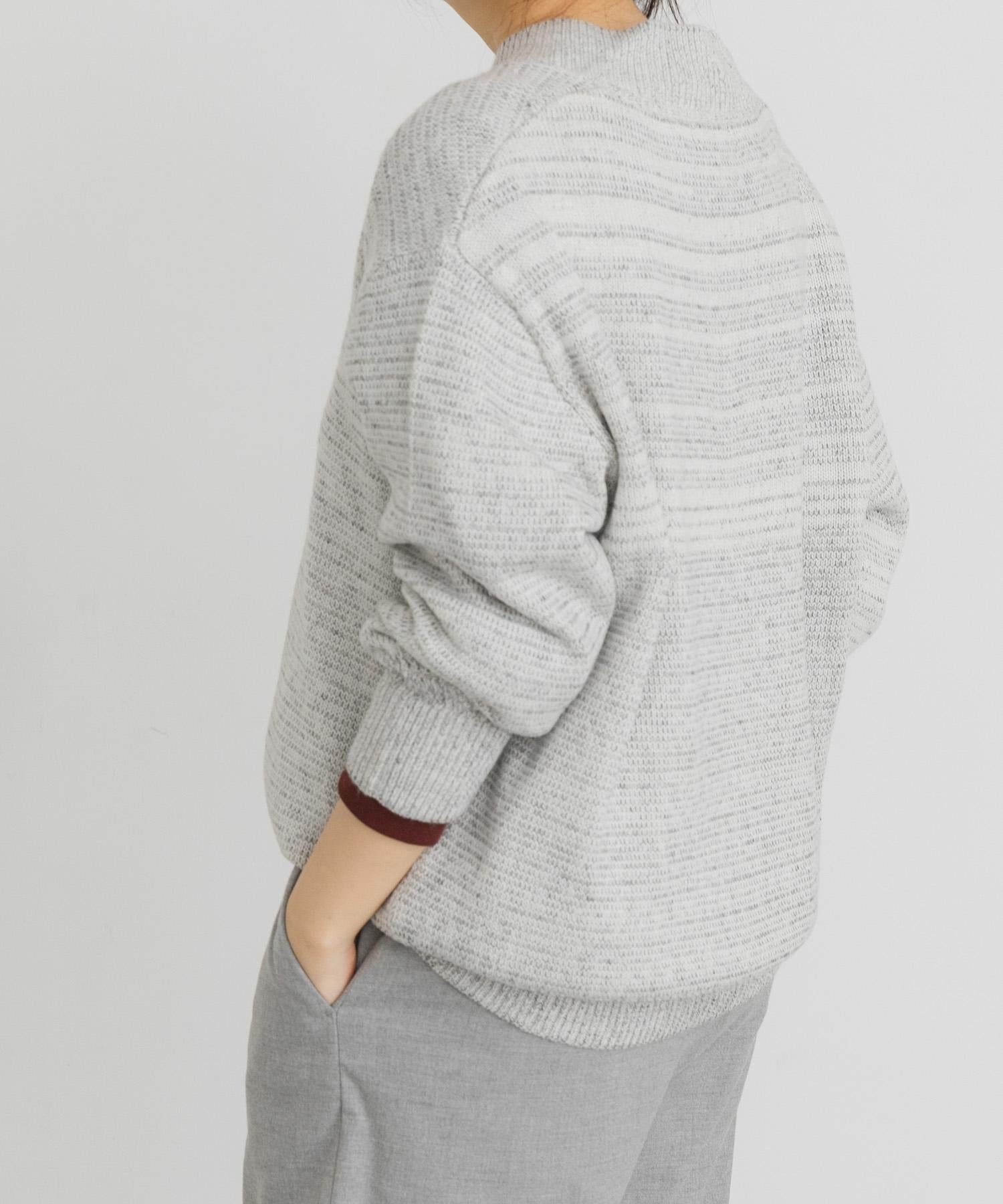 原創紗線由粗支紗和細支回收滌綸紗拼接而成。 通過改變編織技術來表現邊線風格,創造出不對稱的圖案感覺。 簡潔的 V 領設計便於搭配任何下裝。