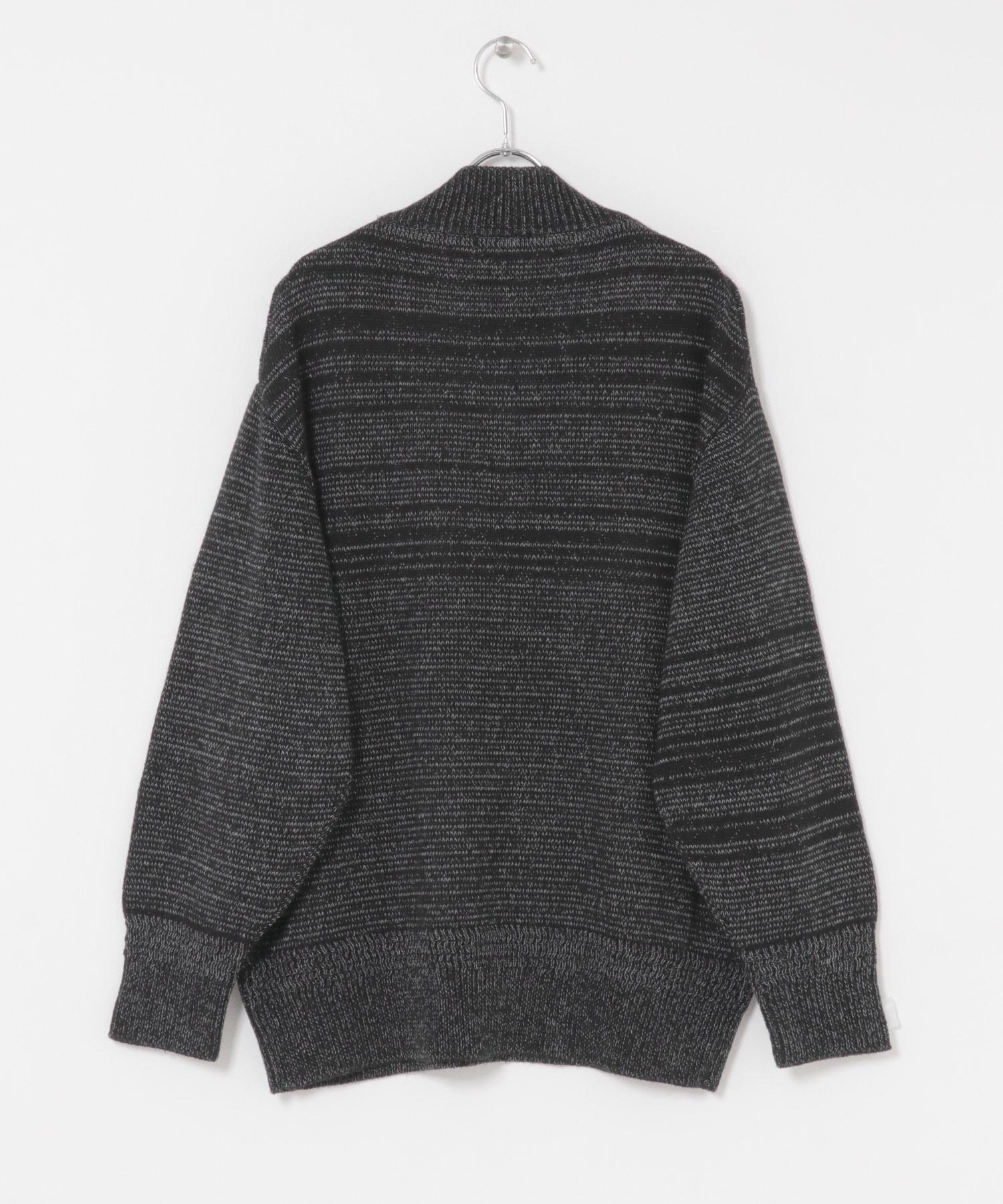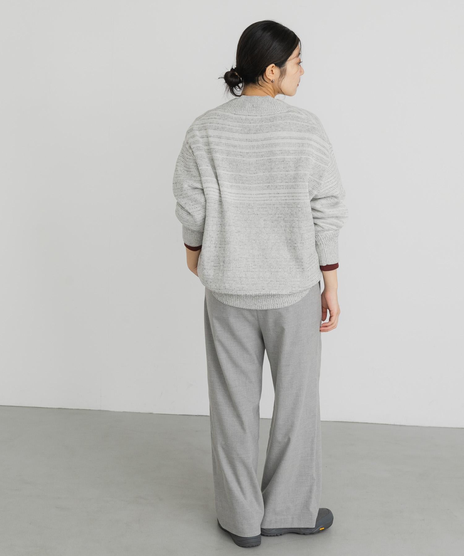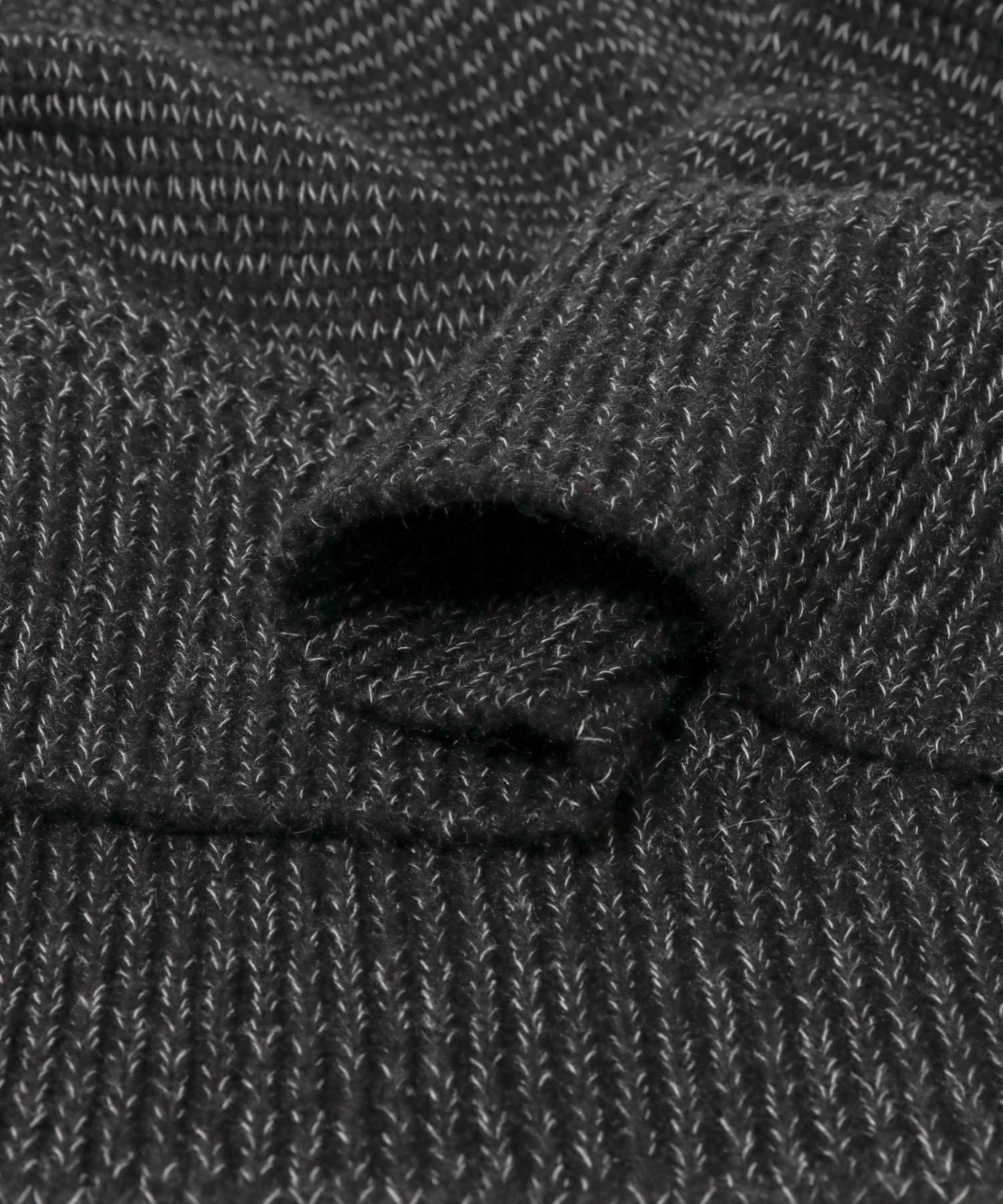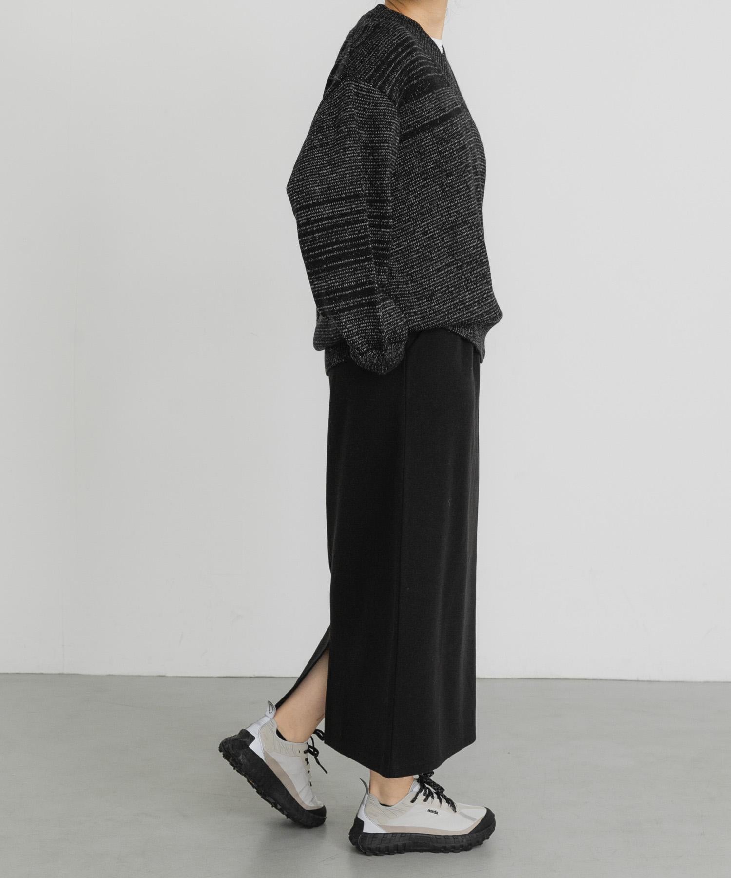 原創紗線由粗支紗和細支回收滌綸紗拼接而成。 通過改變編織技術來表現邊線風格,創造出不對稱的圖案感覺。 簡潔的 V 領設計便於搭配任何下裝。