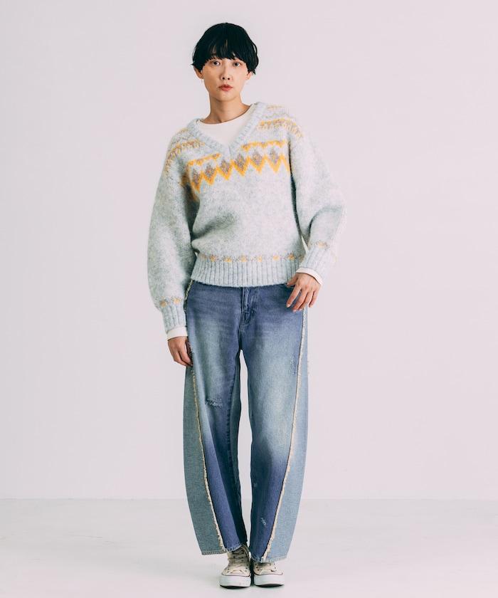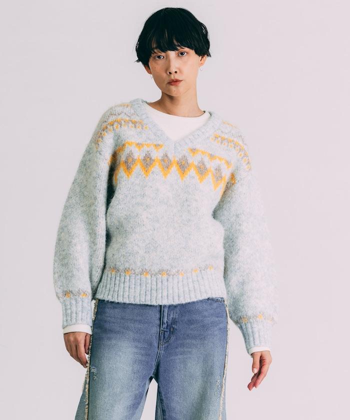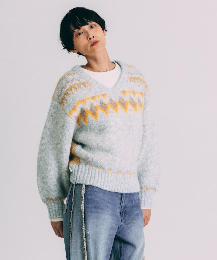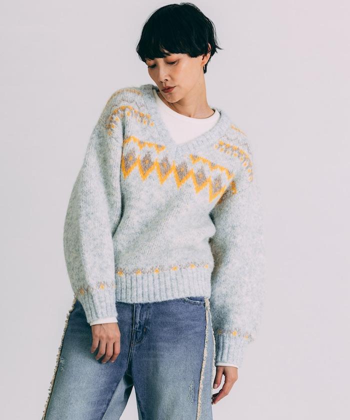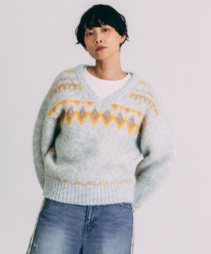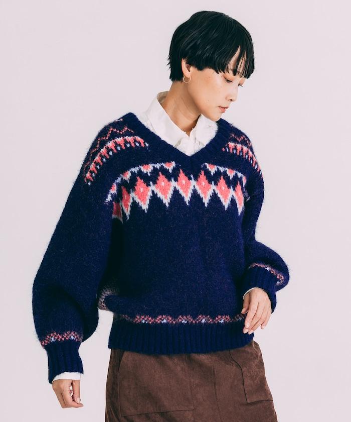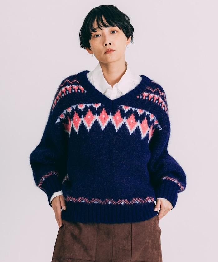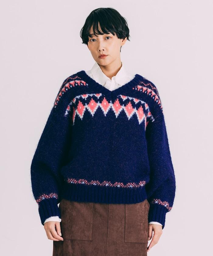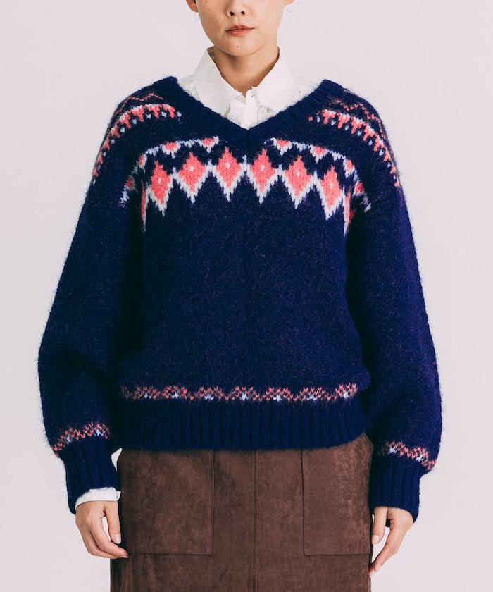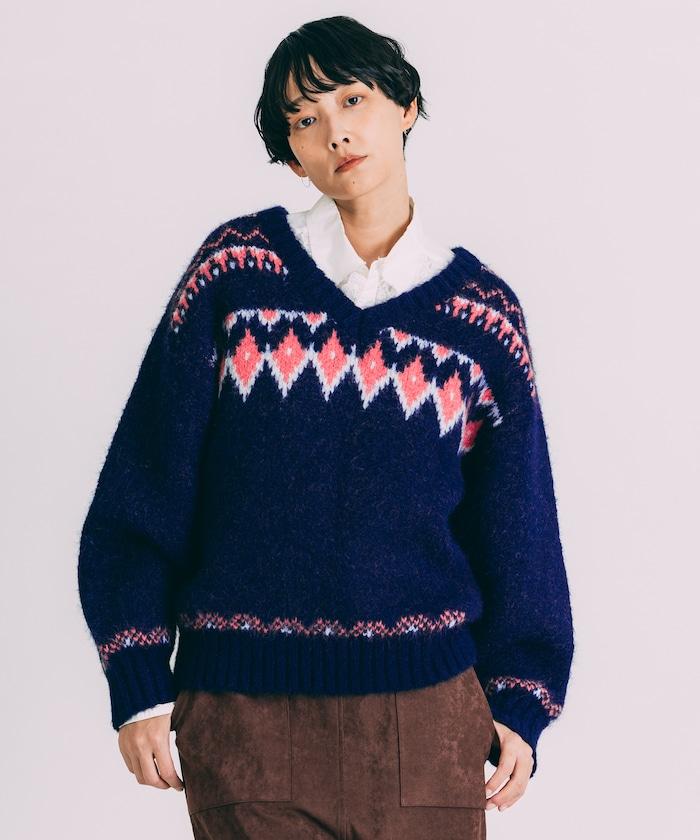 V領拼色北歐圖案針織衫