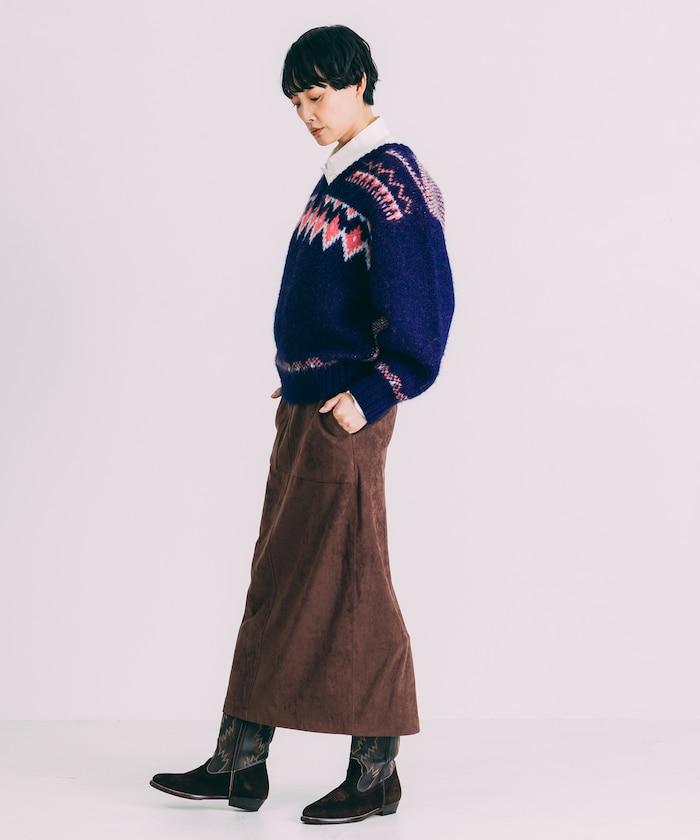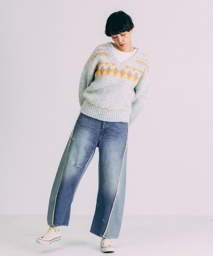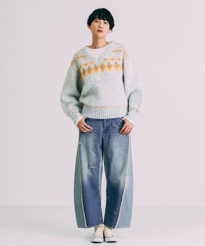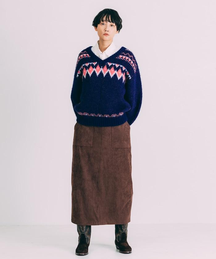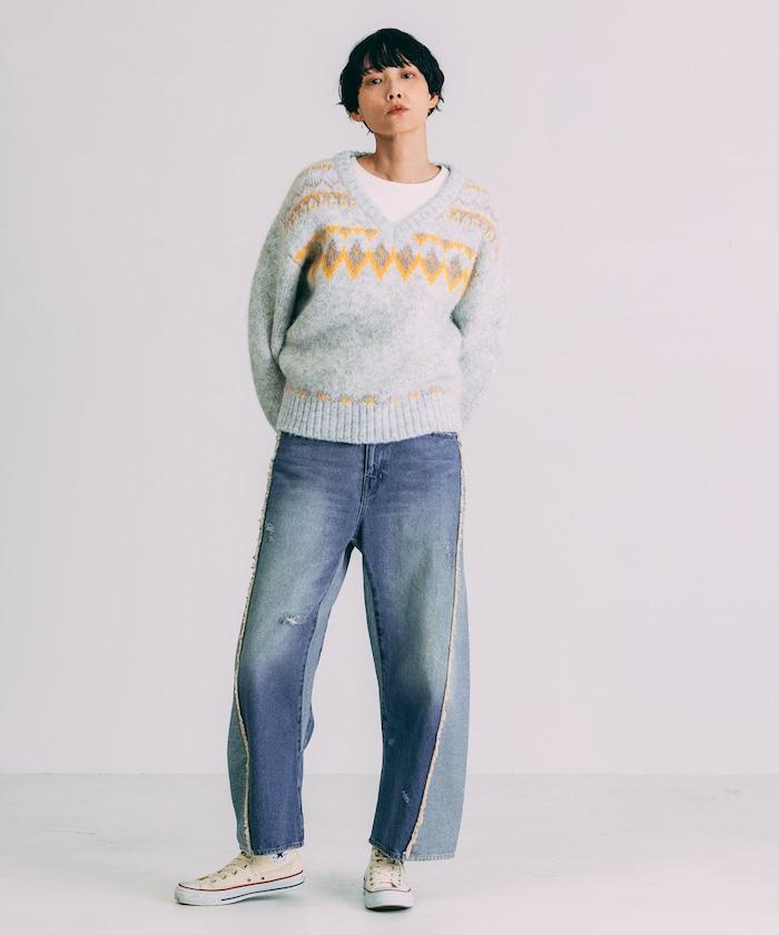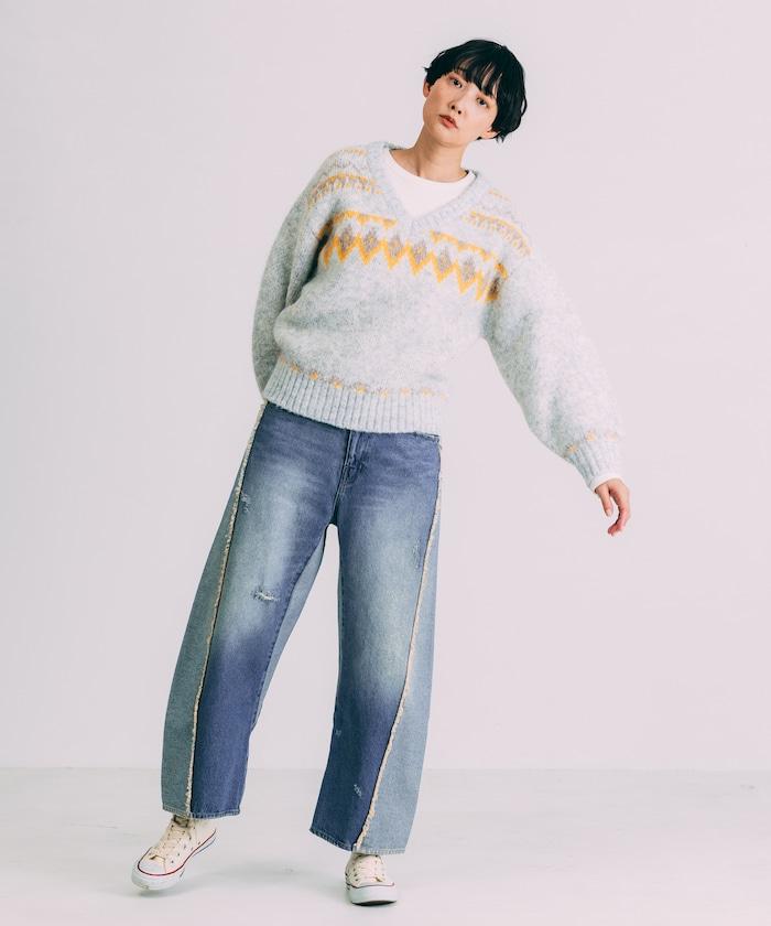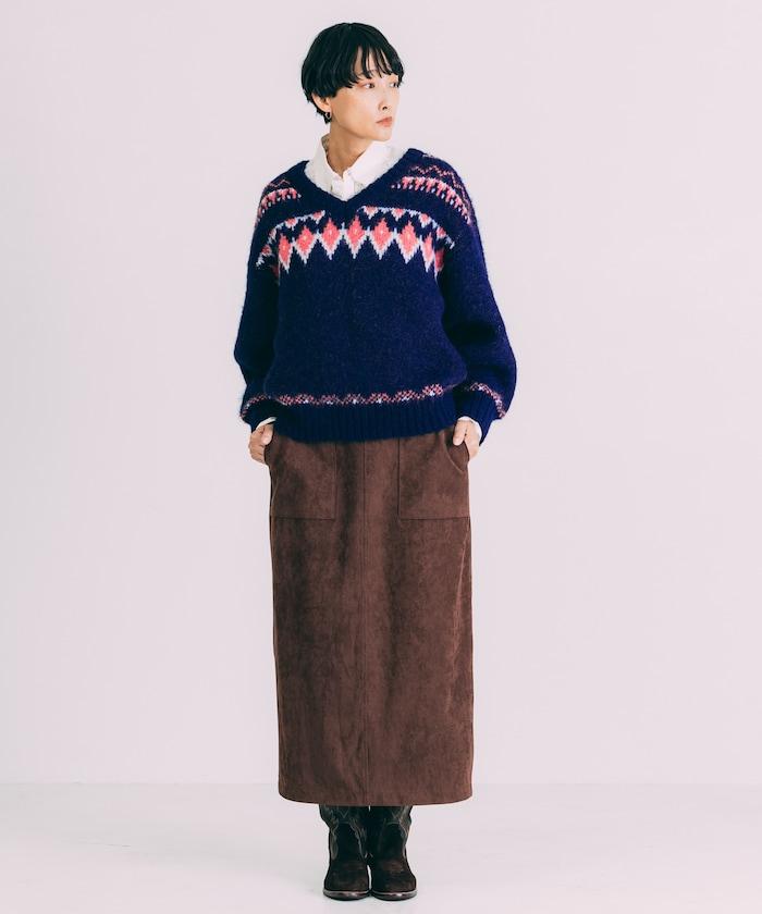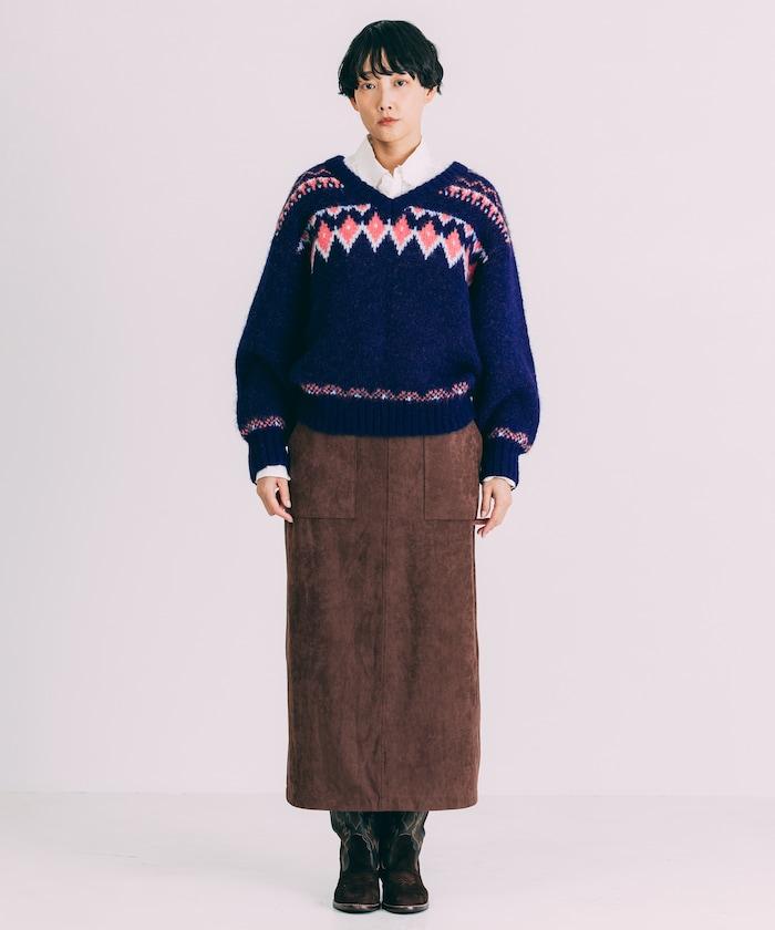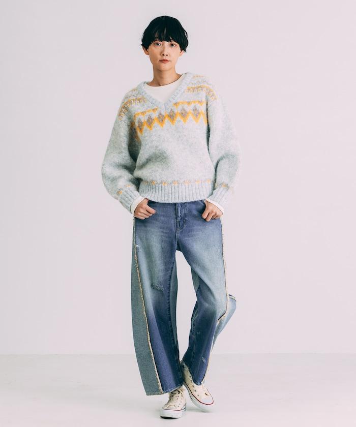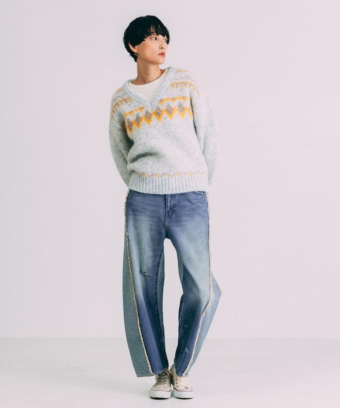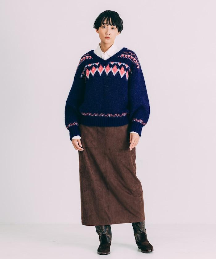 V領拼色北歐圖案針織衫