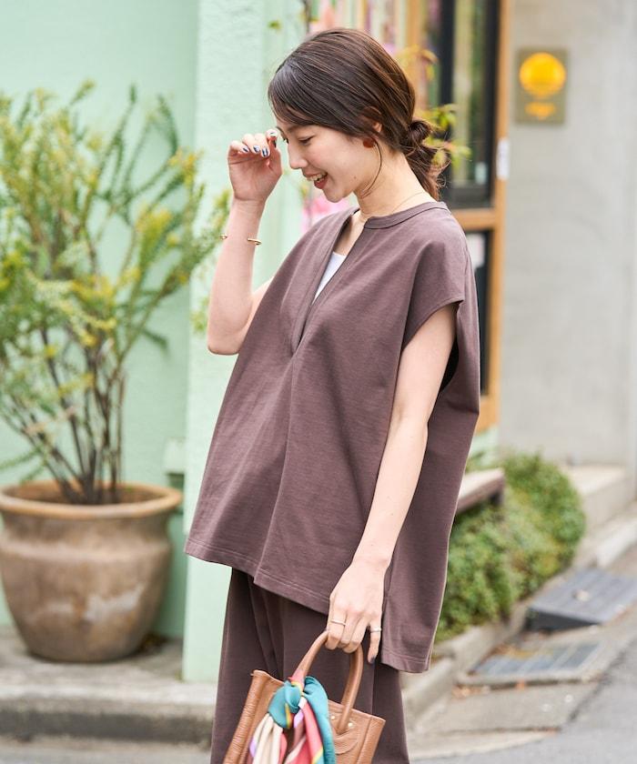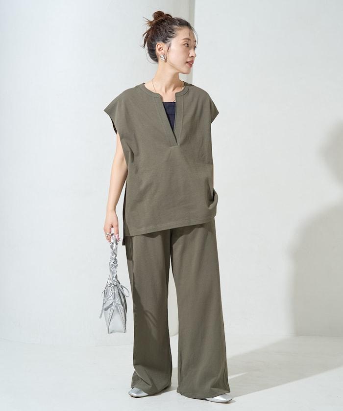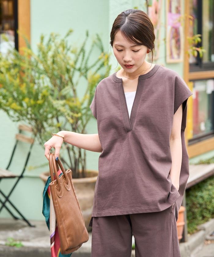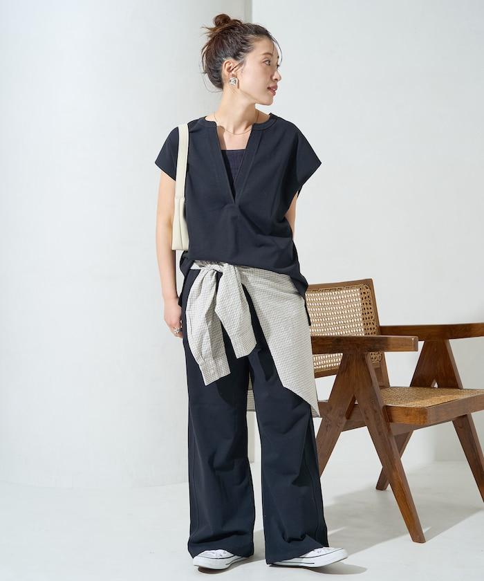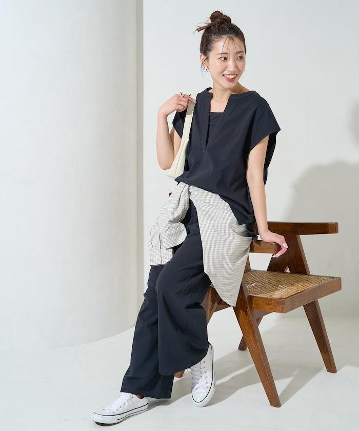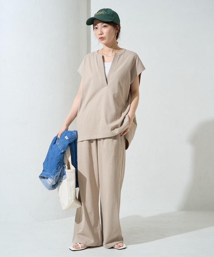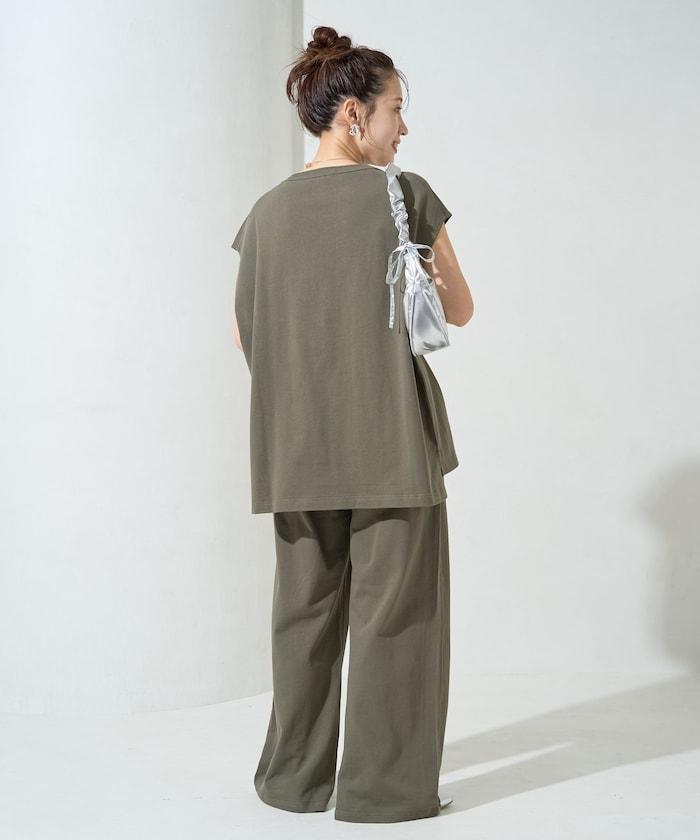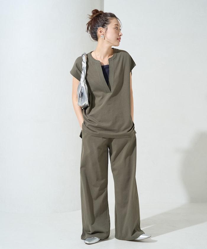 V領法式短袖褲裝套裝(T恤衫·休閒褲)
