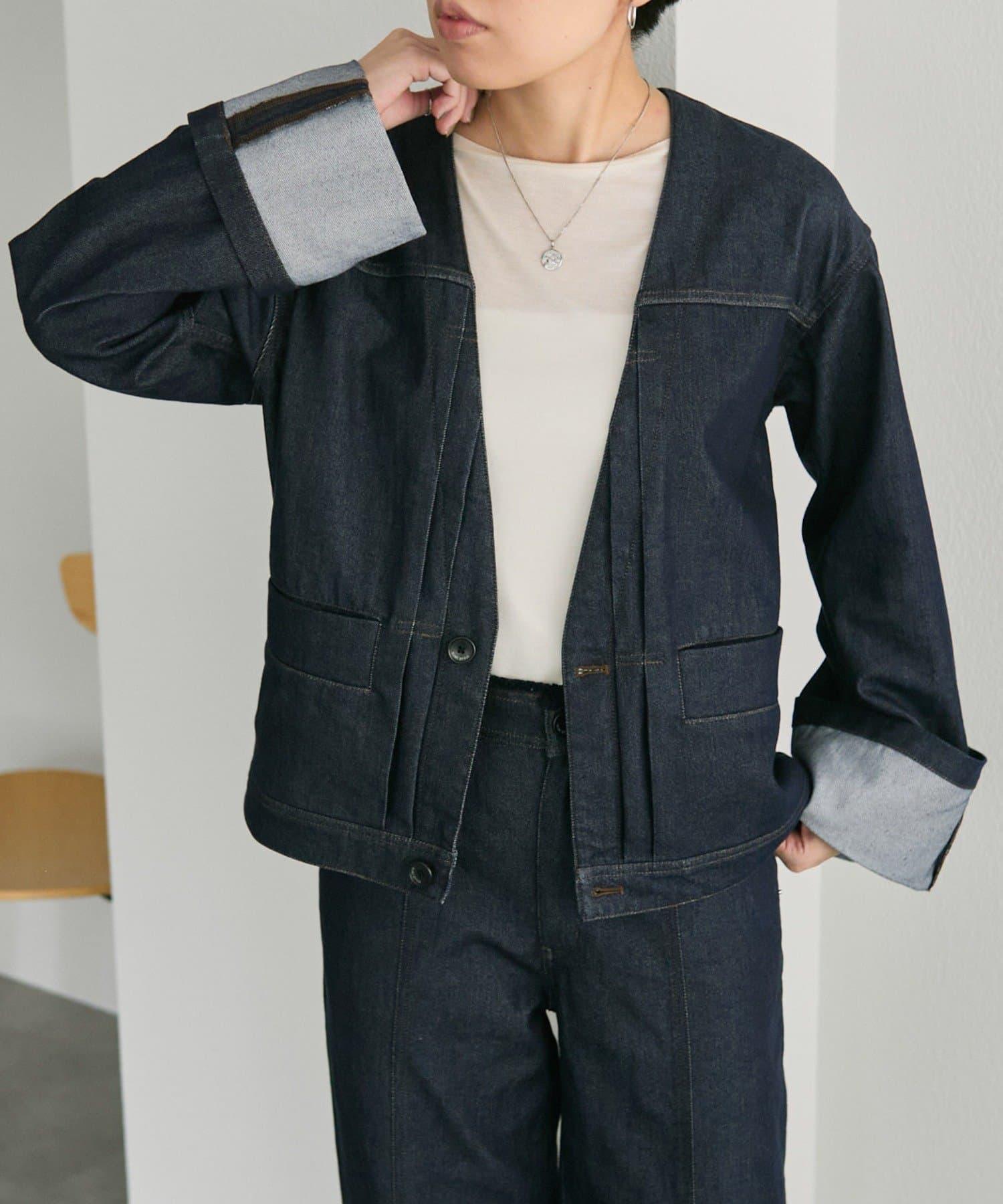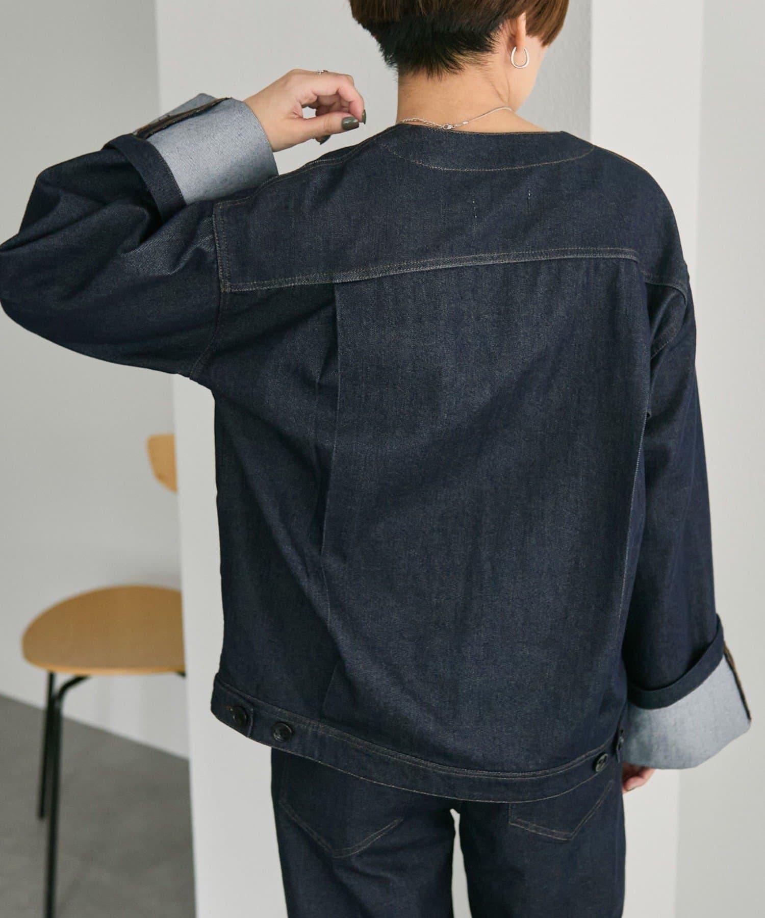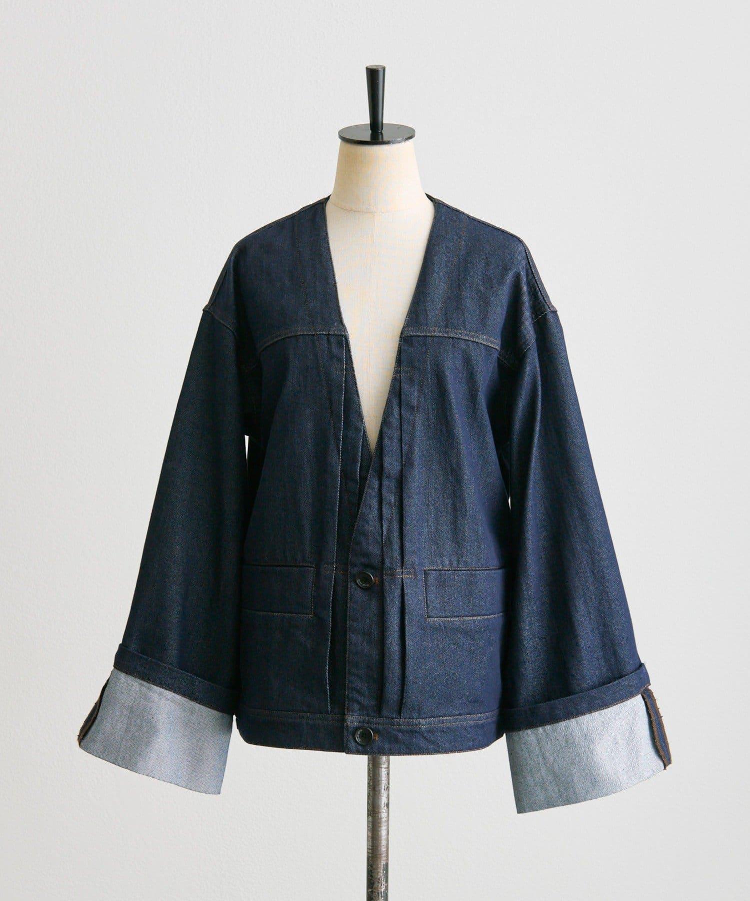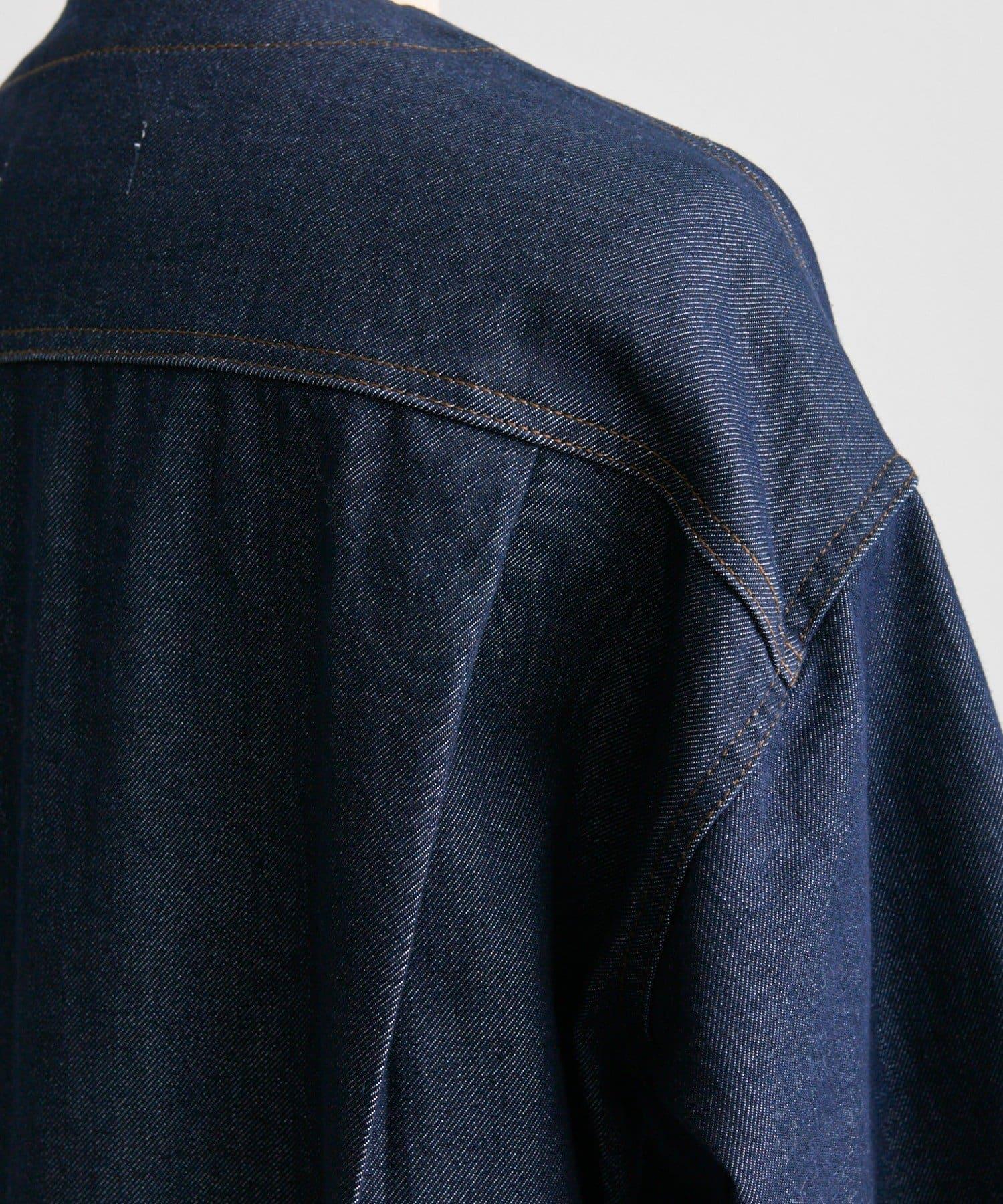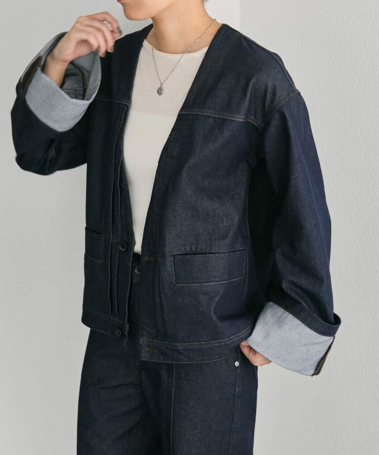 牛仔夾克,中段飾有針釦,採用獨特的翻領設計。
