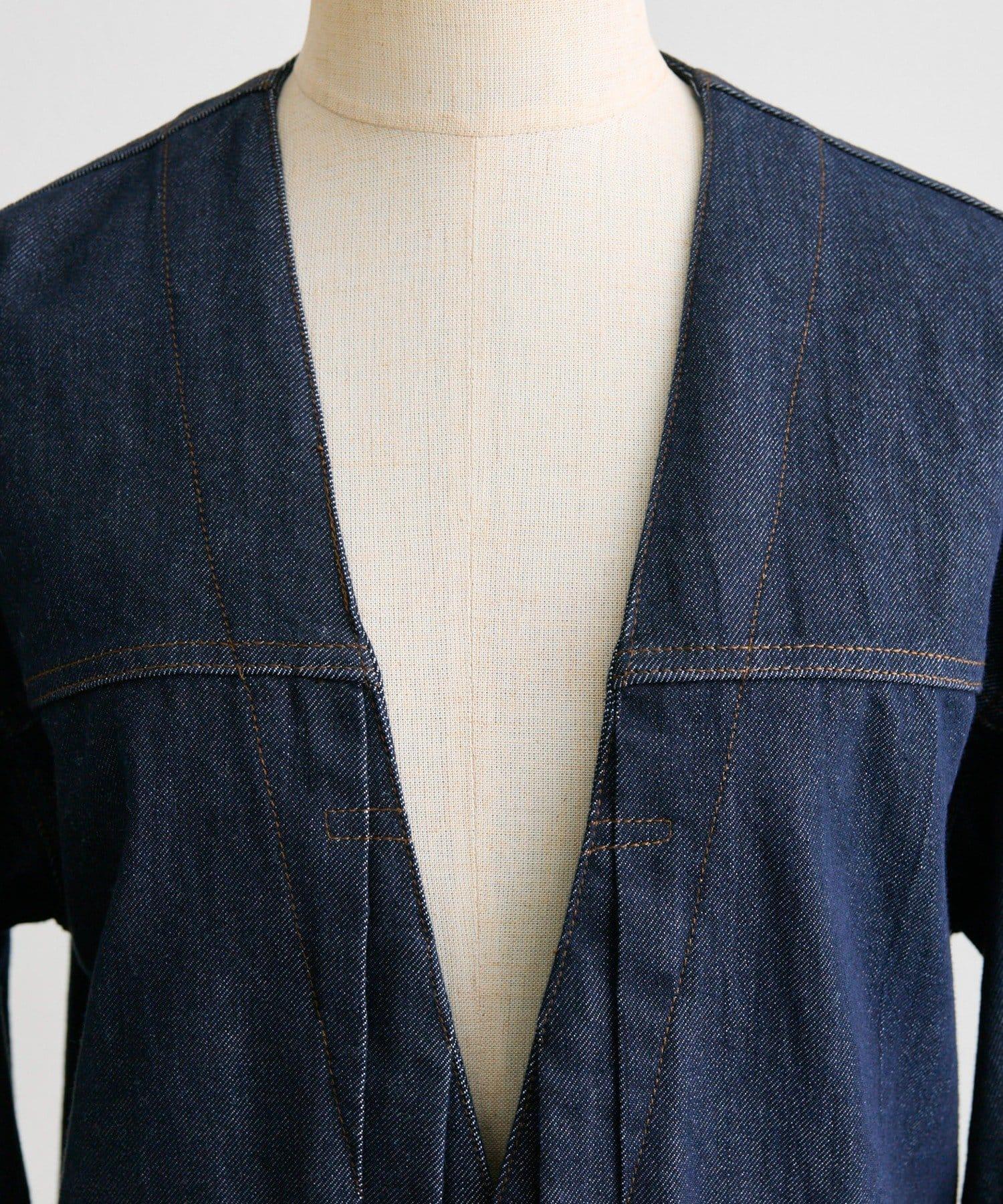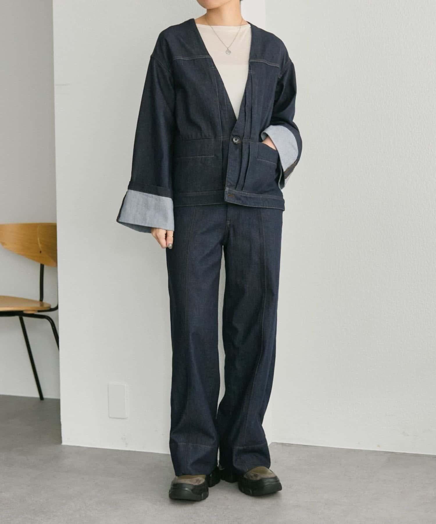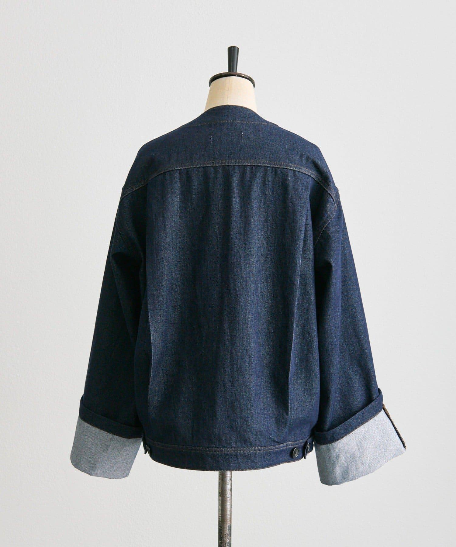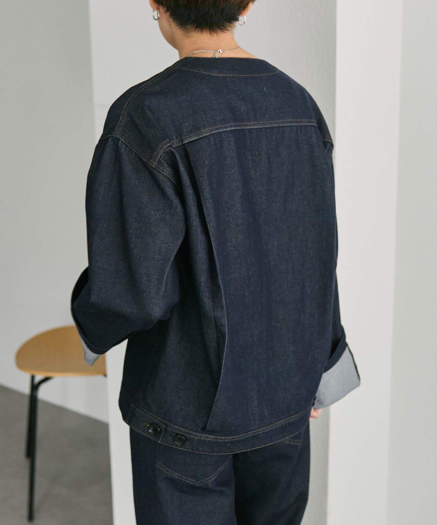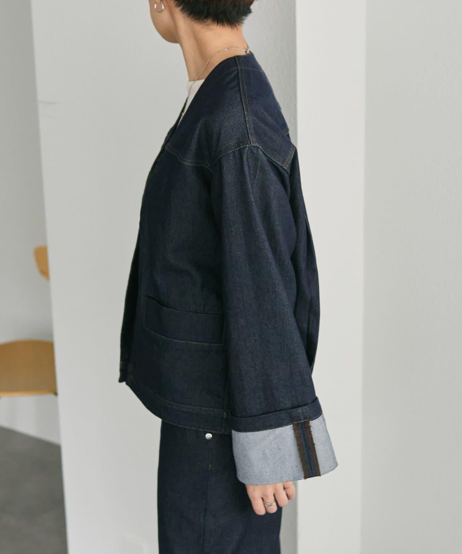牛仔夾克,中段飾有針釦,採用獨特的翻領設計。