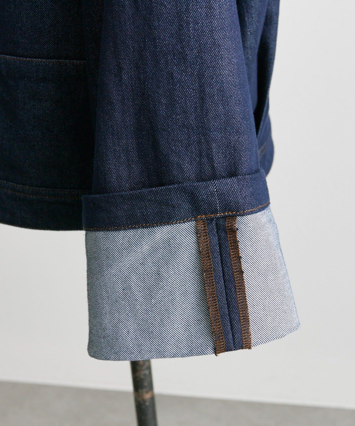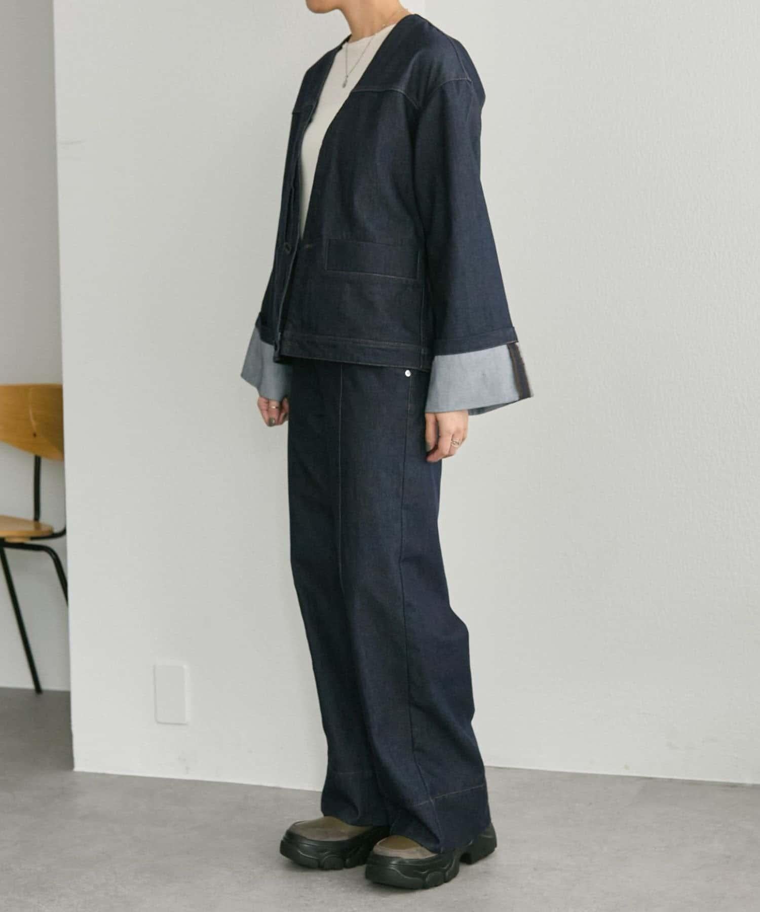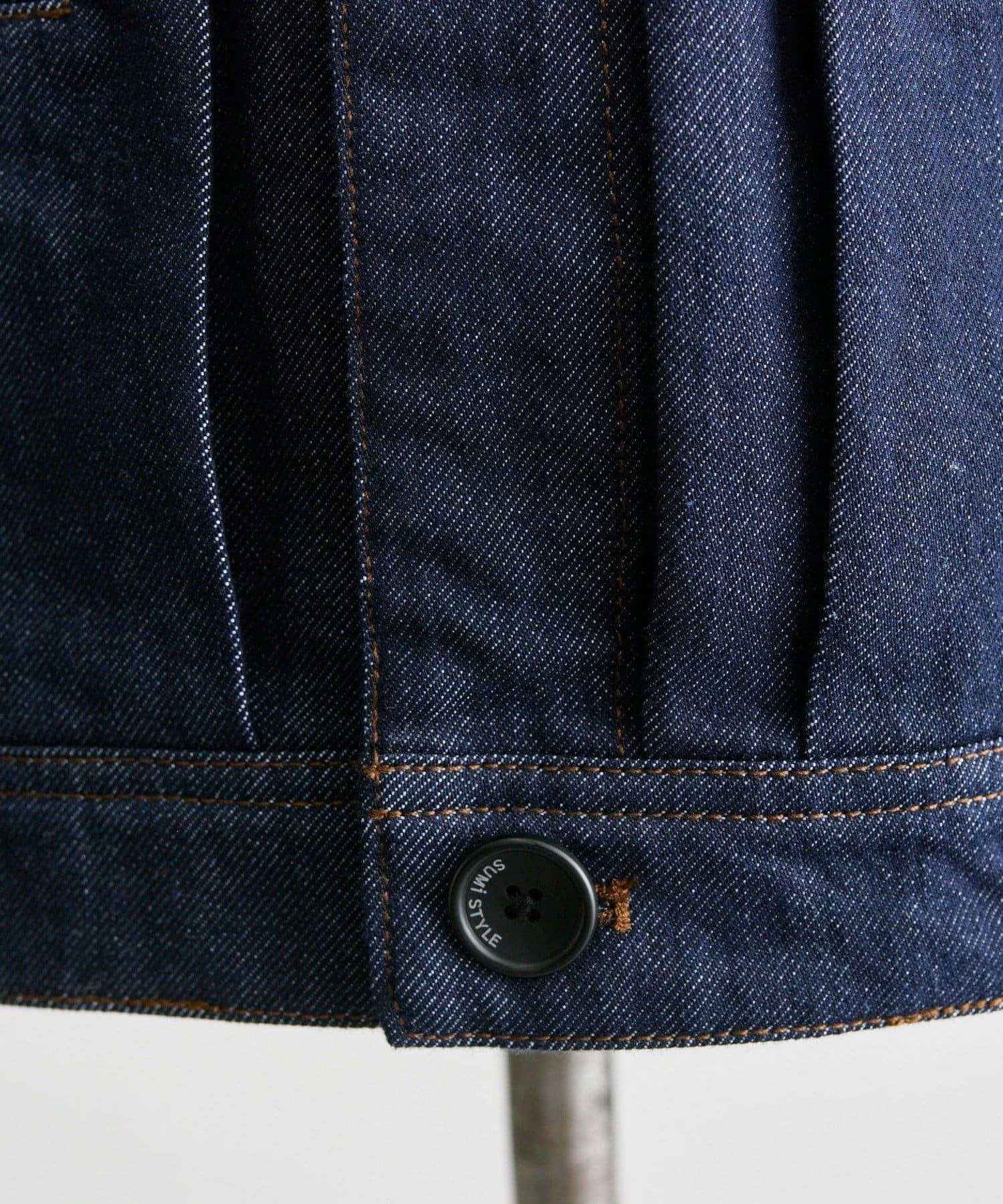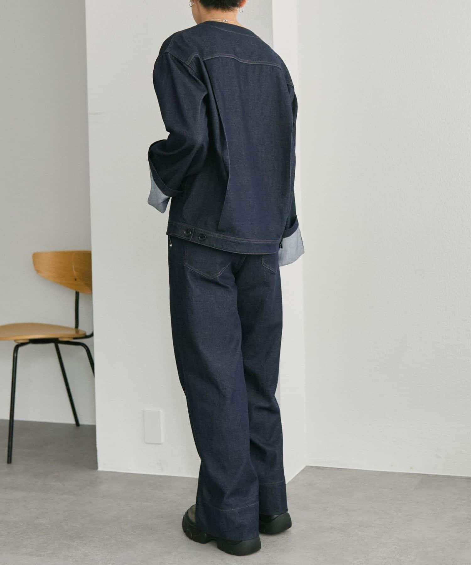 牛仔夾克,中段飾有針釦,採用獨特的翻領設計。