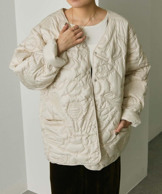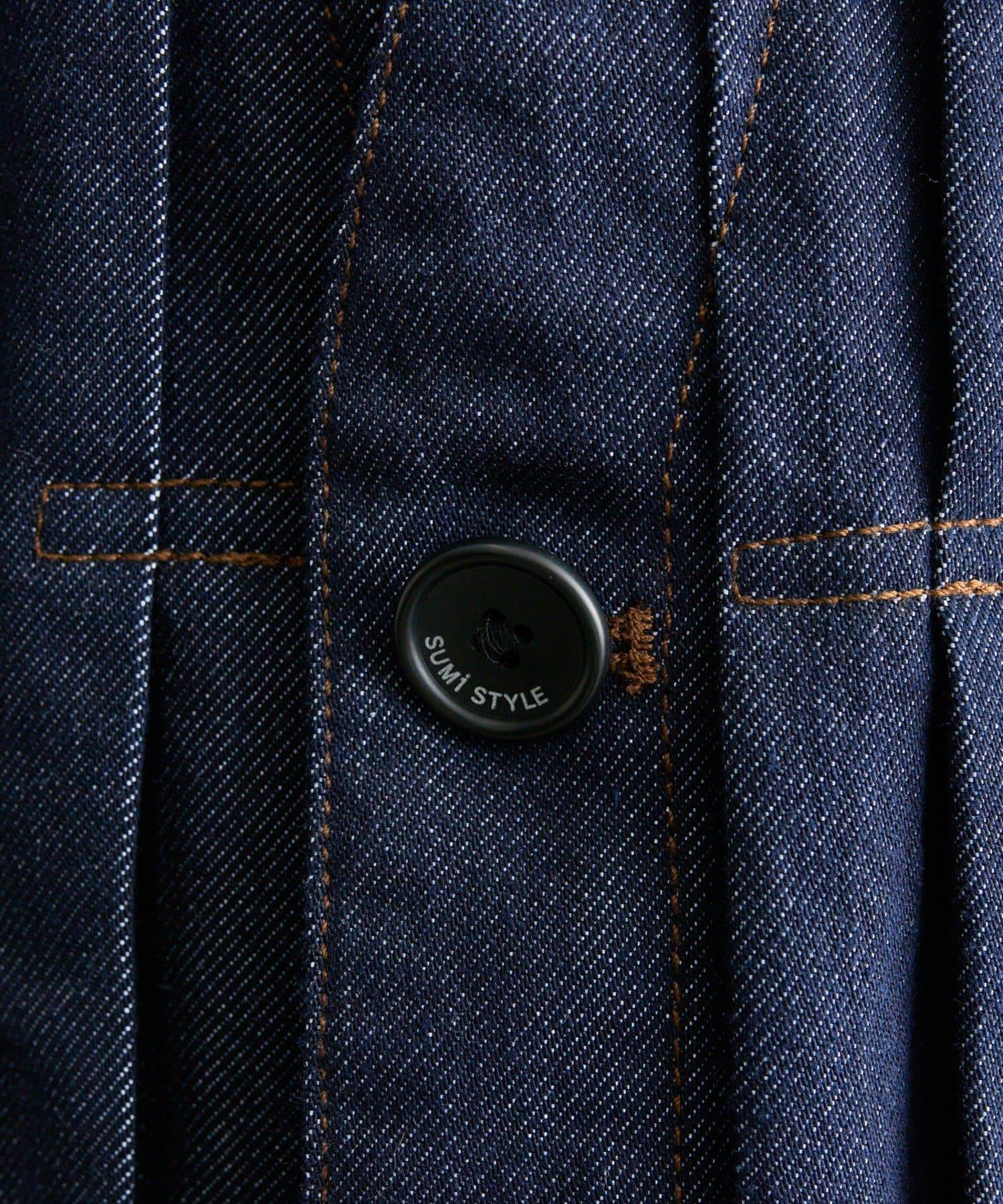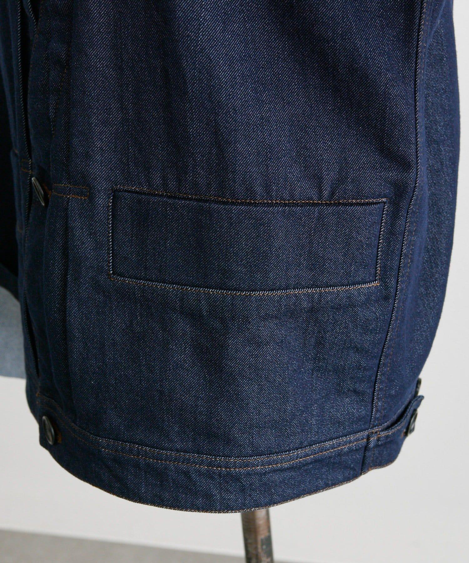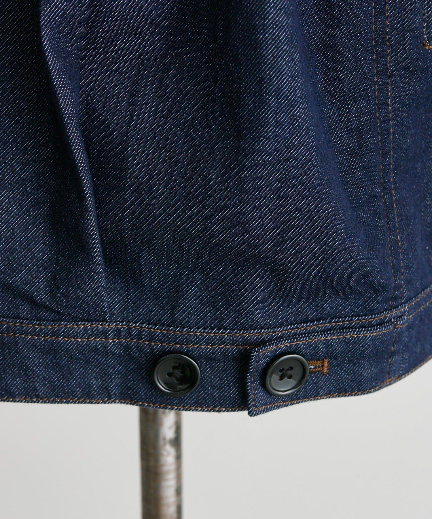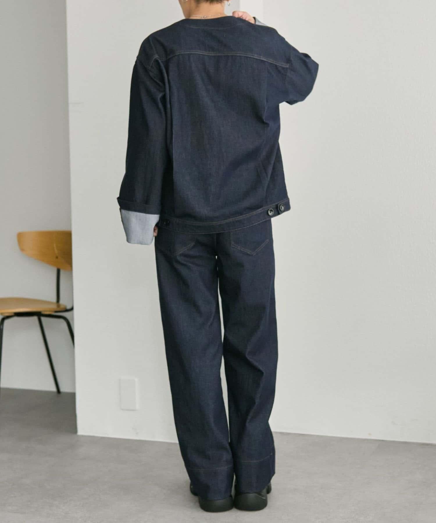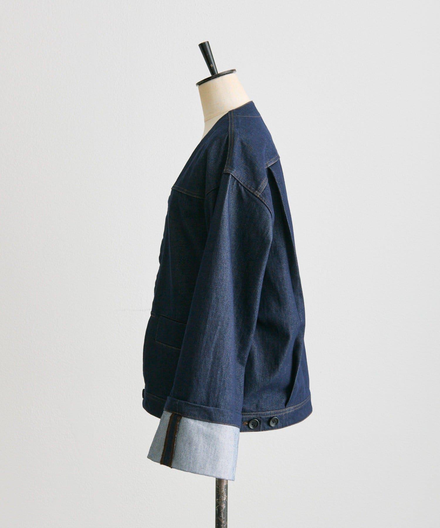 牛仔夾克,中段飾有針釦,採用獨特的翻領設計。