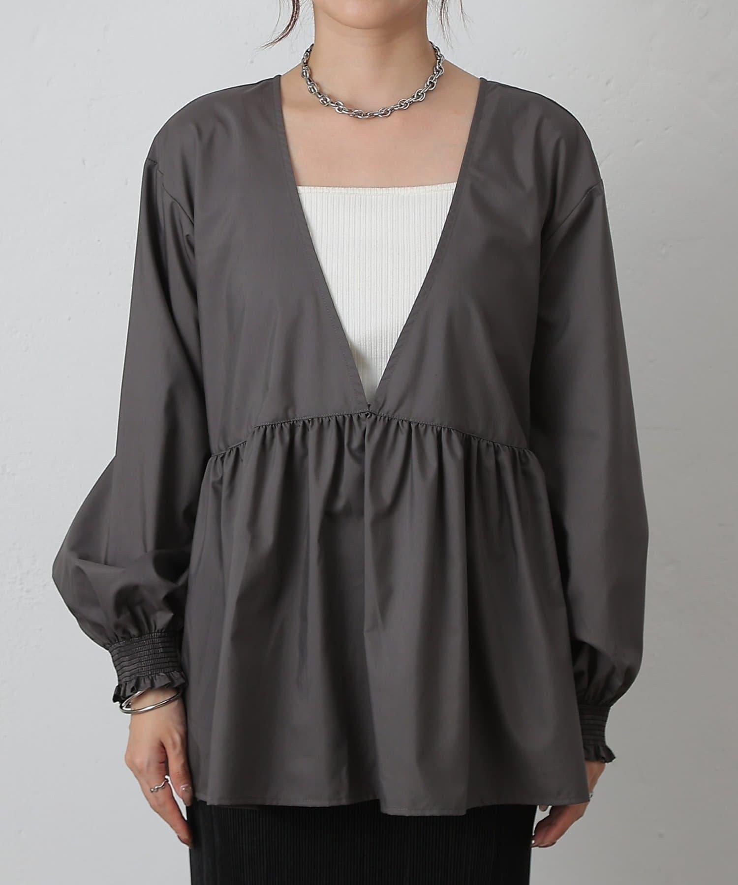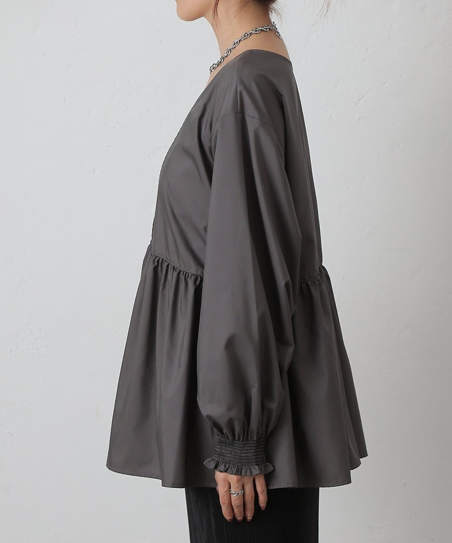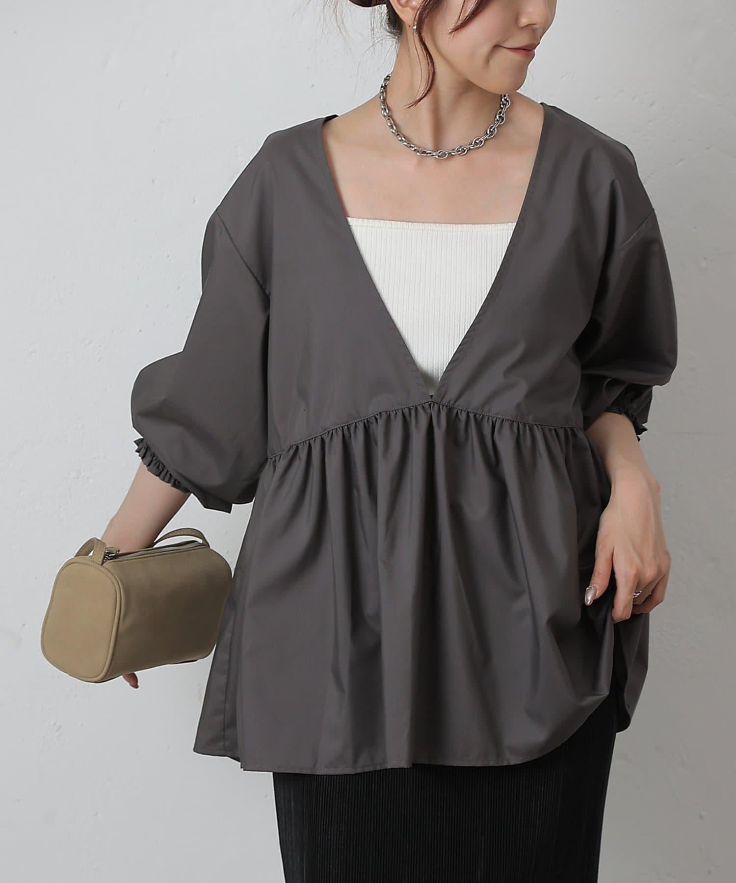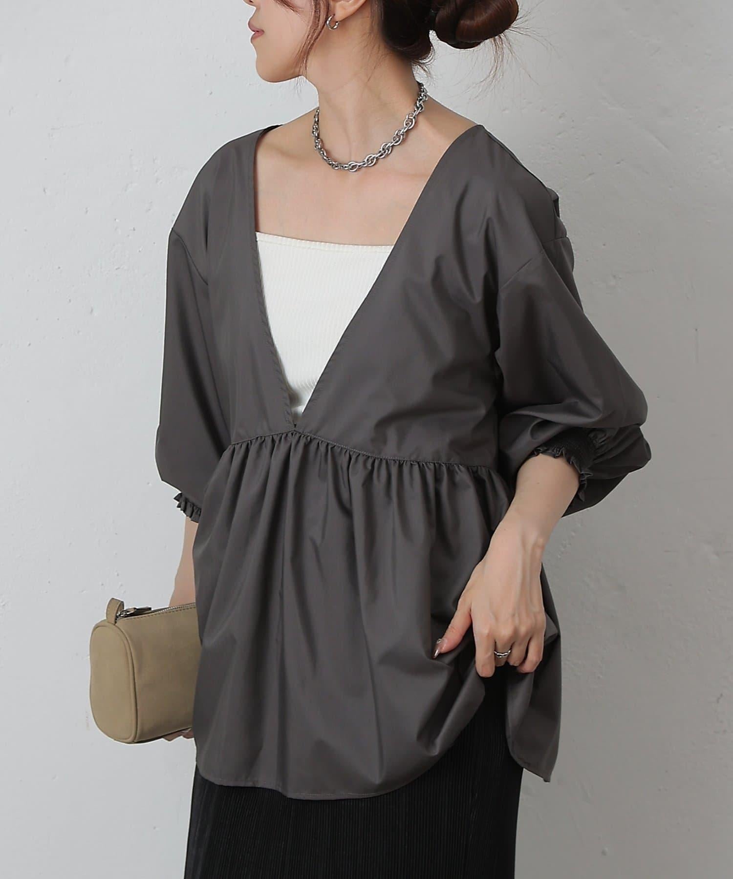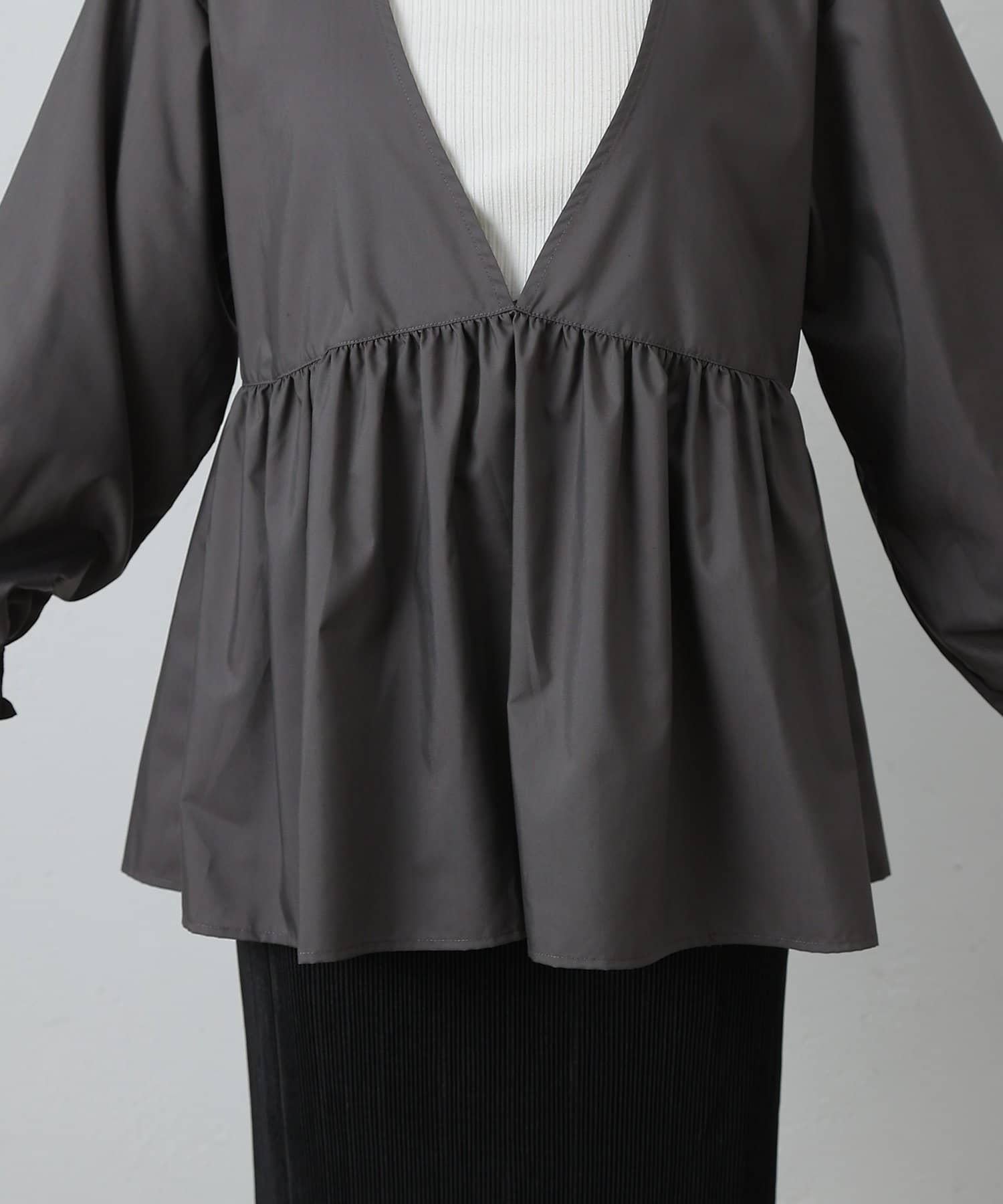 這款上衣採用深 V 領設計,使臉部輪廓顯得乾淨利落,腰部的蓬蓬裙設計營造出女性利落的輪廓。