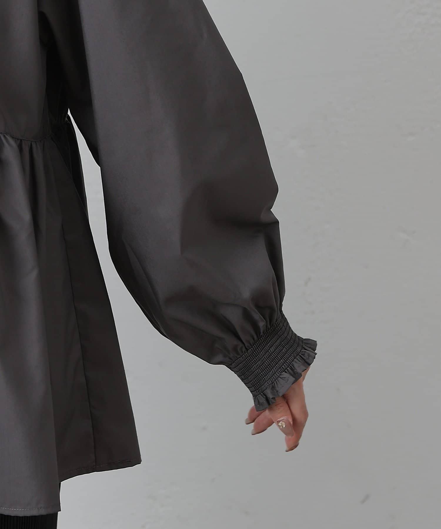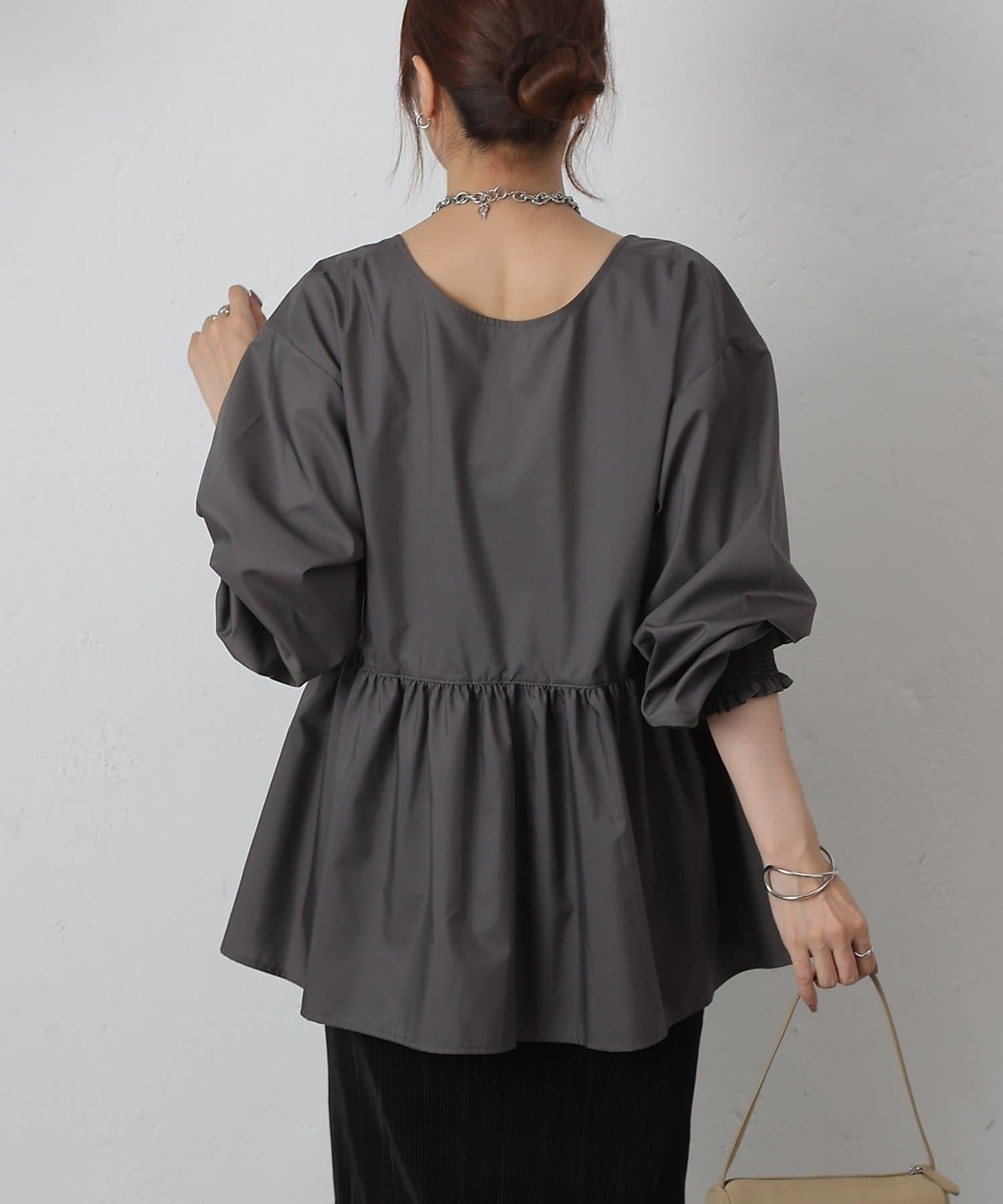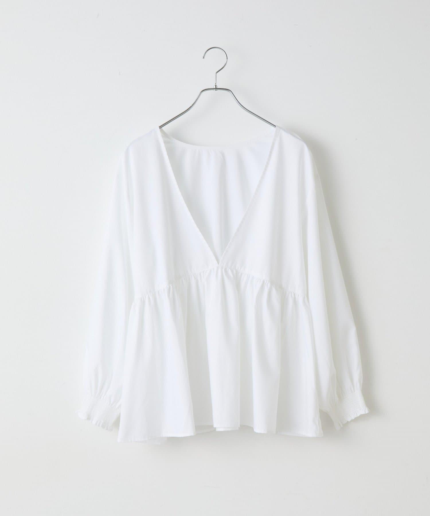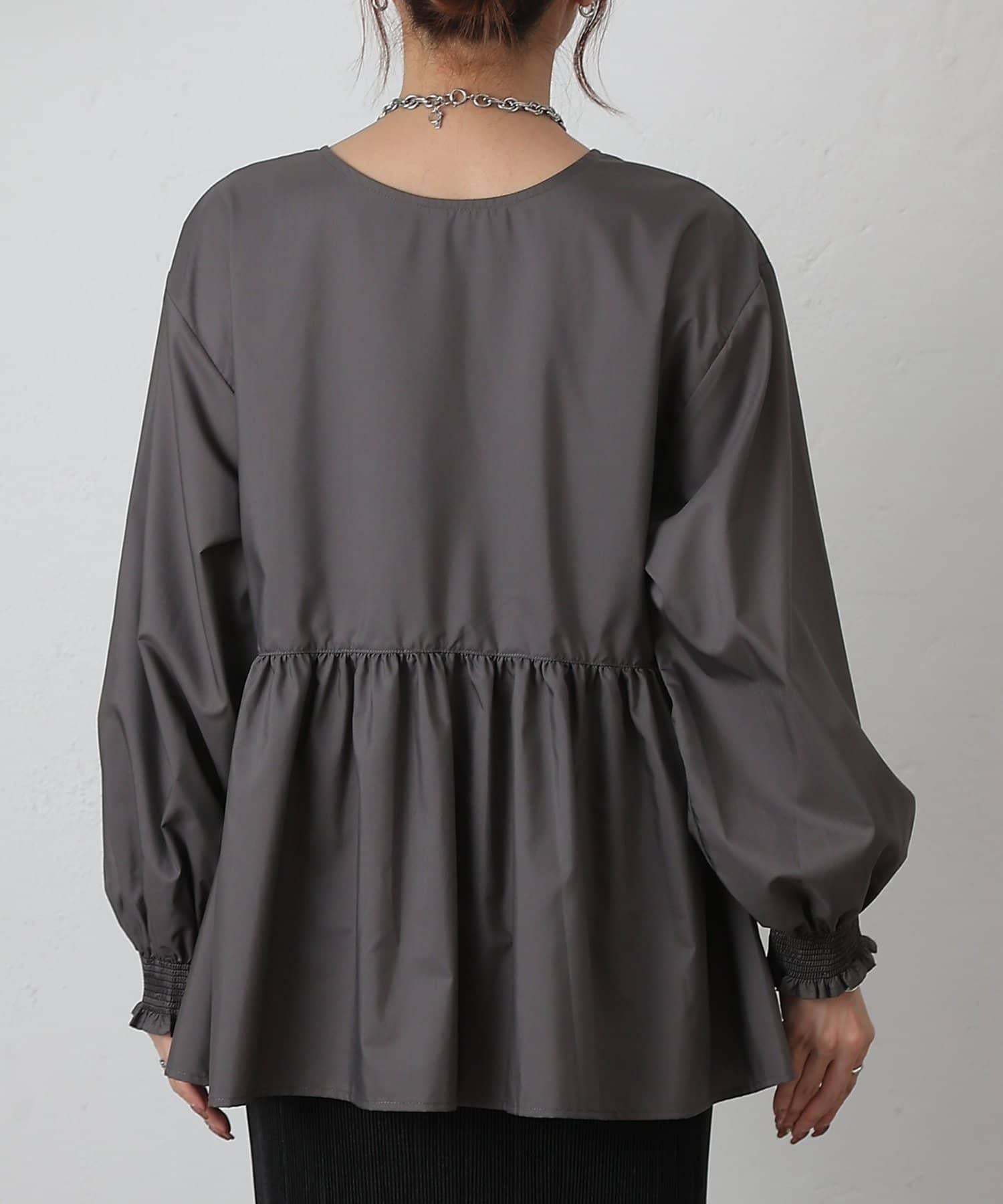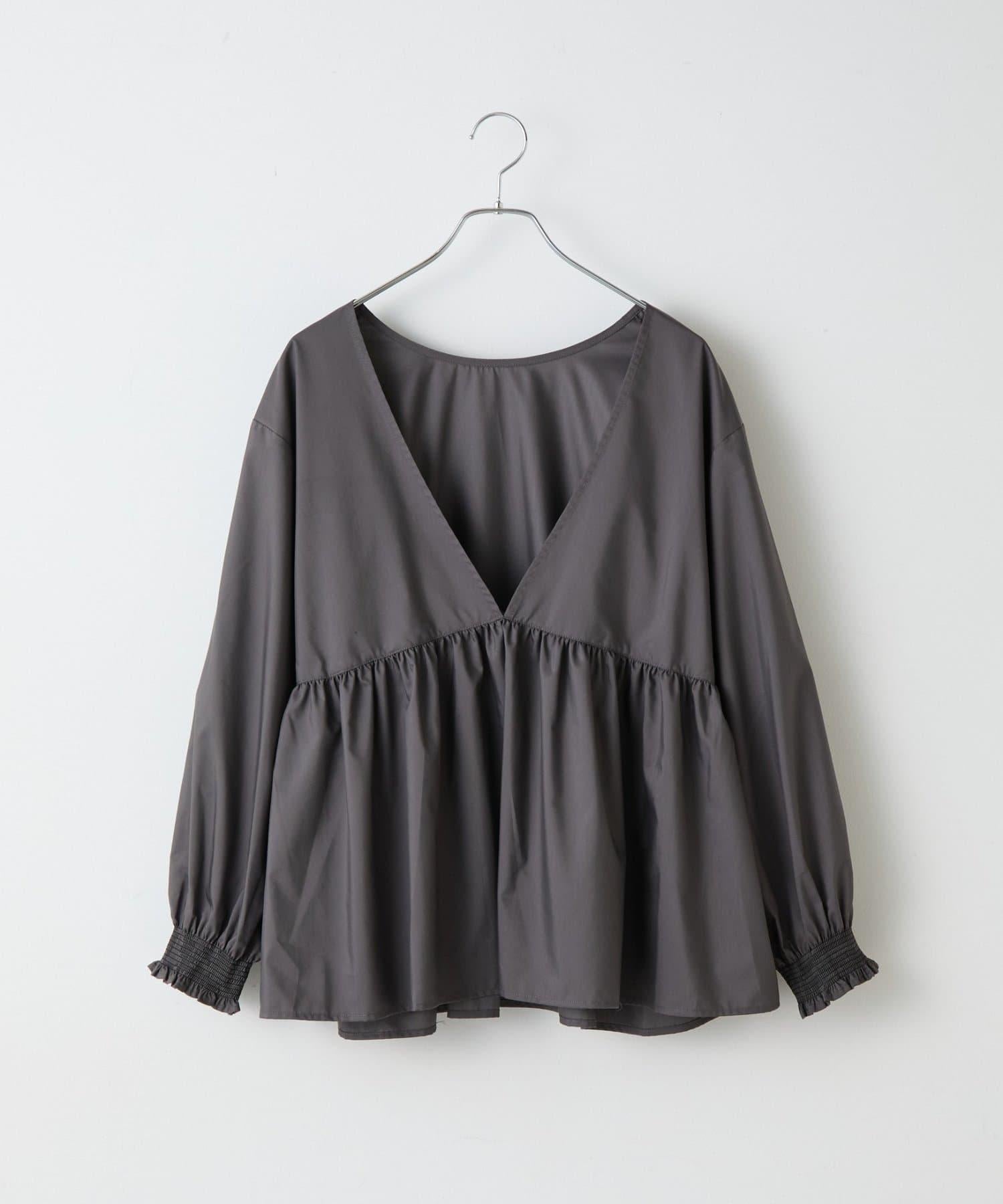 這款上衣採用深 V 領設計,使臉部輪廓顯得乾淨利落,腰部的蓬蓬裙設計營造出女性利落的輪廓。