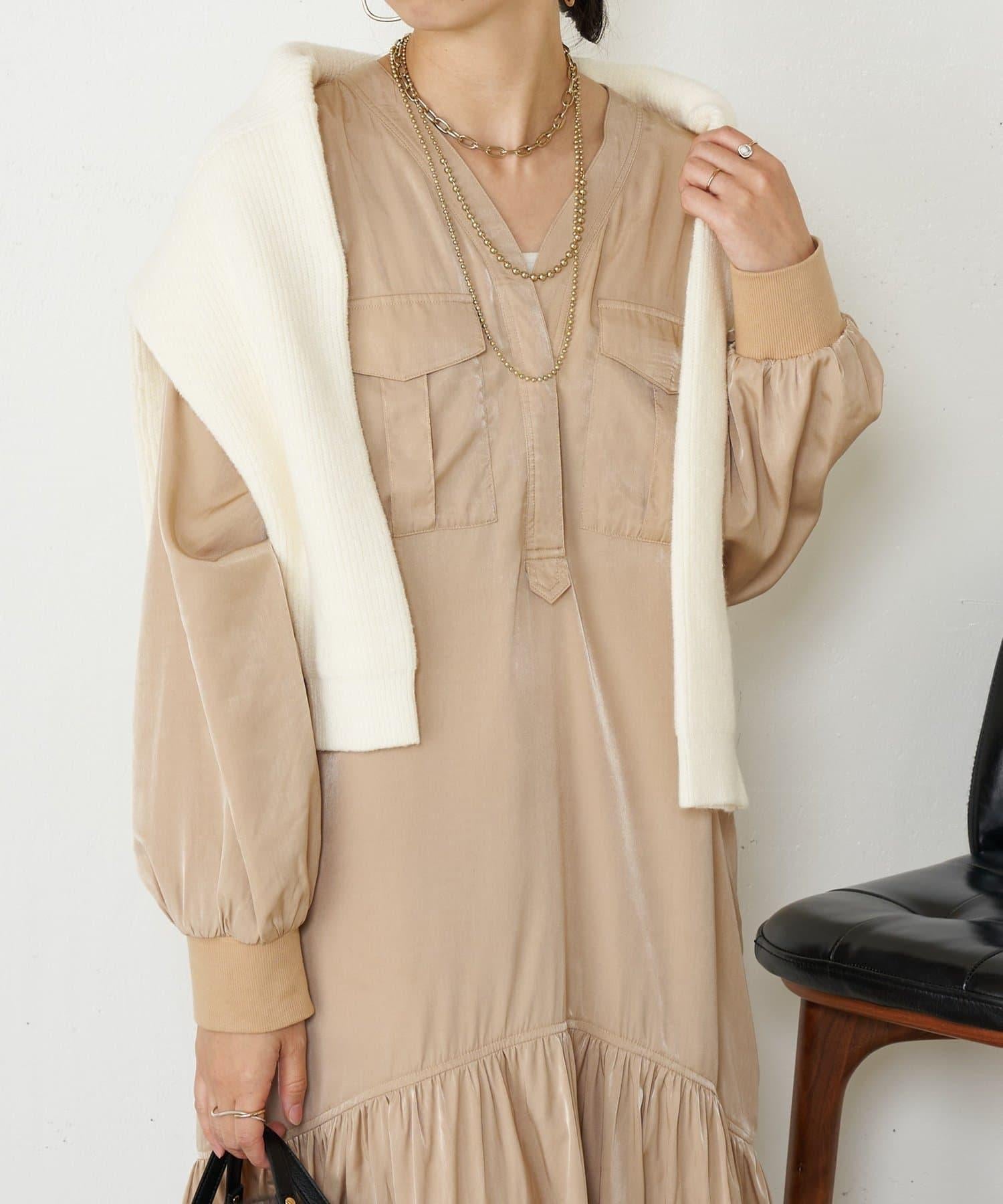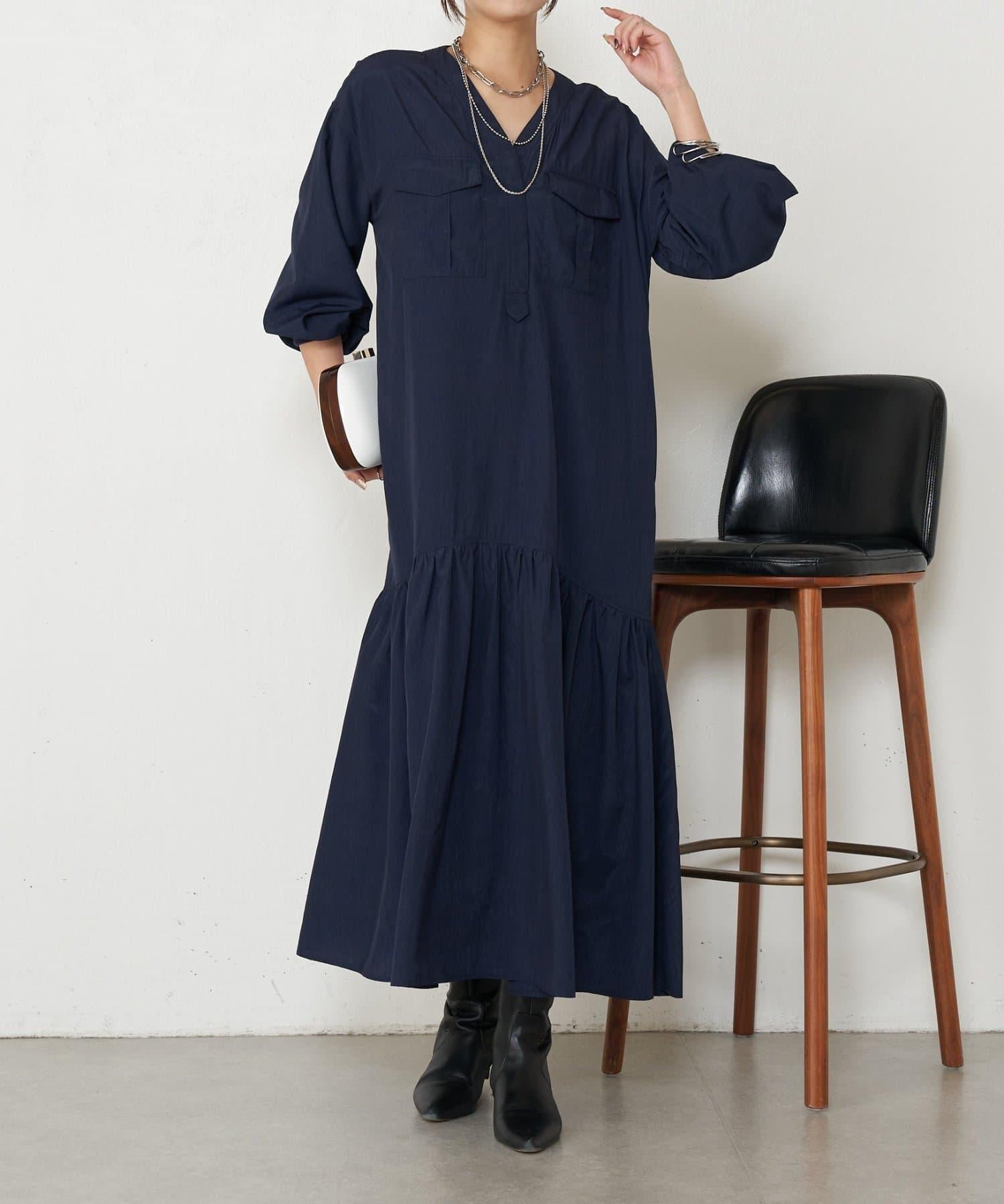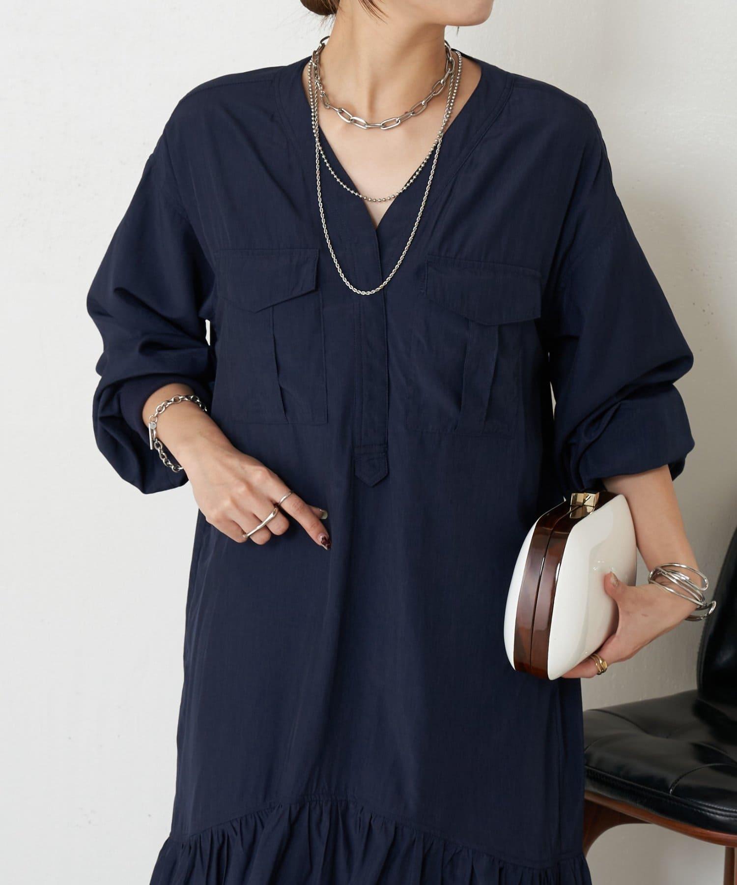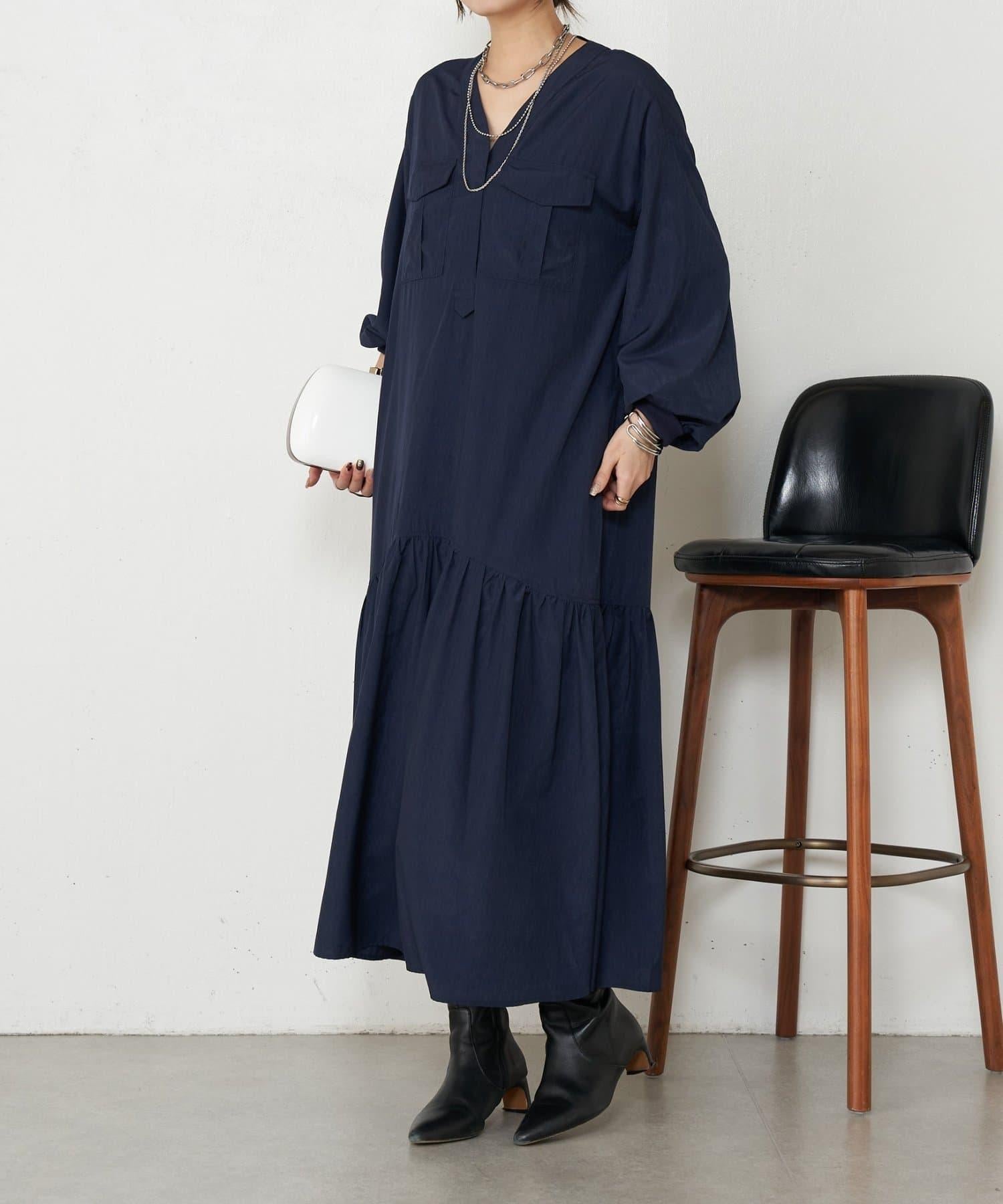 這款連衣裙採用 V 領設計,在臉部周圍褶皺,營造出女性化的輪廓。