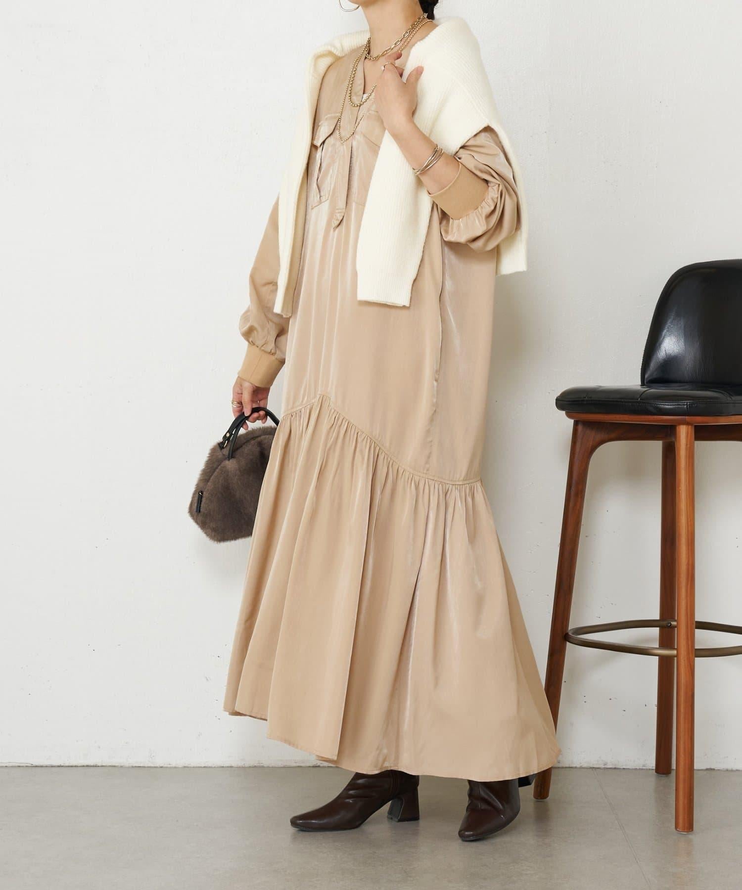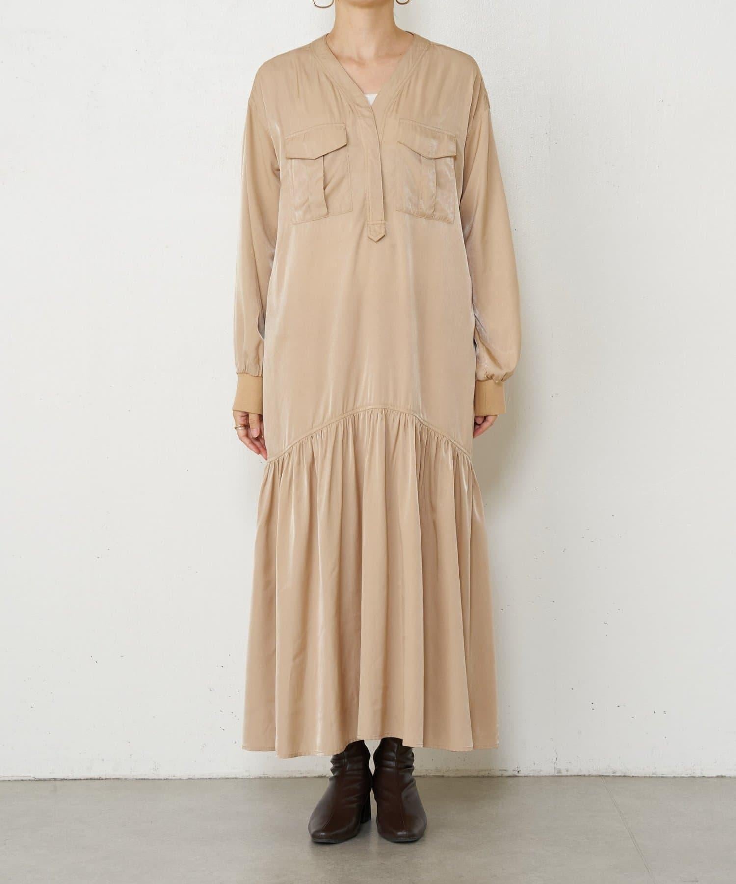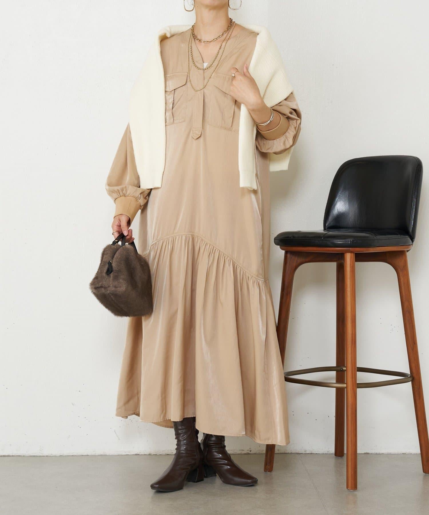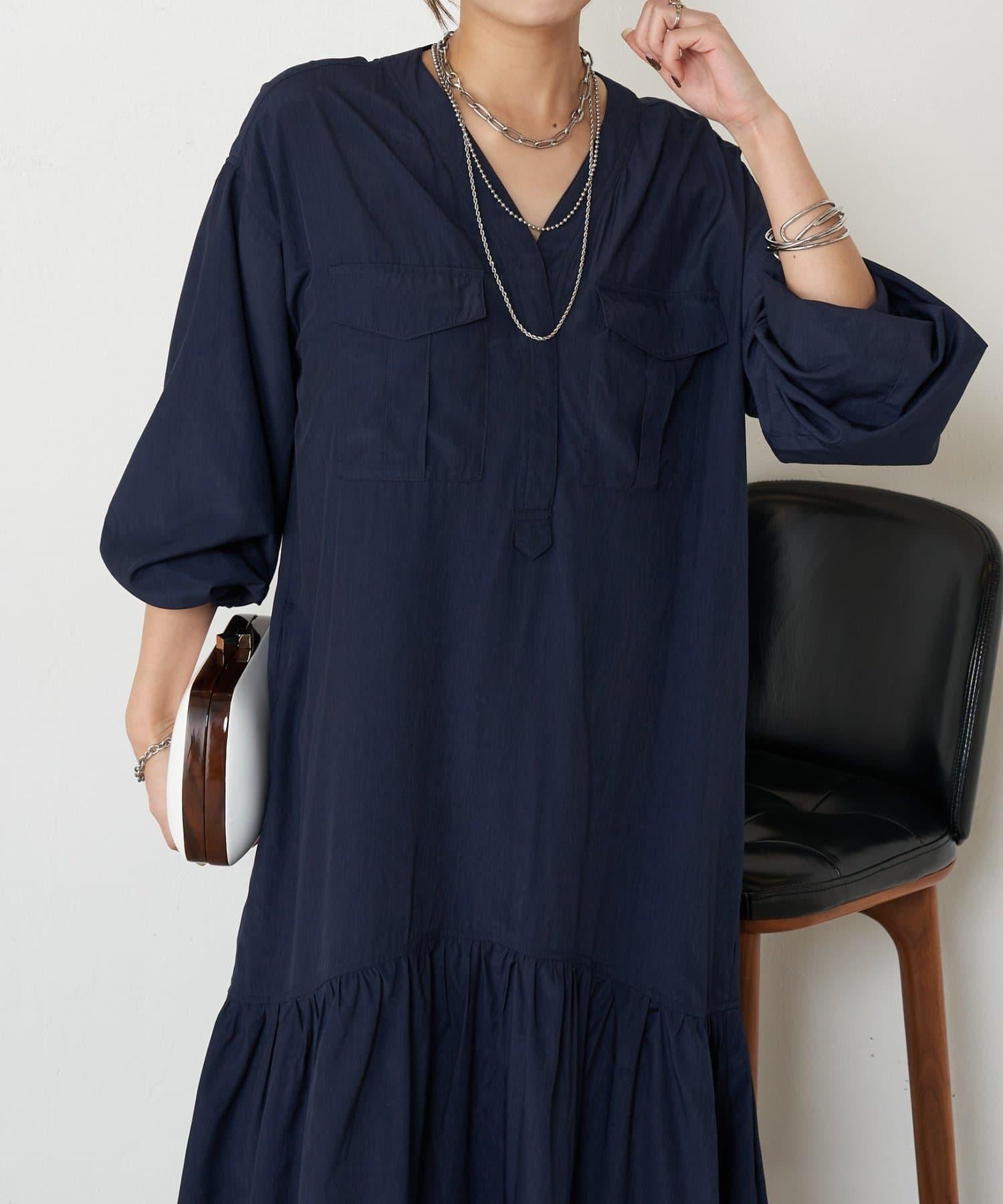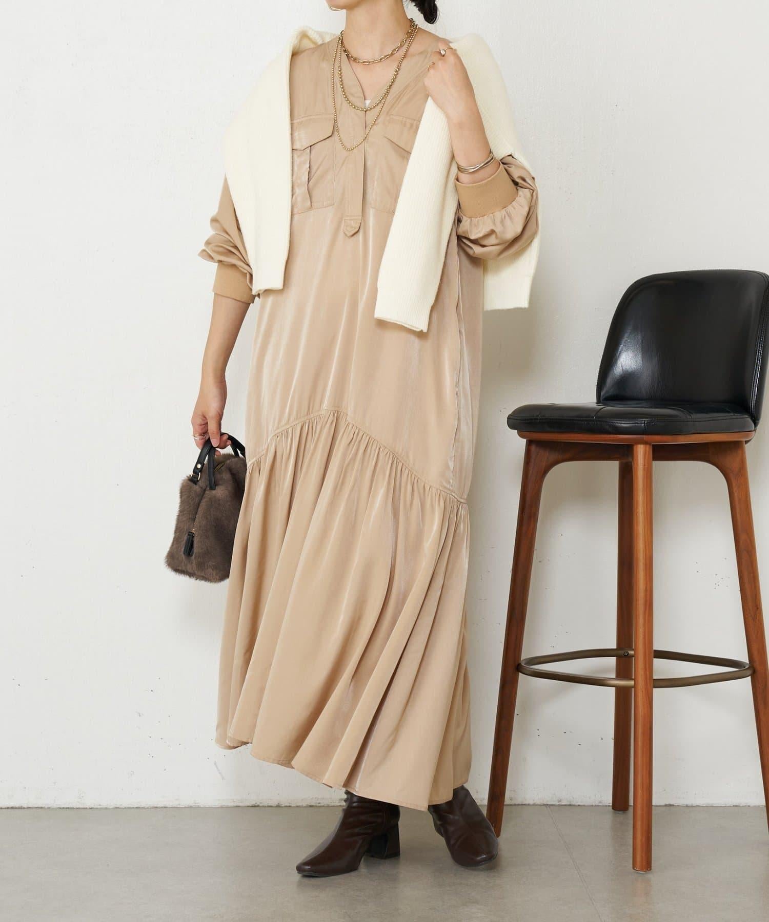 這款連衣裙採用 V 領設計,在臉部周圍褶皺,營造出女性化的輪廓。