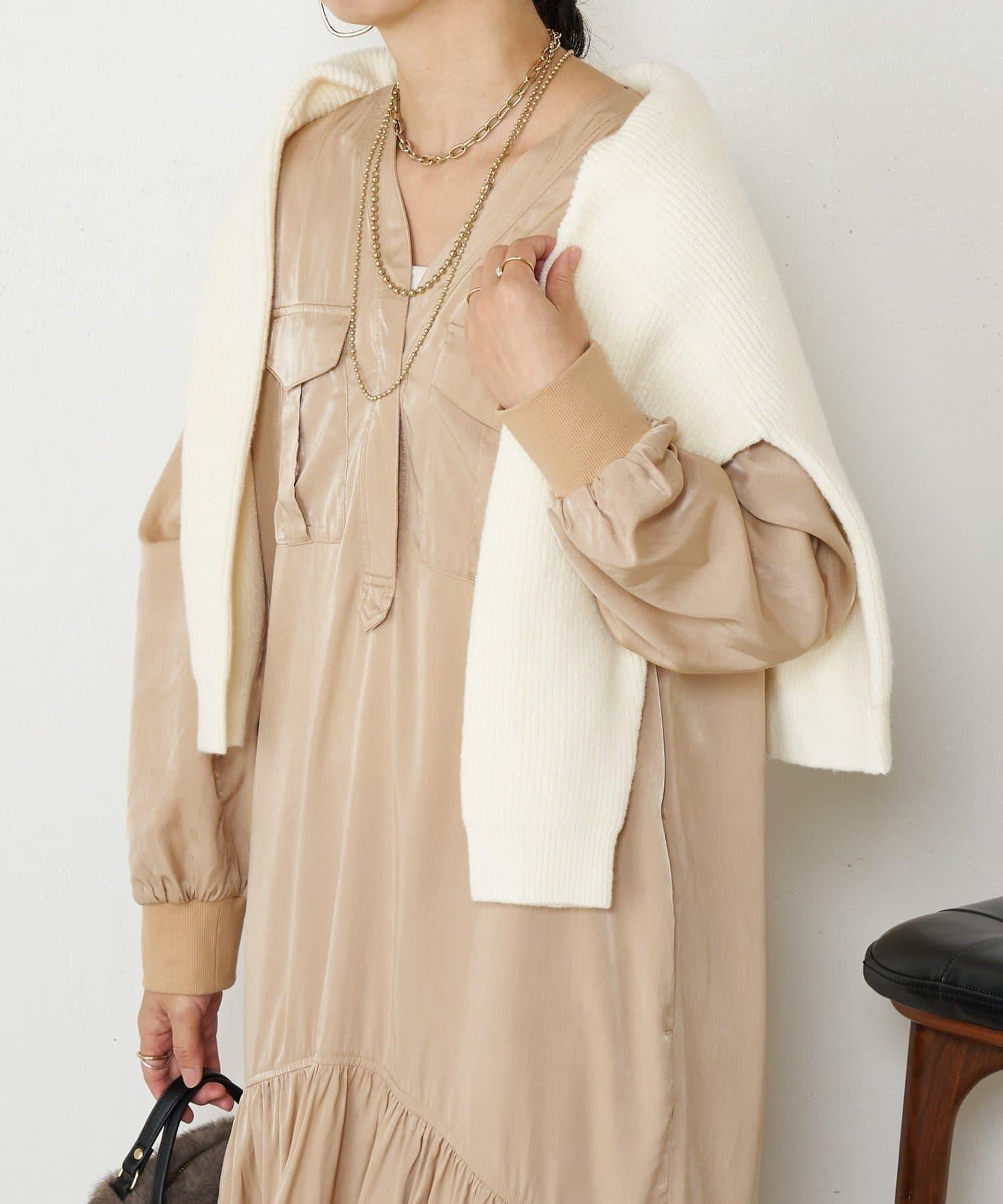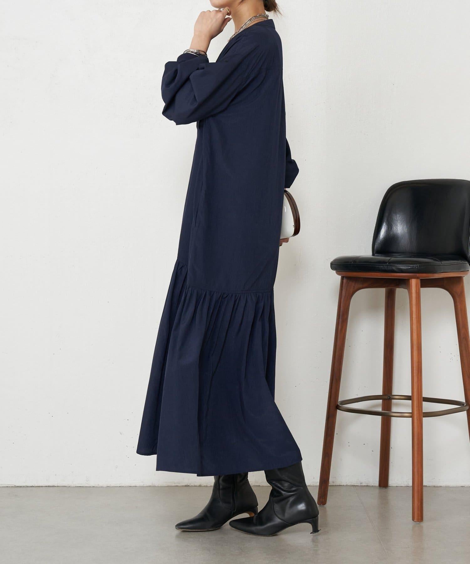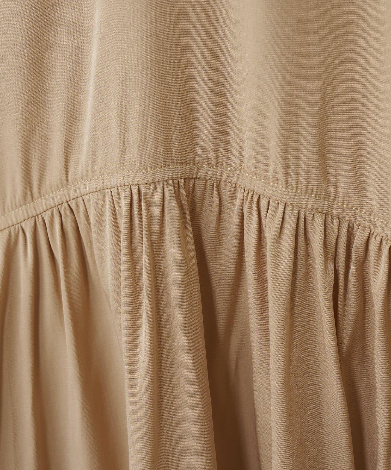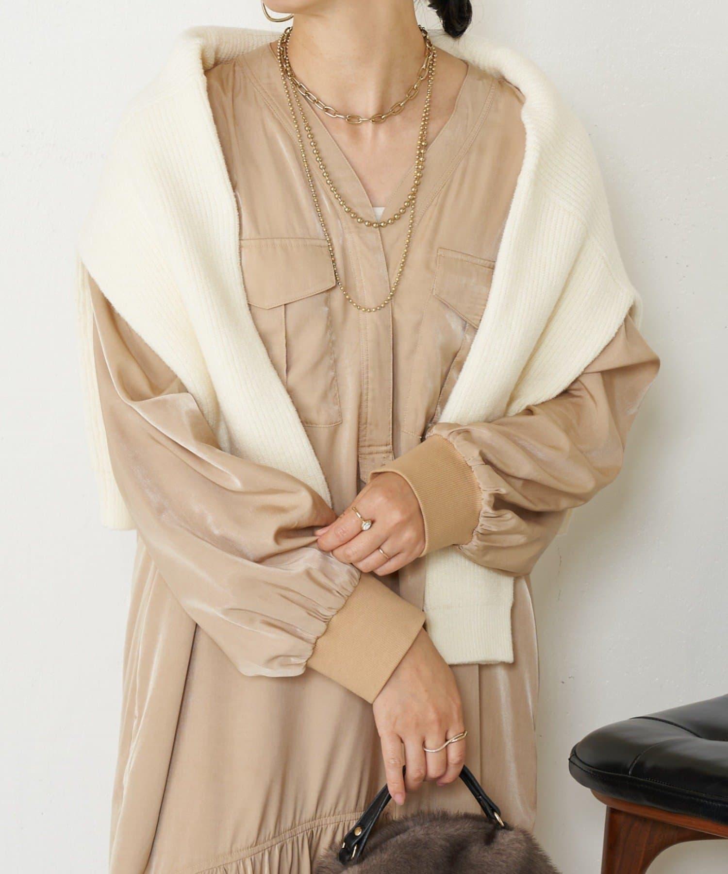 這款連衣裙採用 V 領設計,在臉部周圍褶皺,營造出女性化的輪廓。