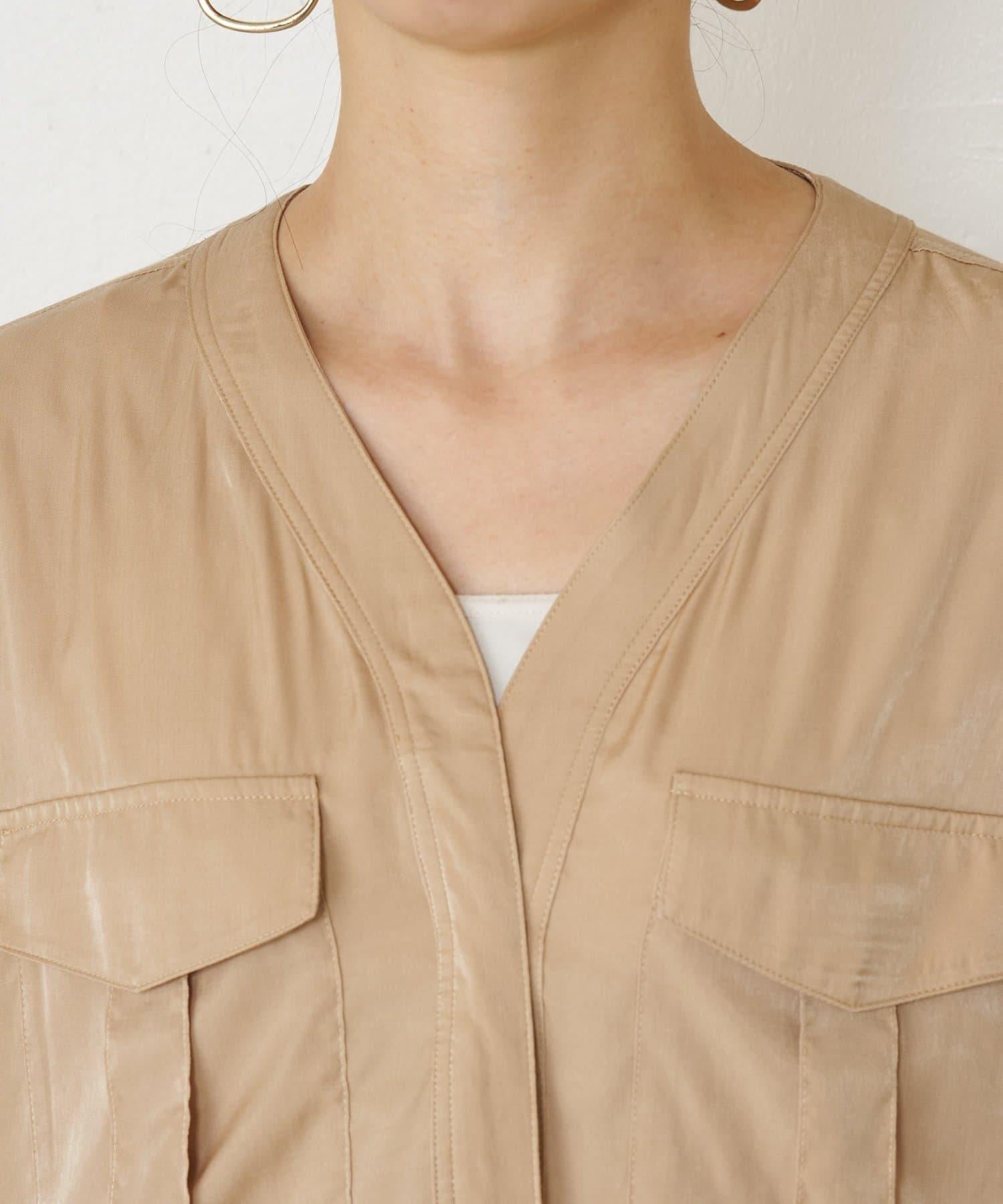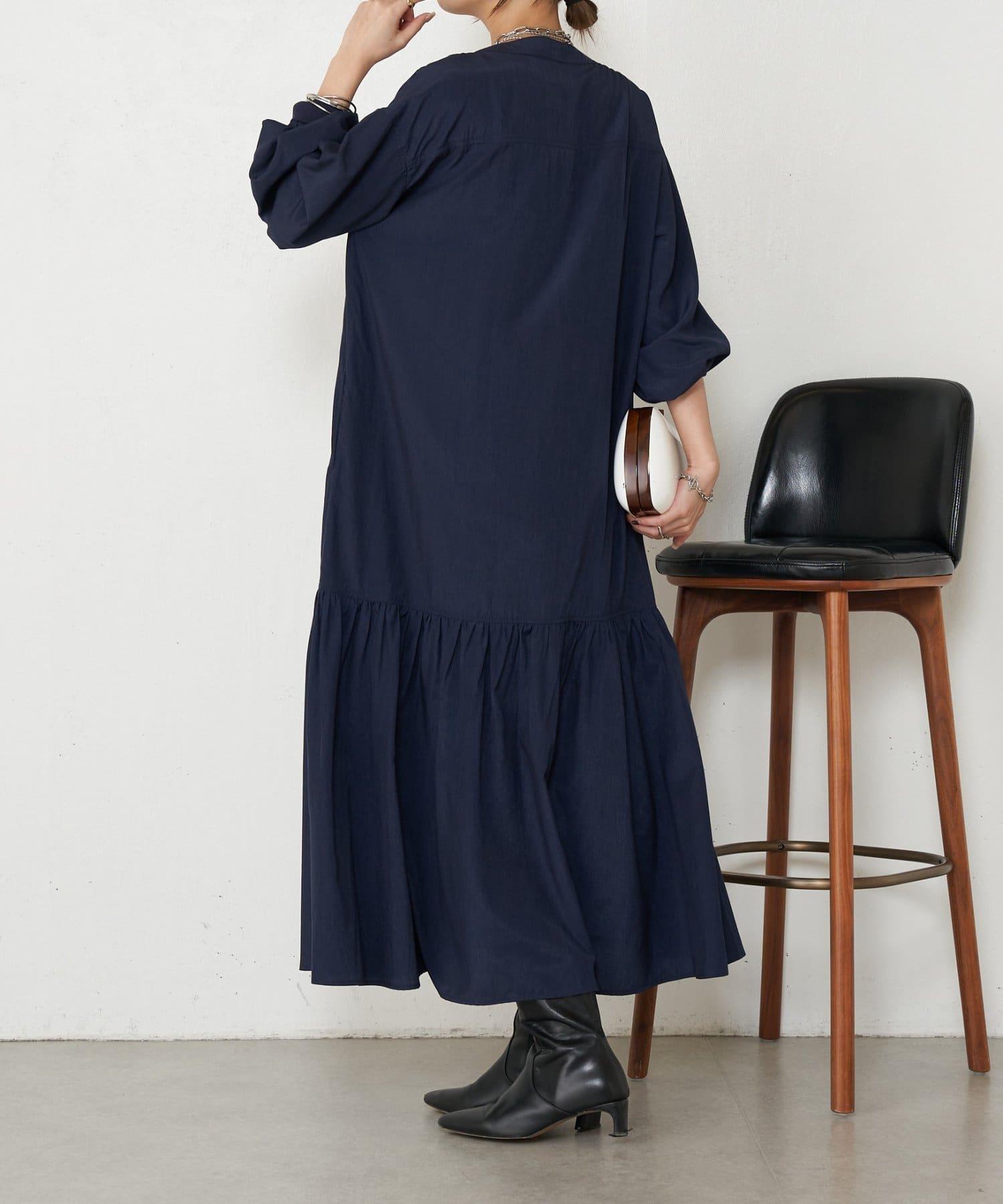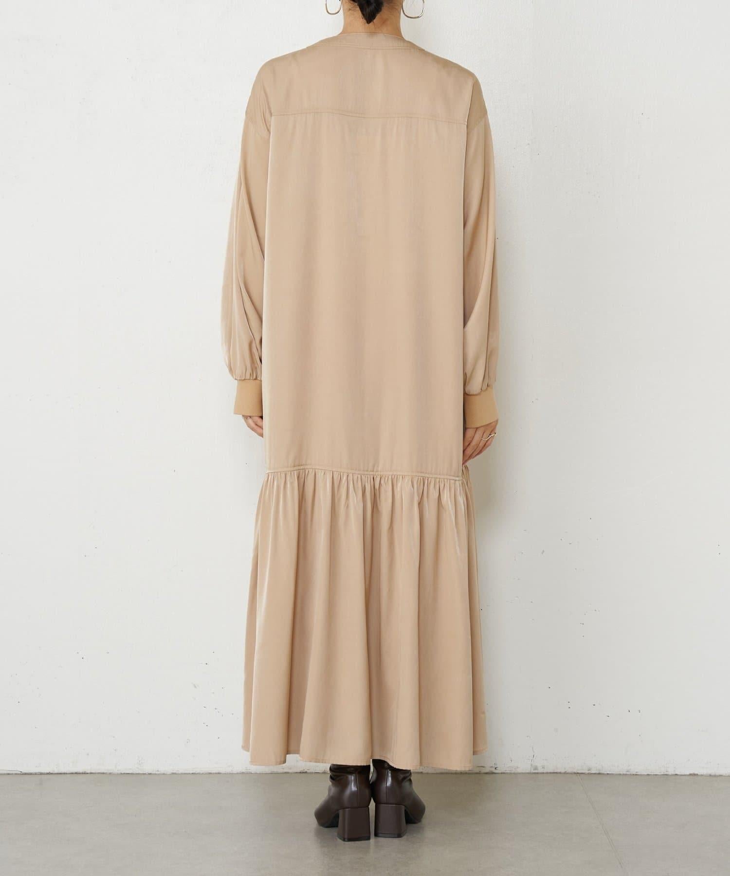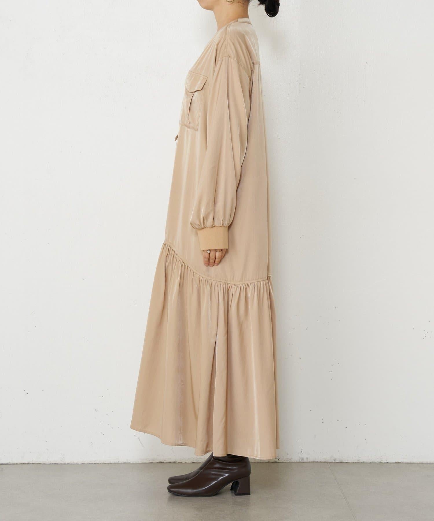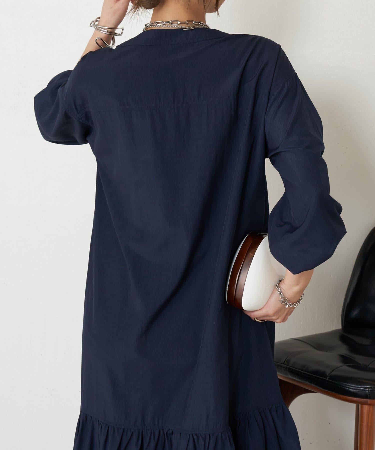 這款連衣裙採用 V 領設計,在臉部周圍褶皺,營造出女性化的輪廓。