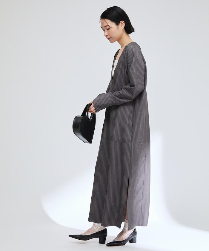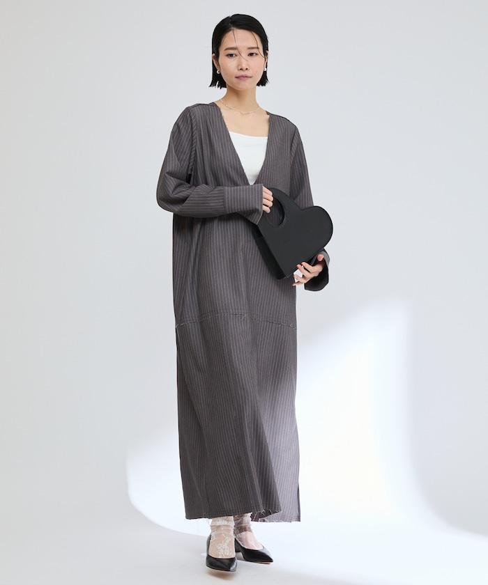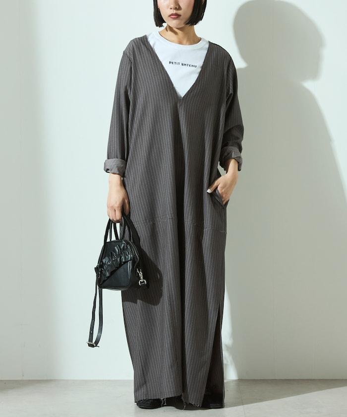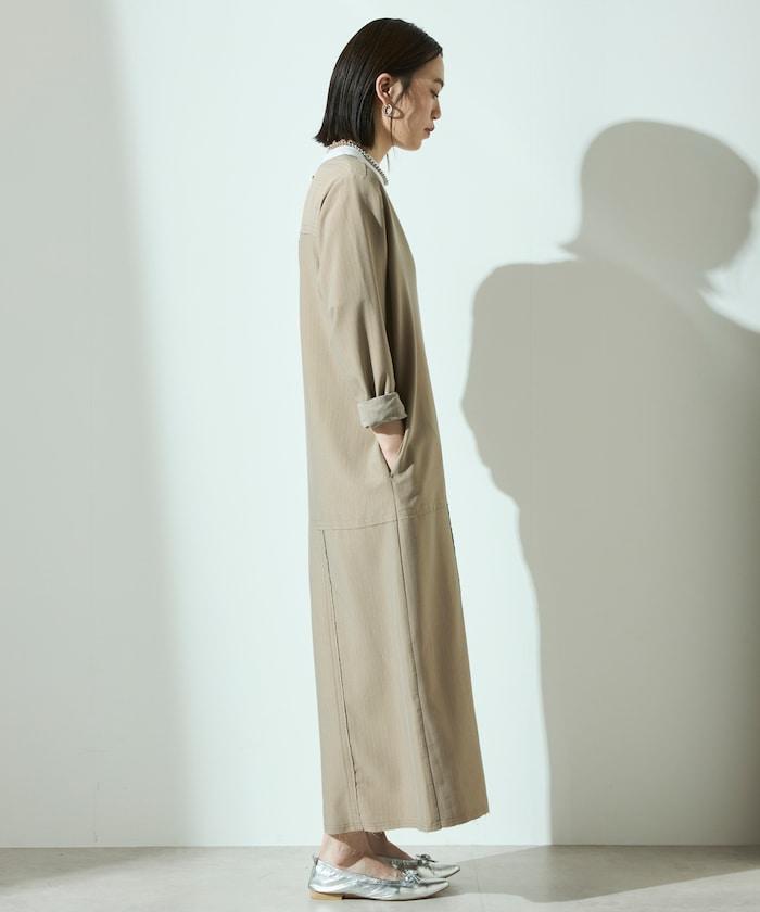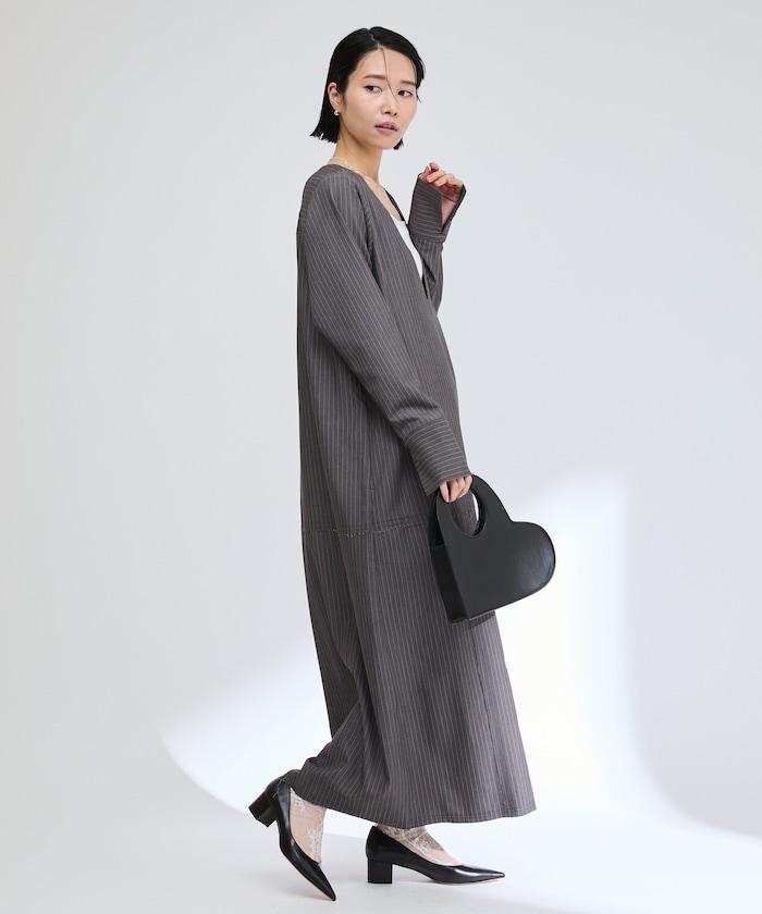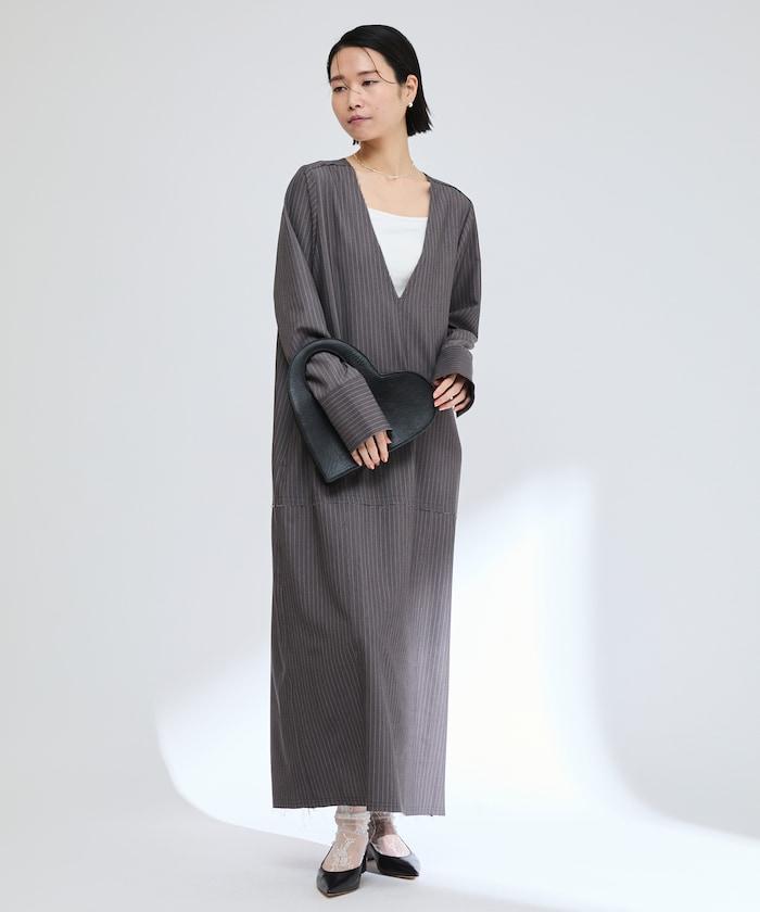 這款連衣裙採用寬大的 V 領設計,廓形慵懶,左下襬的長開衩設計盡顯淑女風範。