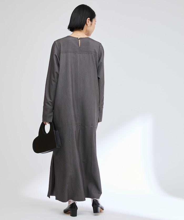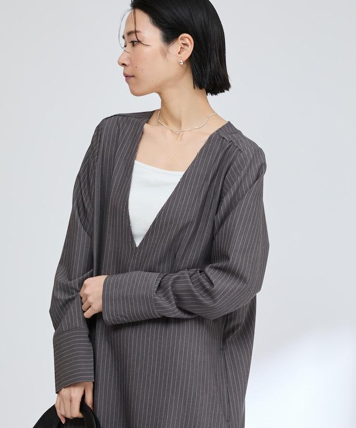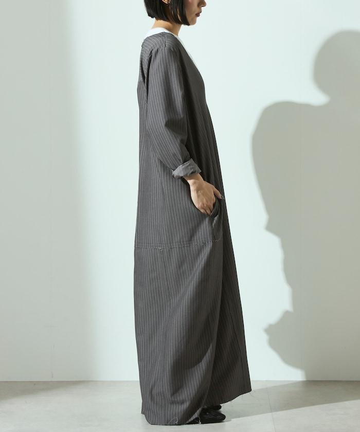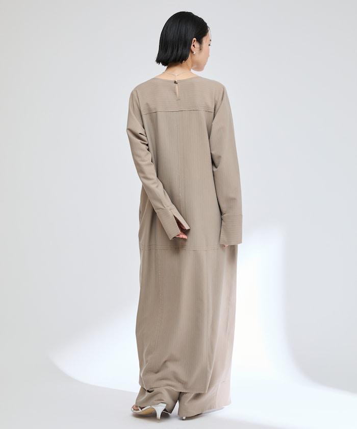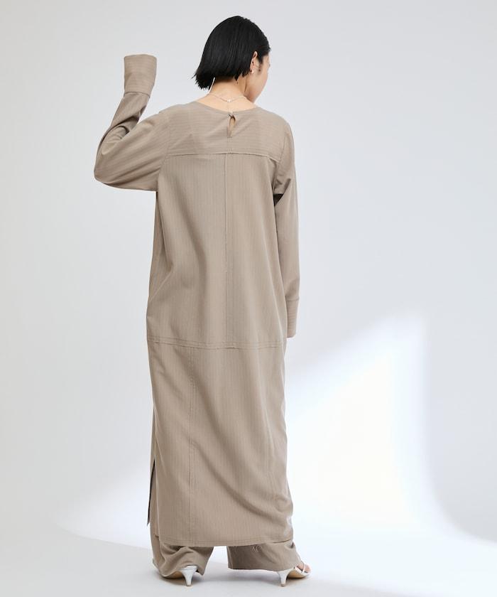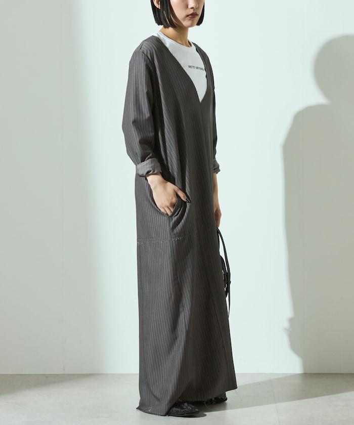 這款連衣裙採用寬大的 V 領設計,廓形慵懶,左下襬的長開衩設計盡顯淑女風範。