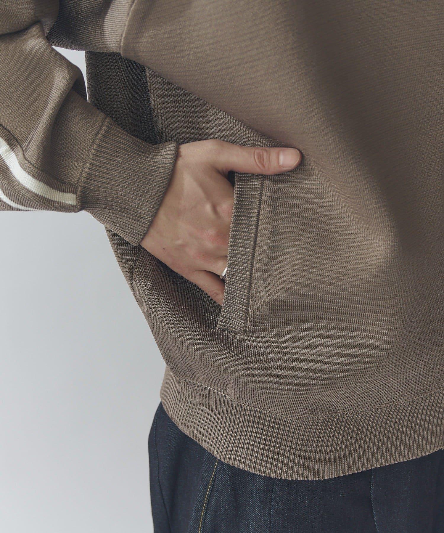 這是一款略微寬鬆的運動夾克,面料富有光澤,手感光滑。